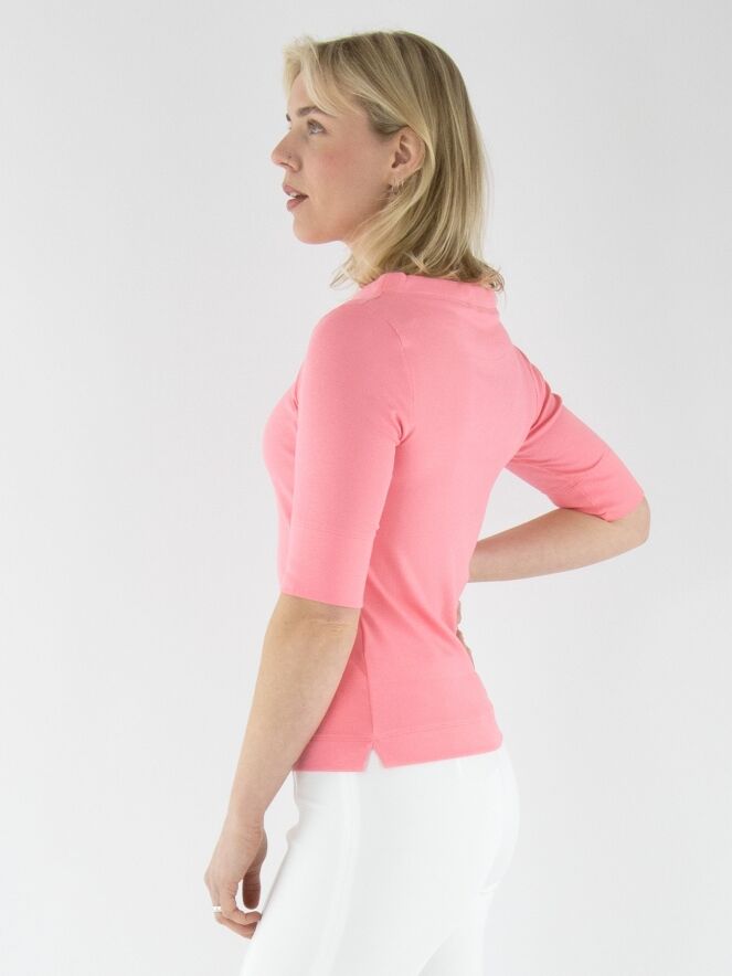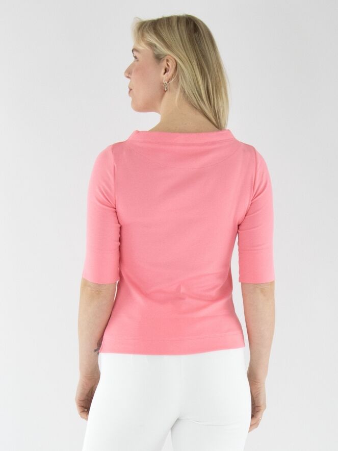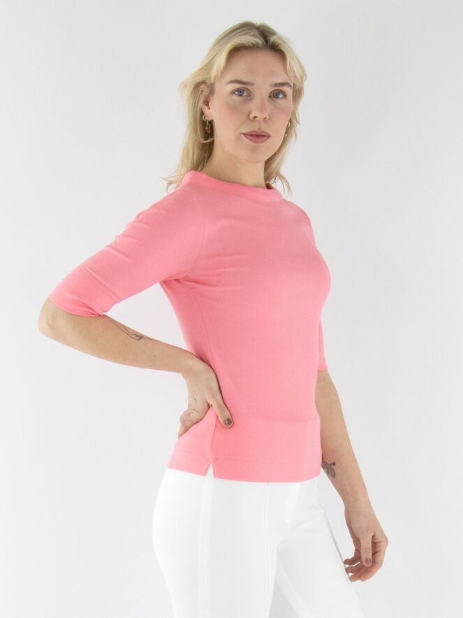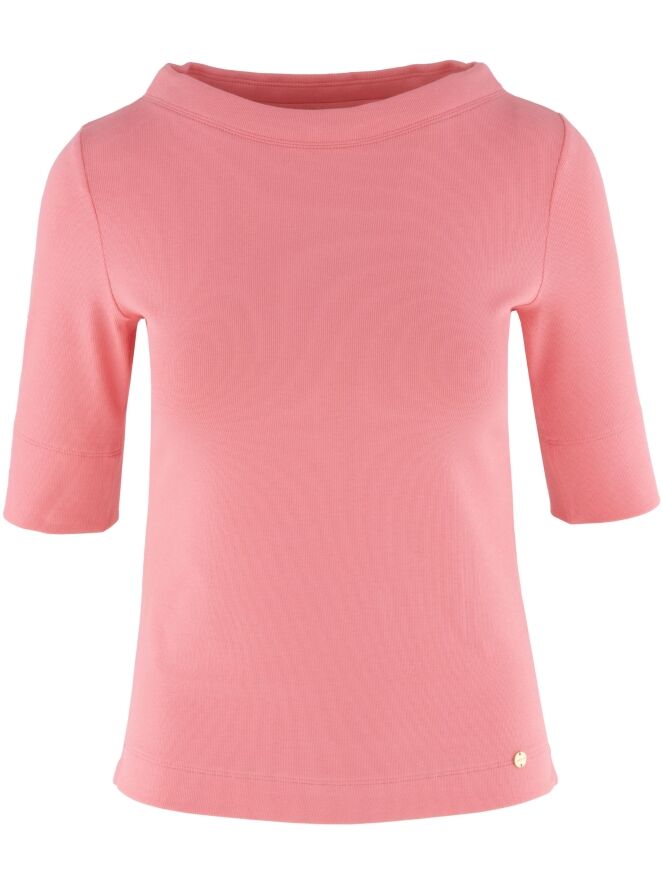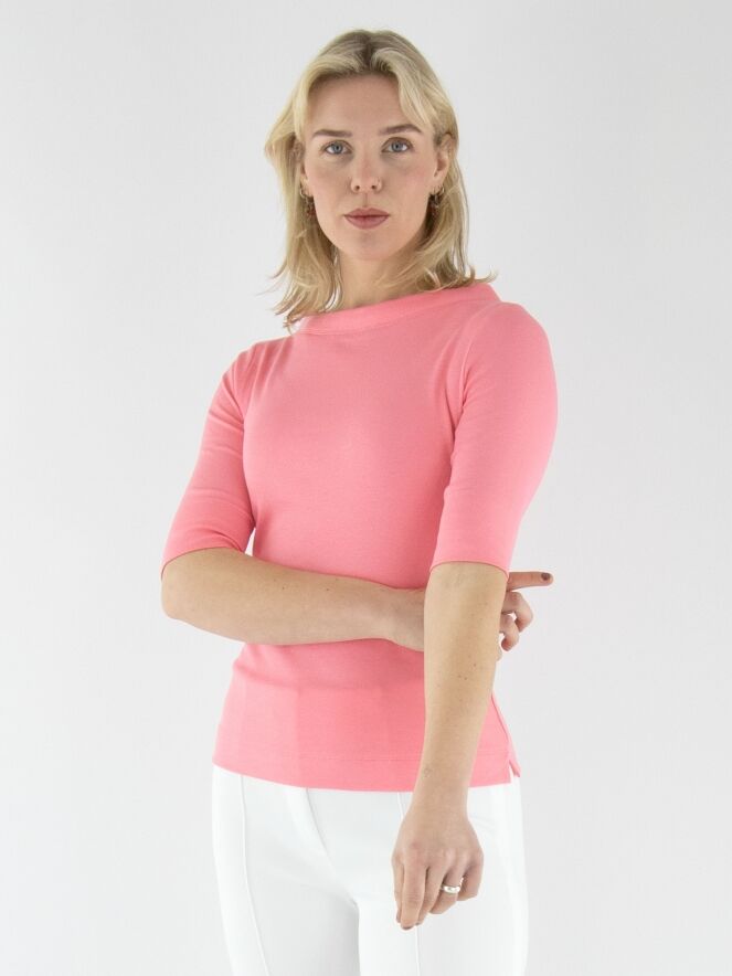 Een shirt van Marc Cain in de kleur zalmroze. Het shirt heeft een fijn geribbelde structuur, korte mouwen en een brede ronde hals. Dit shirt kan op 30 graden worden gewassen.