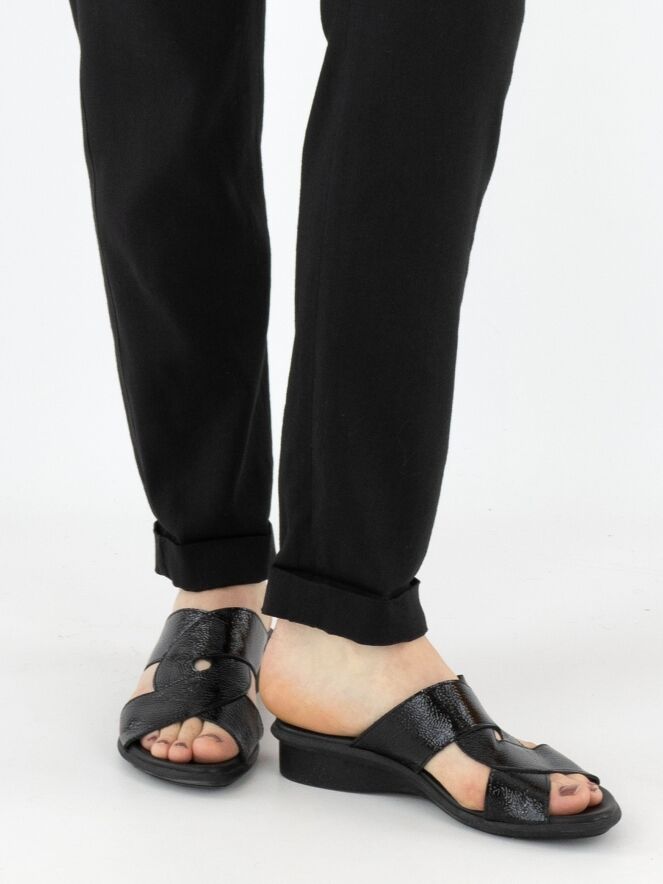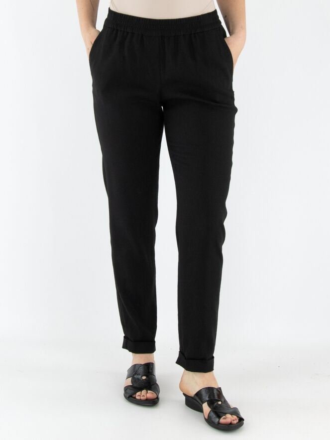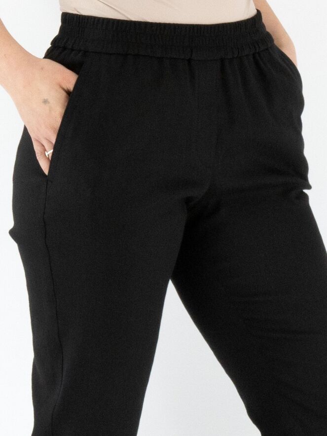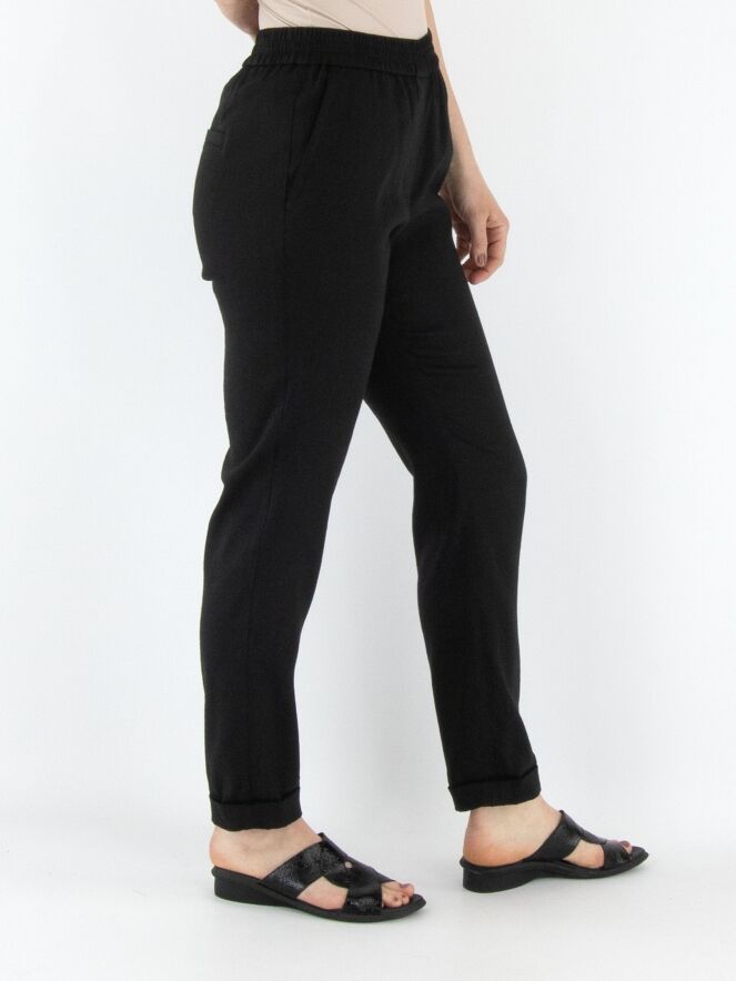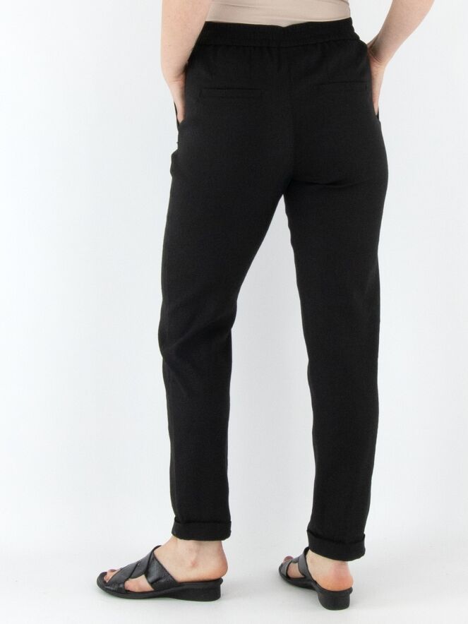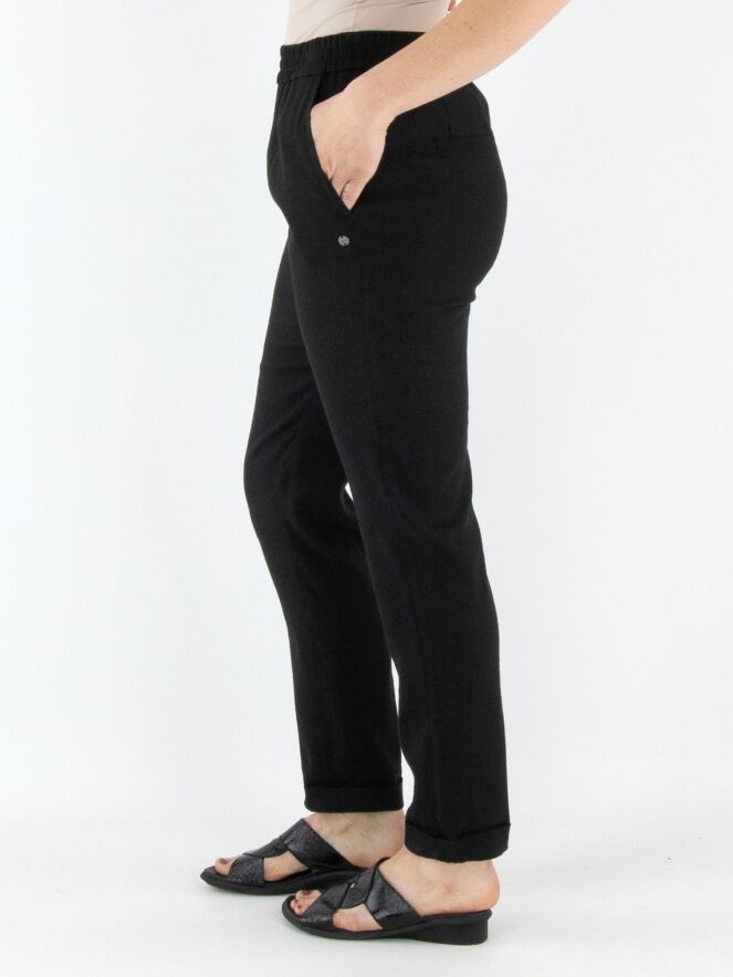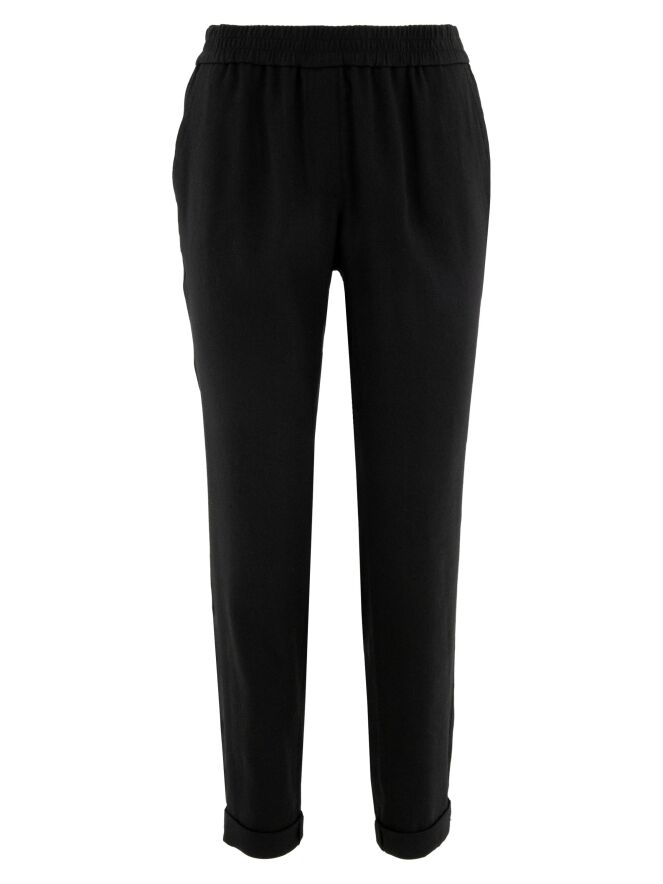 Een broek van Marc Cain in de kleur zwart. De taille heeft een fijn geplooide elastische band. De broek heeft steekzakken en een korte omslag aan de onderkant. Deze broek mag op 30 graden worden gewassen.