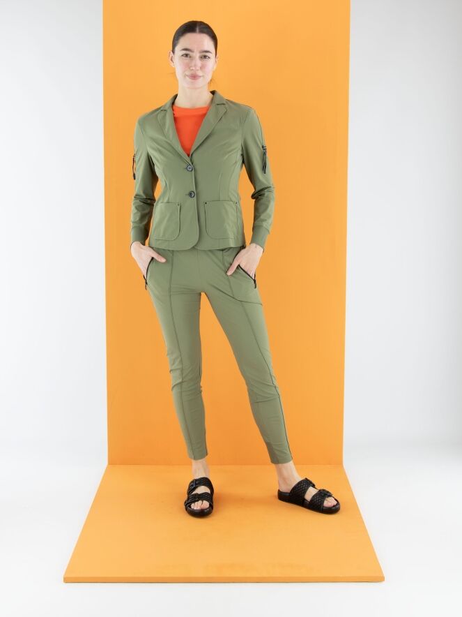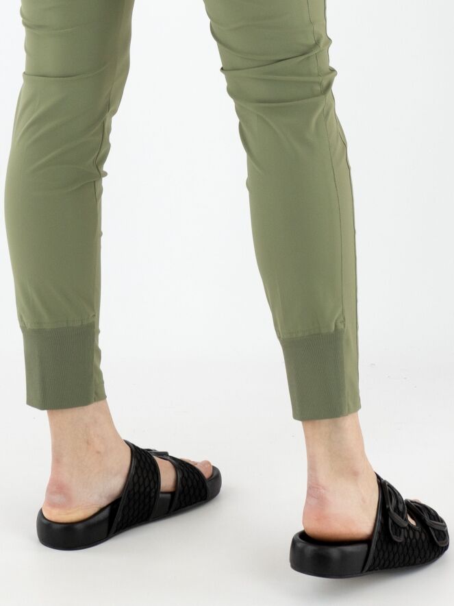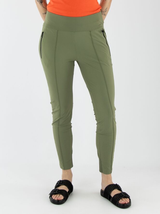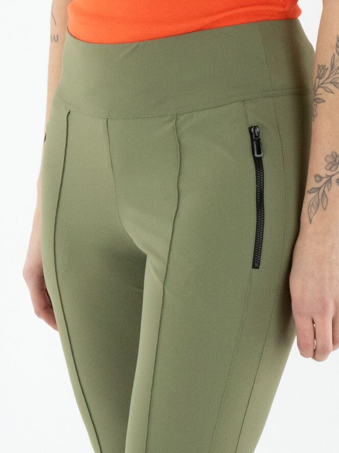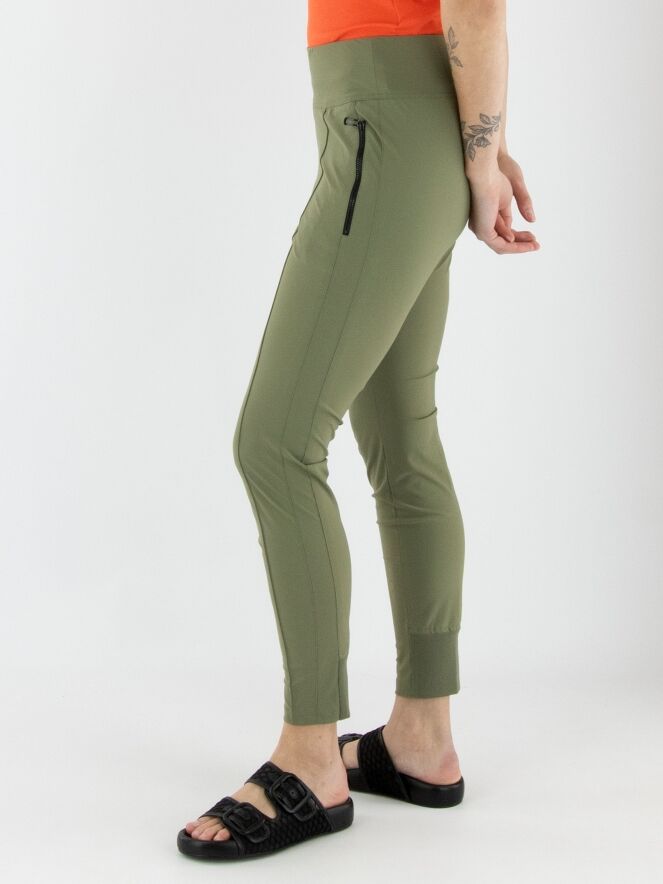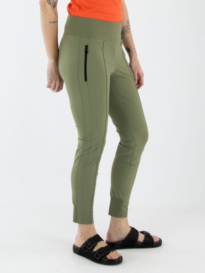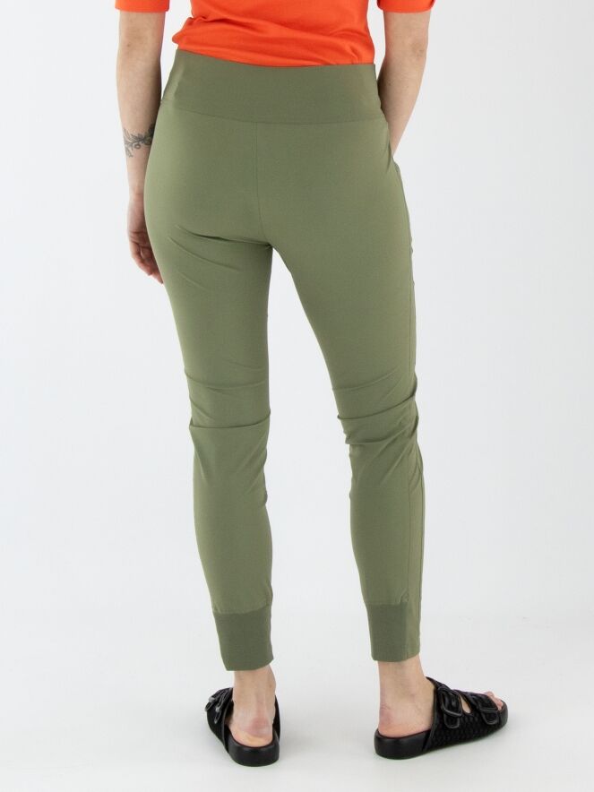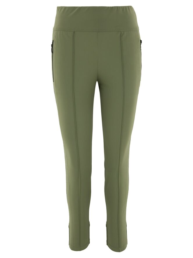 Een legging van Marc Cain in de kleur olijfgroen. In de taille bevindt zich een brede elastische band. De zakken zijn voorzien van een ritssluiting. Aan de achterkant van de onderkant van de pijpen is een brede, fijn geribbelde tricotboord. Deze legging kan op 30 graden worden gewassen.