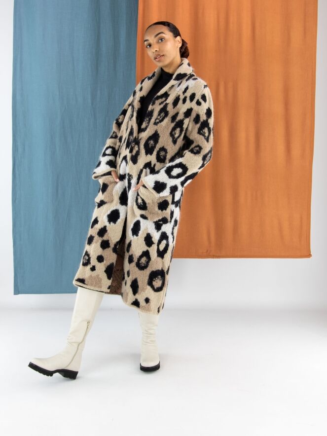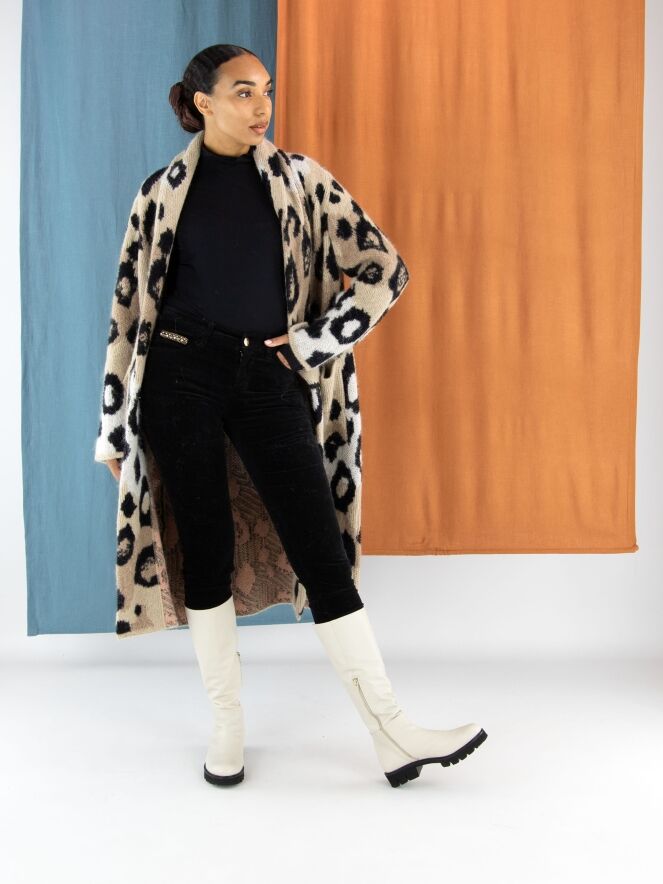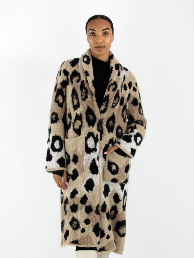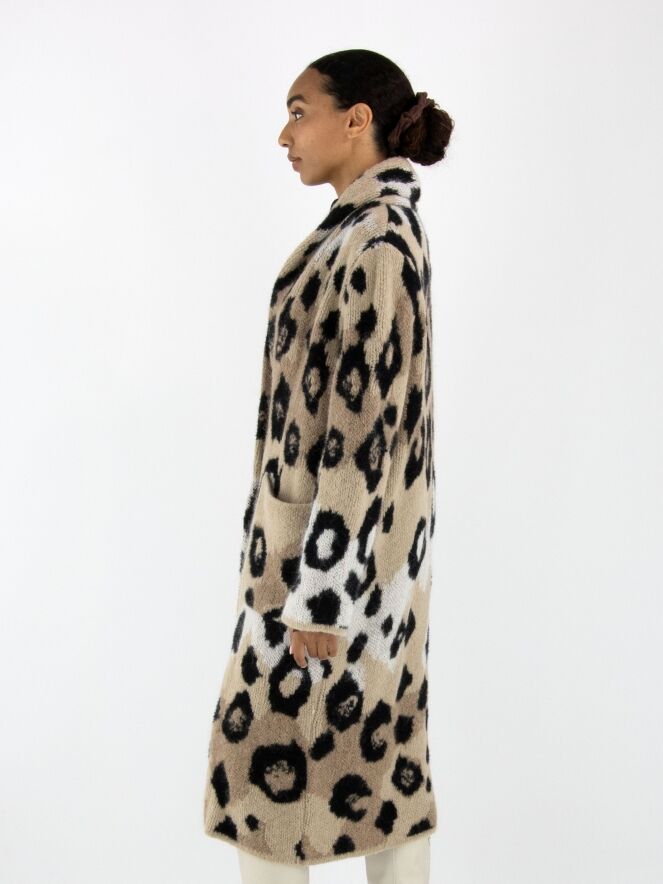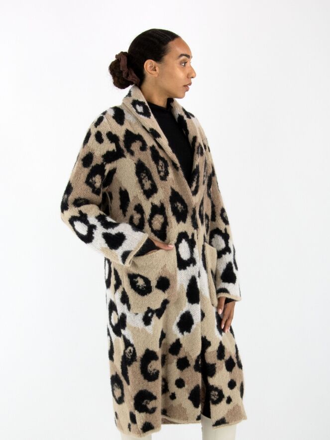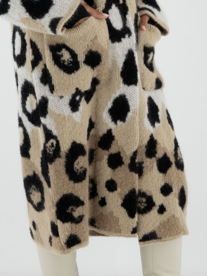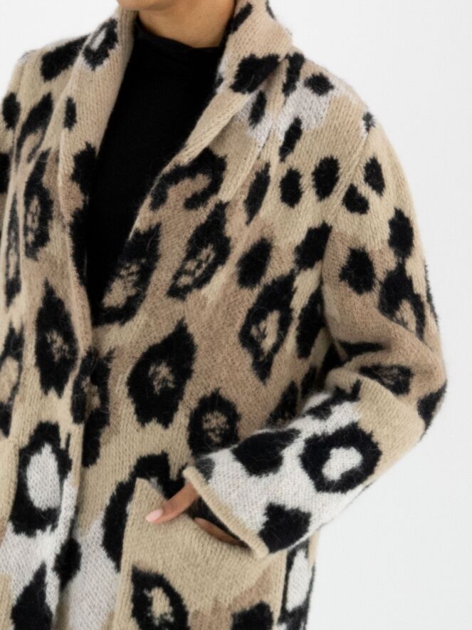 Een halflang gebreid vest van Marc Cain in een panter print met de kleuren roomwit en zwart op een beigeachtergrond. Bij de hals is het vest omgeslagen. Het vest heeft een drukknoop sluiting en mag met de hand gewassen worden
