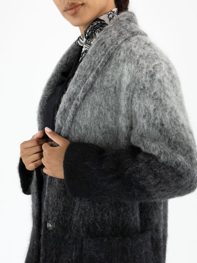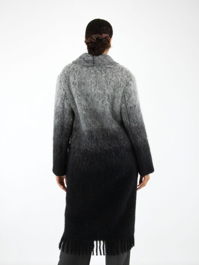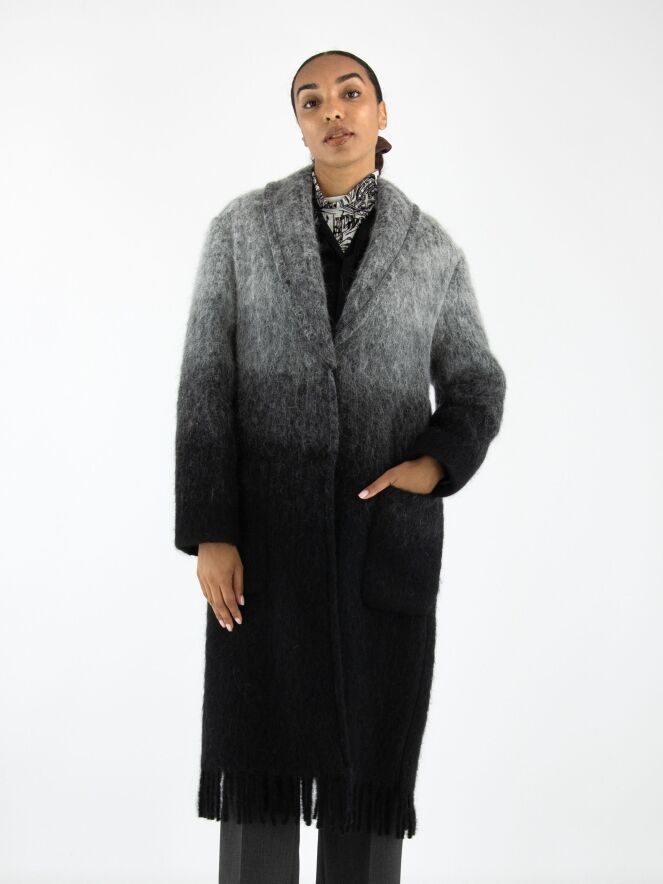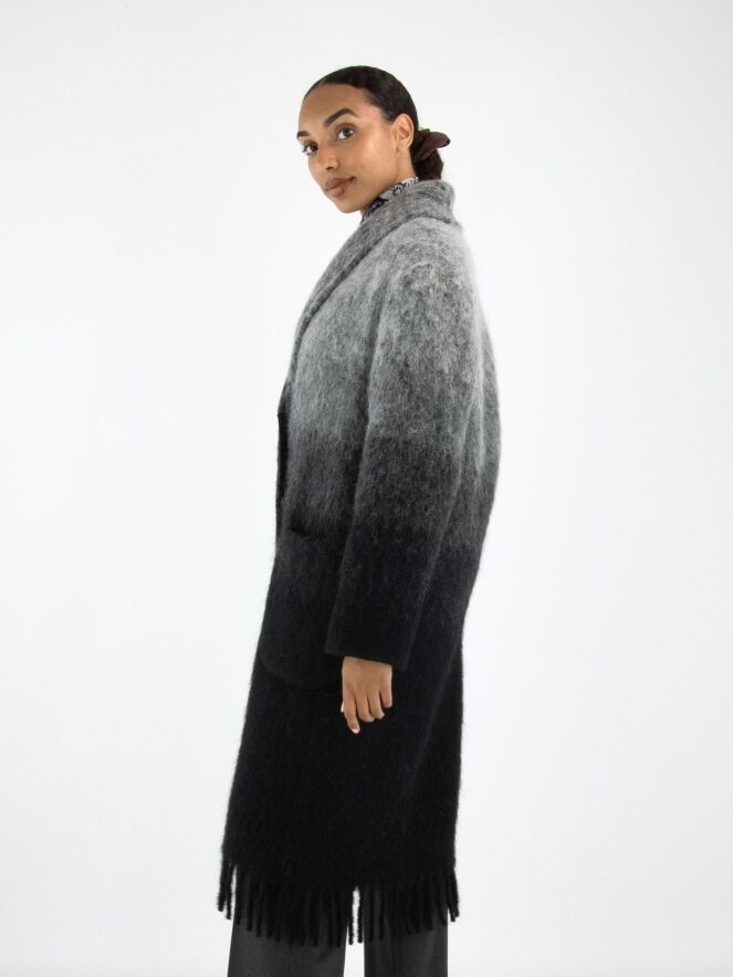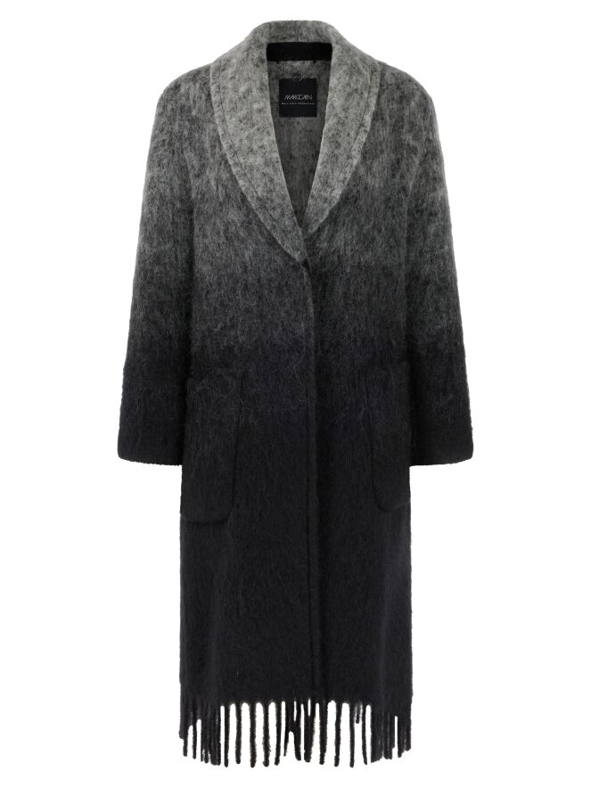 Een mantel van Marc Cain in een dégradé van lichtgrijs bij de kraag naar antracietgrijs aan de onderzijde. De mantel heeft een sluiting met twee drukknopen en is ongevoerd. Aan de onderkant is de mantel afgewerkt met lange franjes. Deze mantel mag niet worden gewassen.