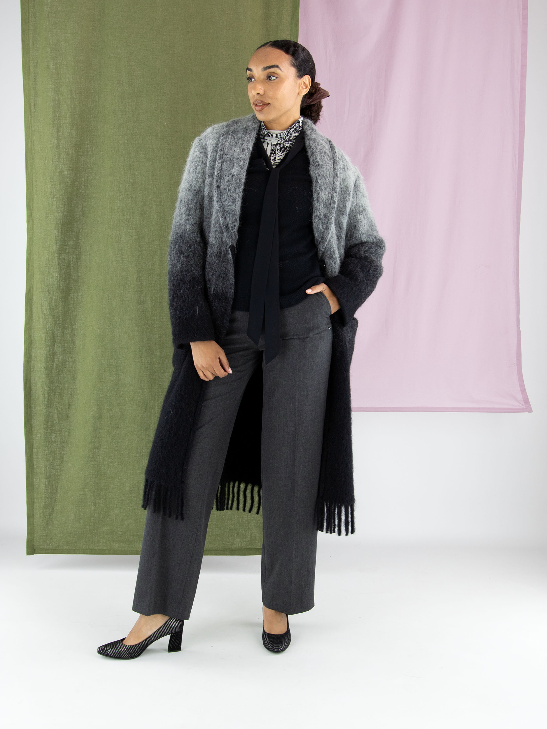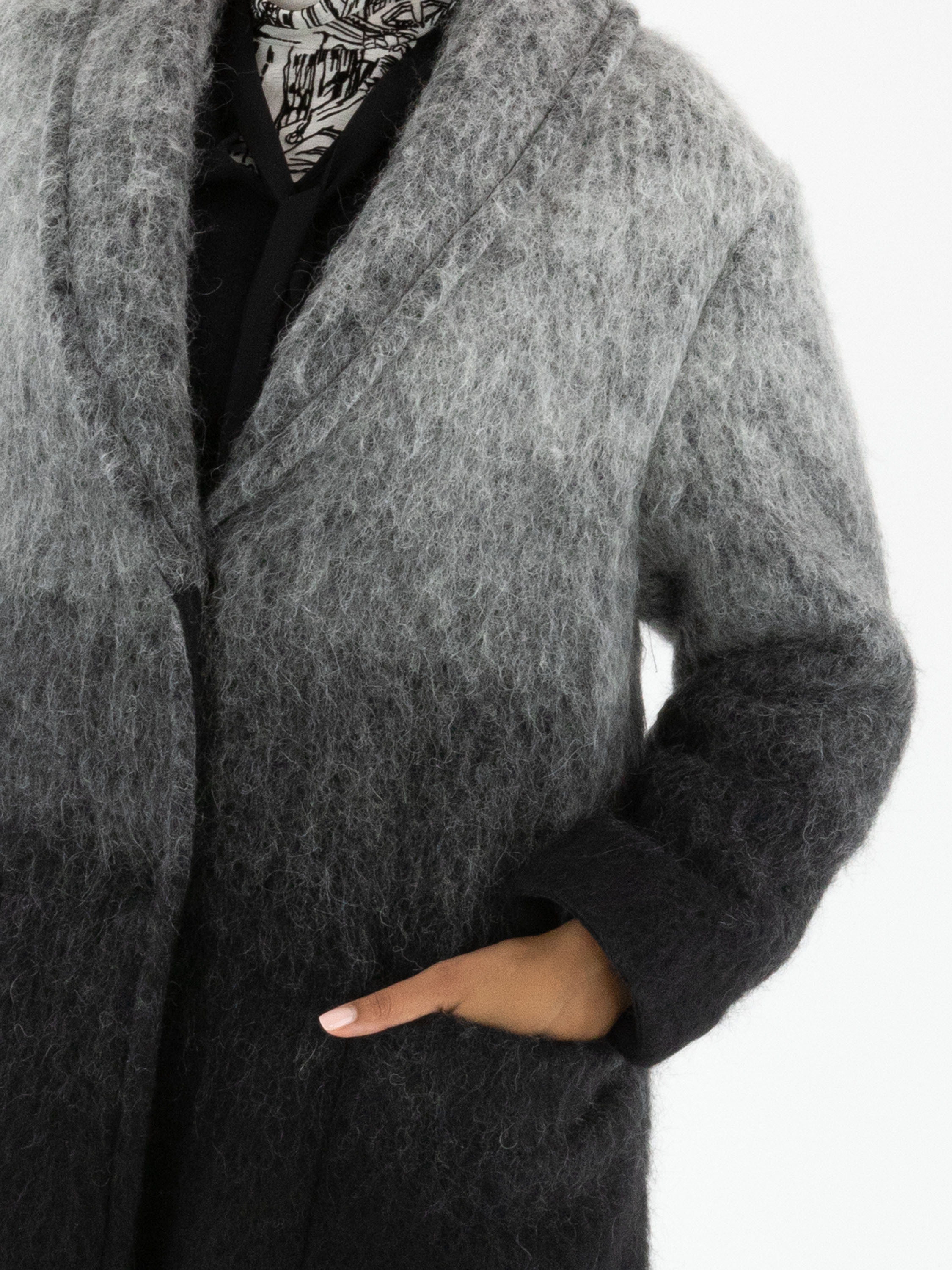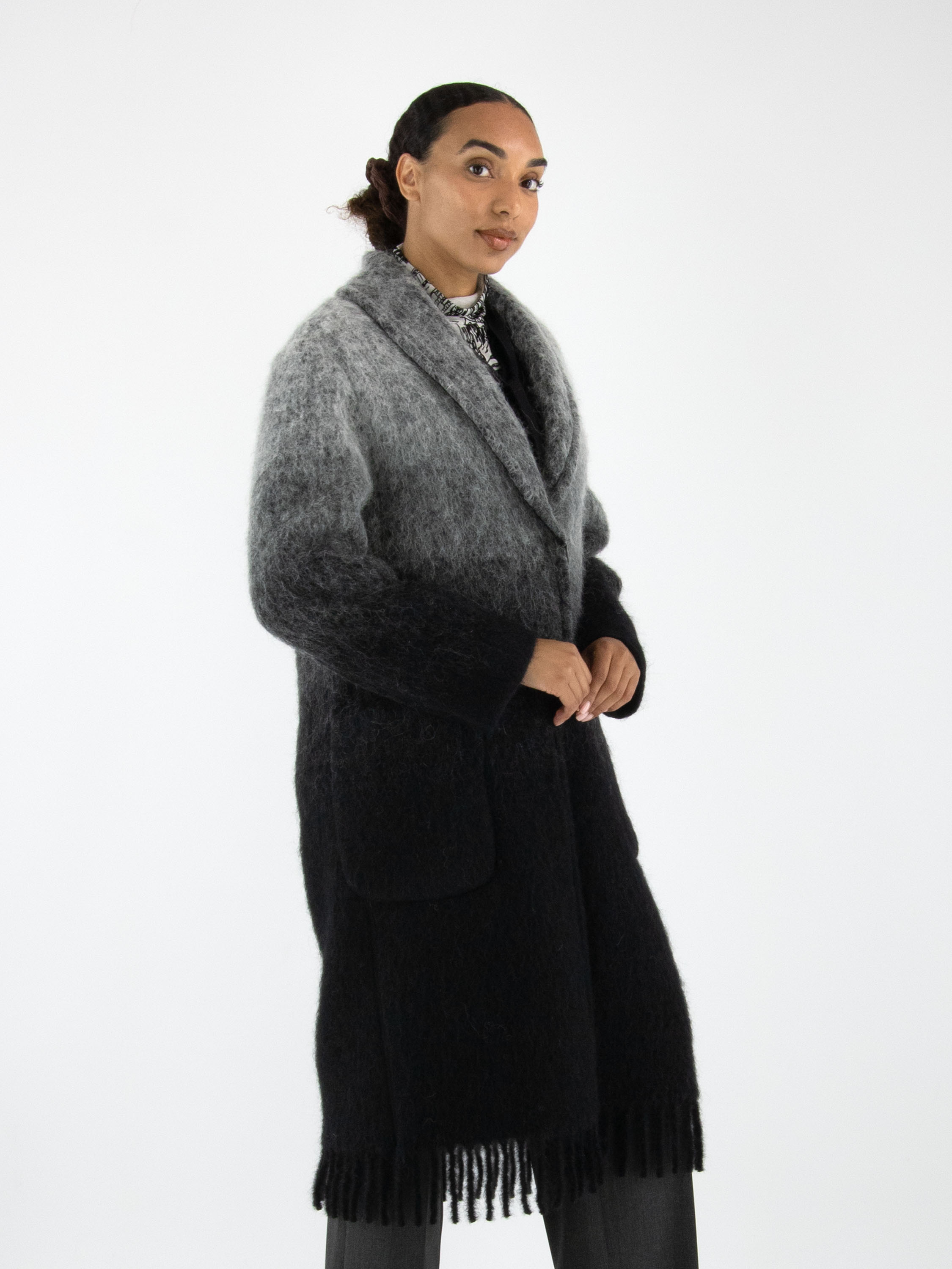 Een mantel van Marc Cain in een dégradé van lichtgrijs bij de kraag naar antracietgrijs aan de onderzijde. De mantel heeft een sluiting met twee drukknopen en is ongevoerd. Aan de onderkant is de mantel afgewerkt met lange franjes. Deze mantel mag niet worden gewassen.