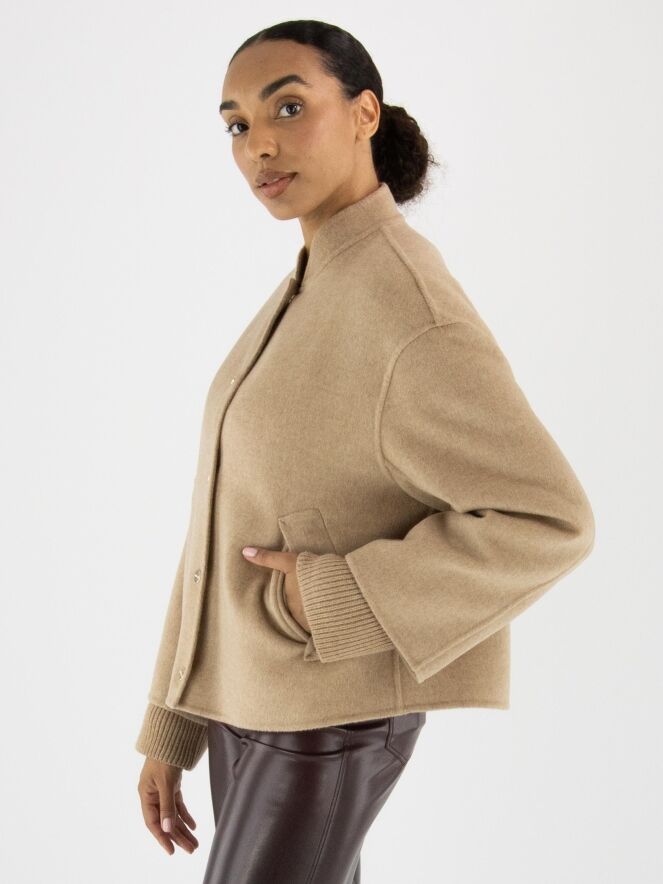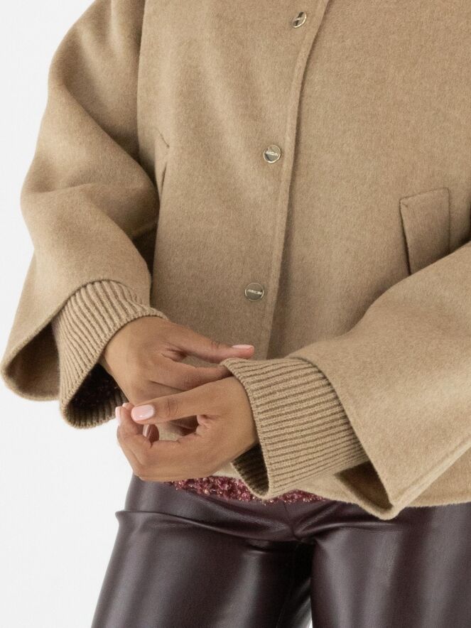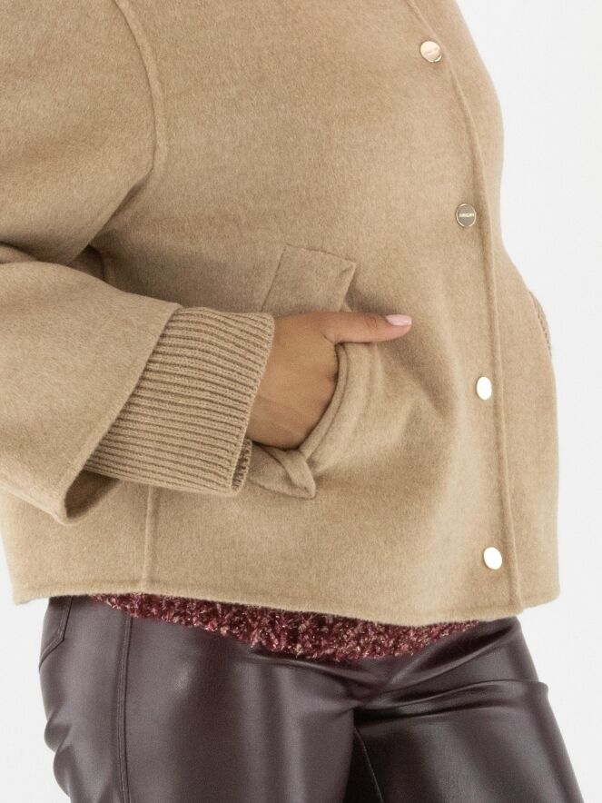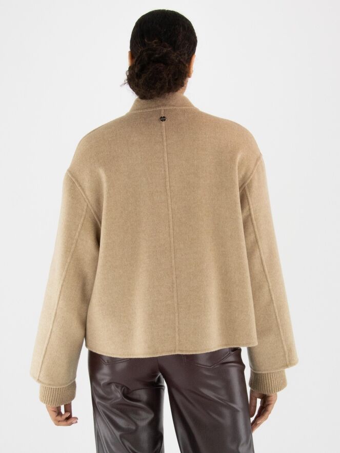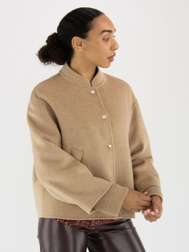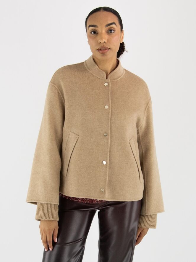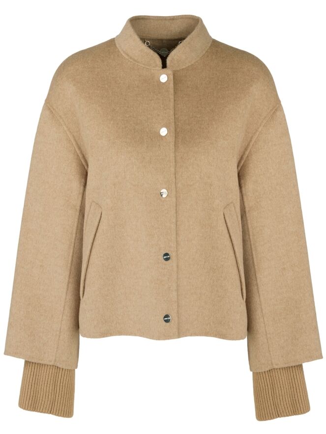 Een blazer van Marc Cain in een zachte camelkleur. De steekzakken hebben een omgekeerde omslag. De blazer sluit met kleine goudkleurige drukknopen en is ongevoerd. Vanuit de uiteinden van de mouwen zijn fijn geribbelde tricot manchetten verwerkt. Deze blazer mag niet worden gewassen.