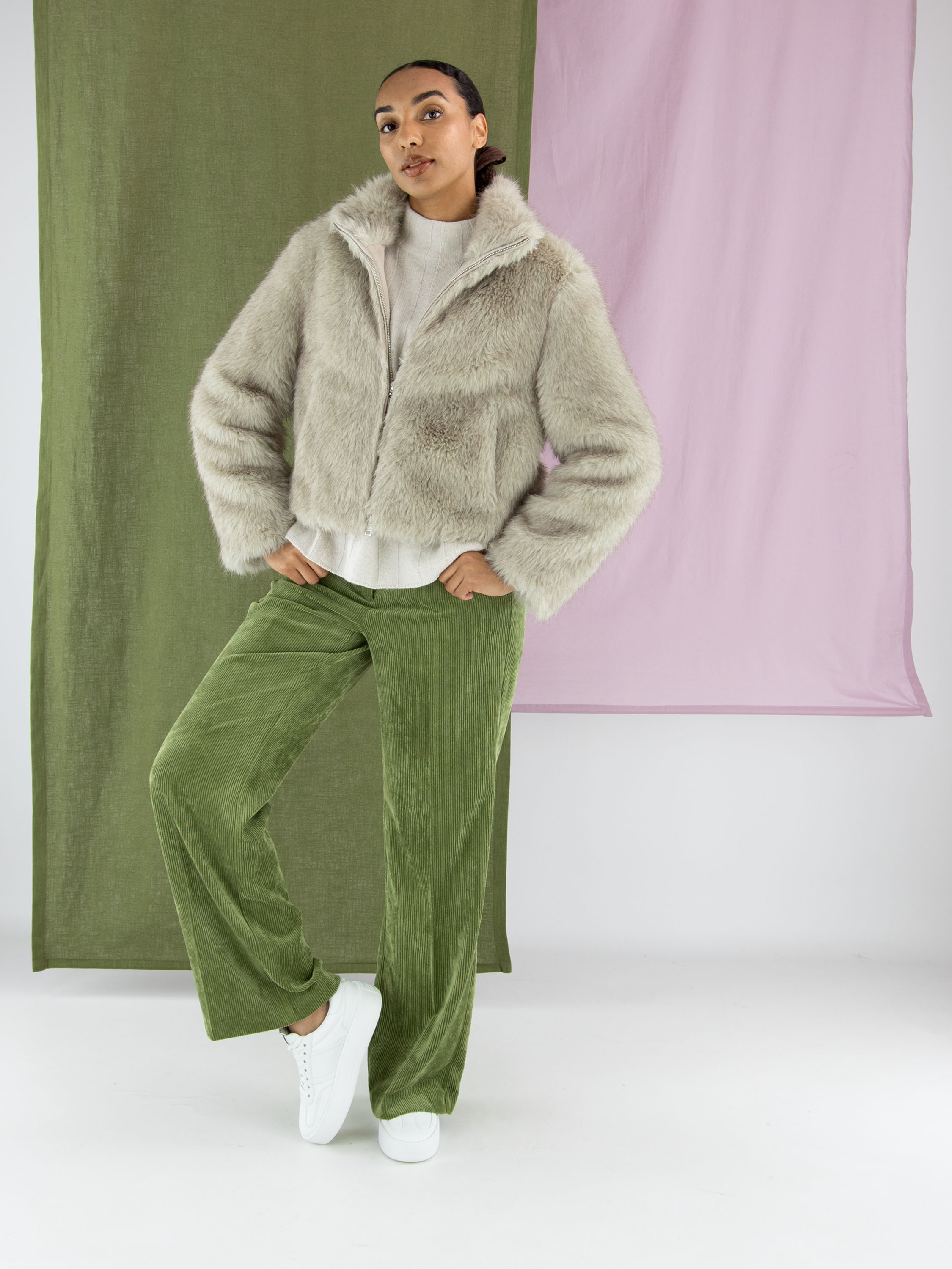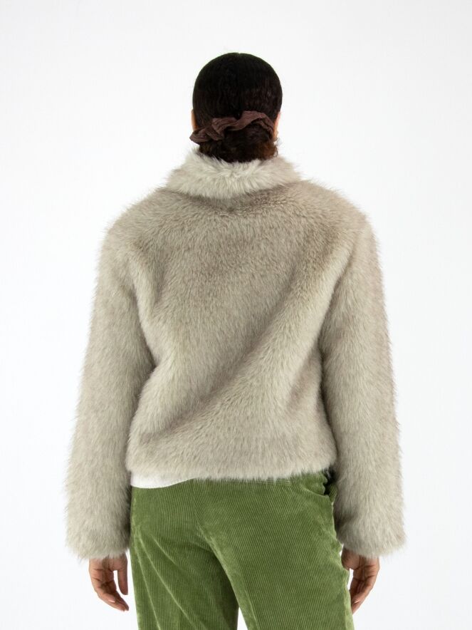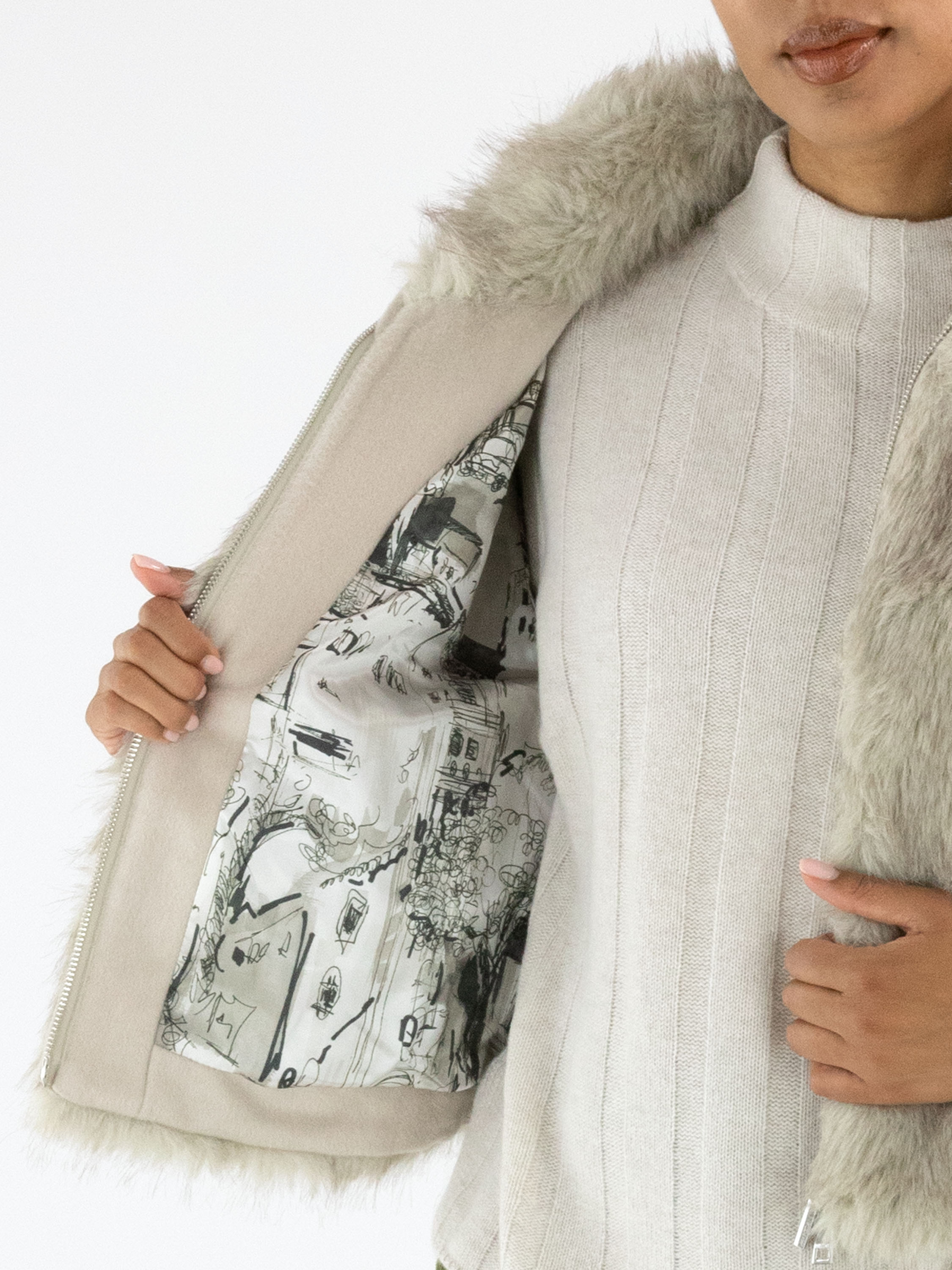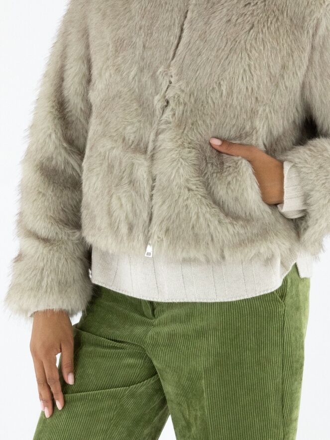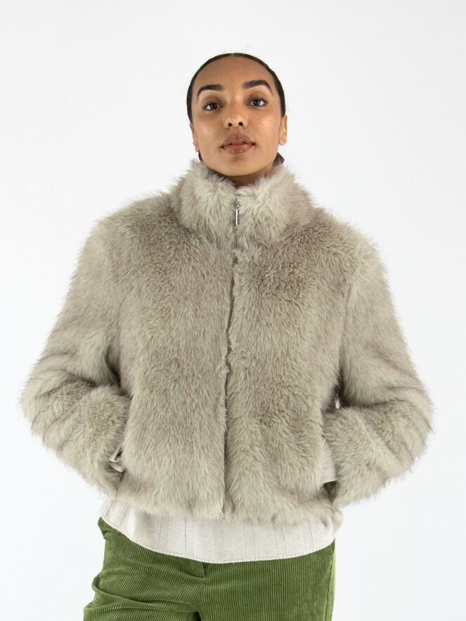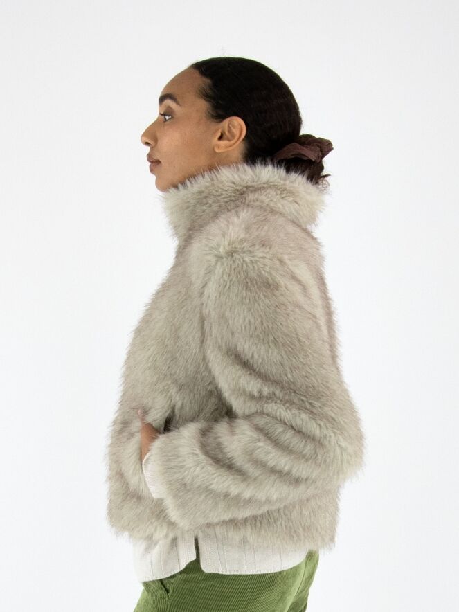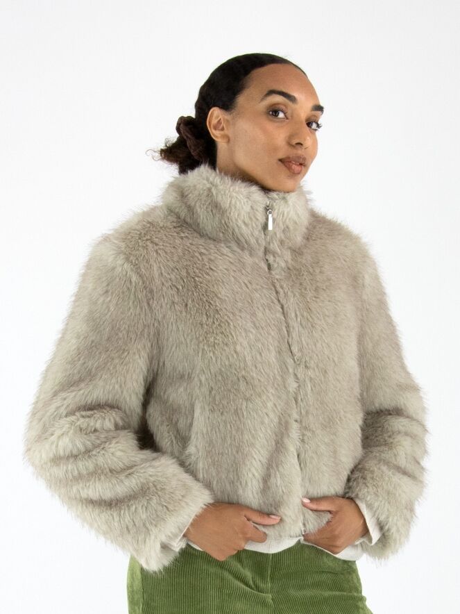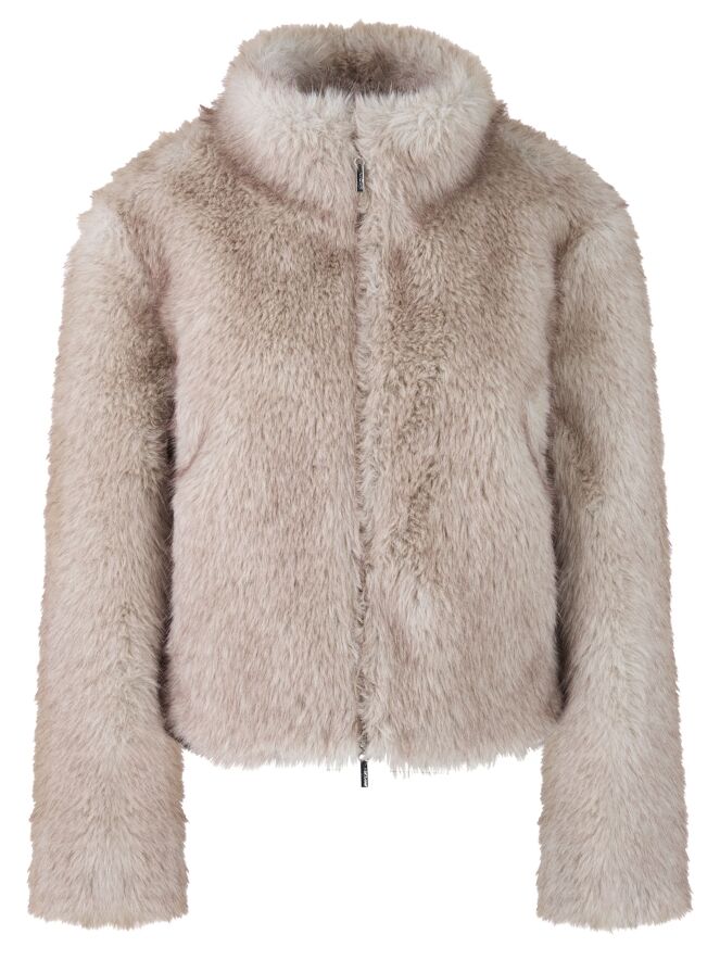 Een korte imitatiebontjas van Marc Cain in natuurlijke tinten beige, grijs en roomwit. Het imitatiebont is ongeschoren, wat zorgt voor een volle en luxe uitstraling. De jas heeft een ritssluiting en steekzakken. Deze jas mag niet worden gewassen.