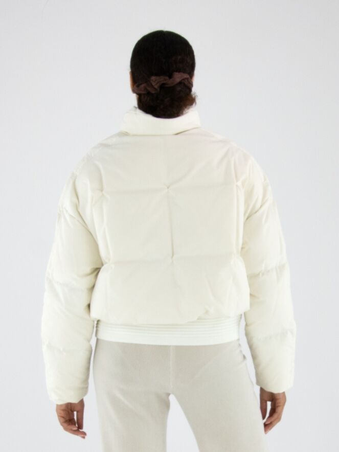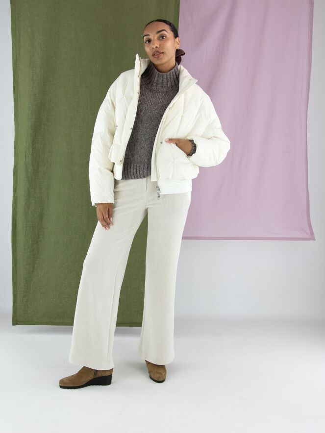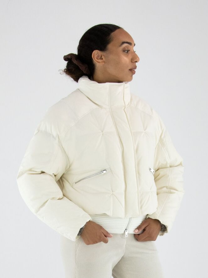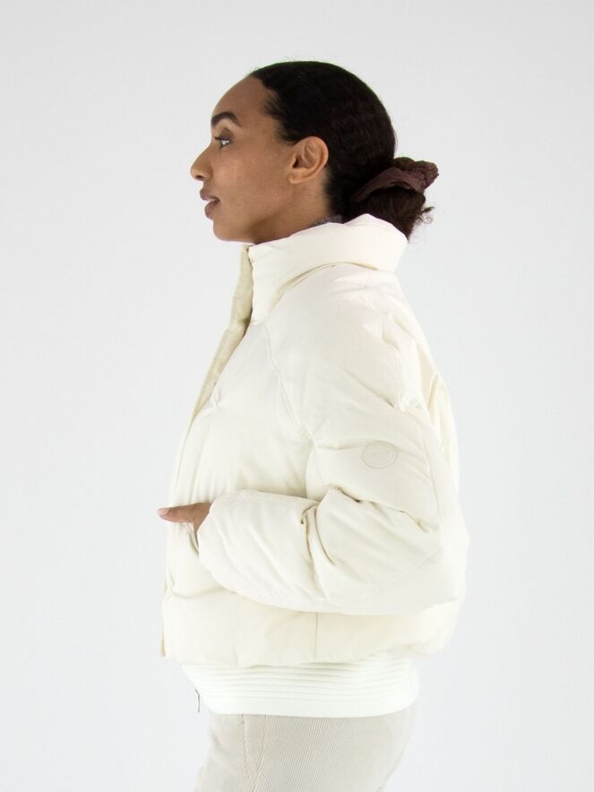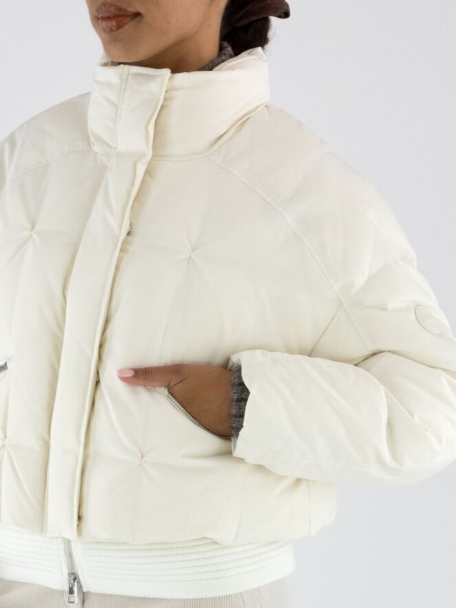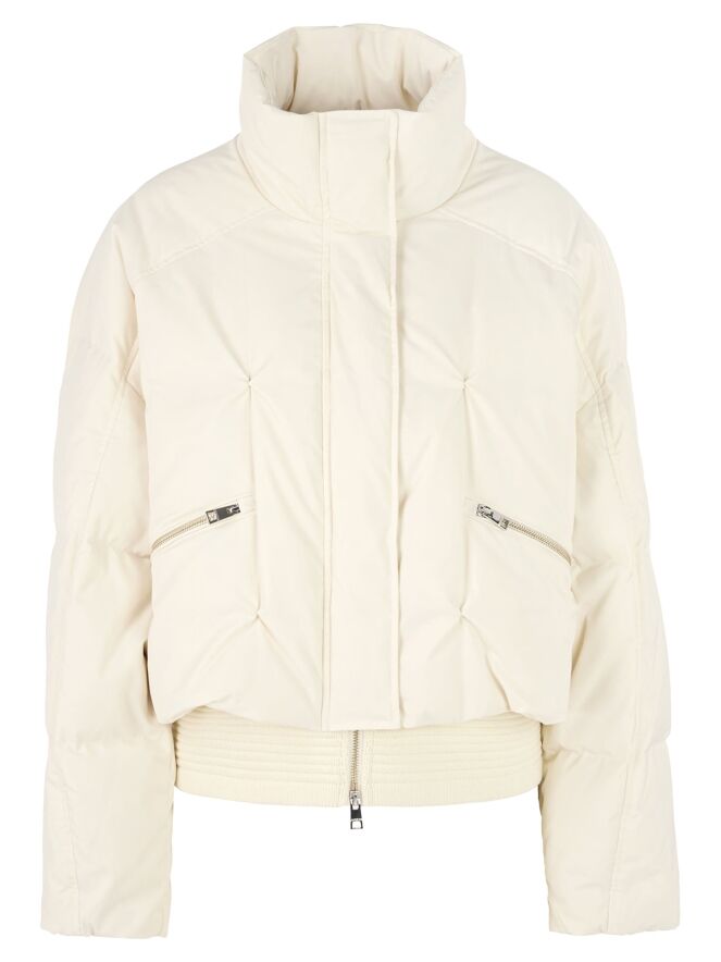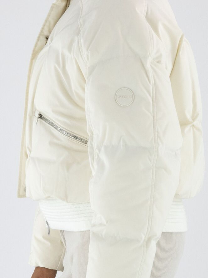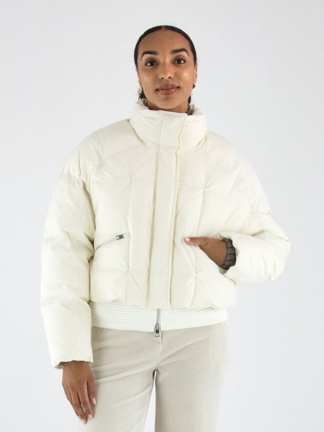 Een korte bomber coat van Marc Cain in de kleur roomwit. Over de ritssluiting loopt een tweede sluiting met drukknopen. De steekzakken zijn voorzien van een ritssluiting. Aan de onderkant heeft de coat een brede, geribbelde tricot boord. Deze coat mag op 30 graden worden gewassen.