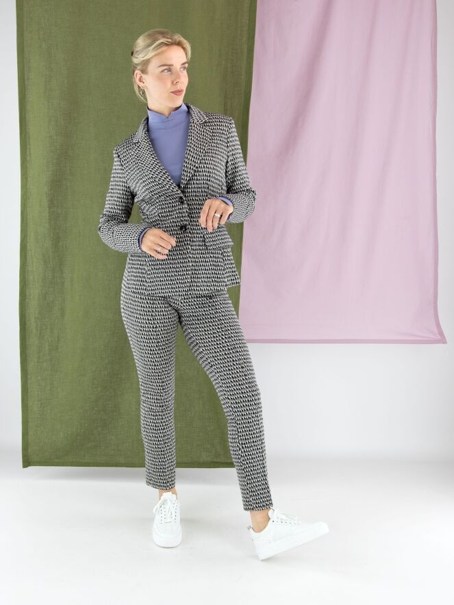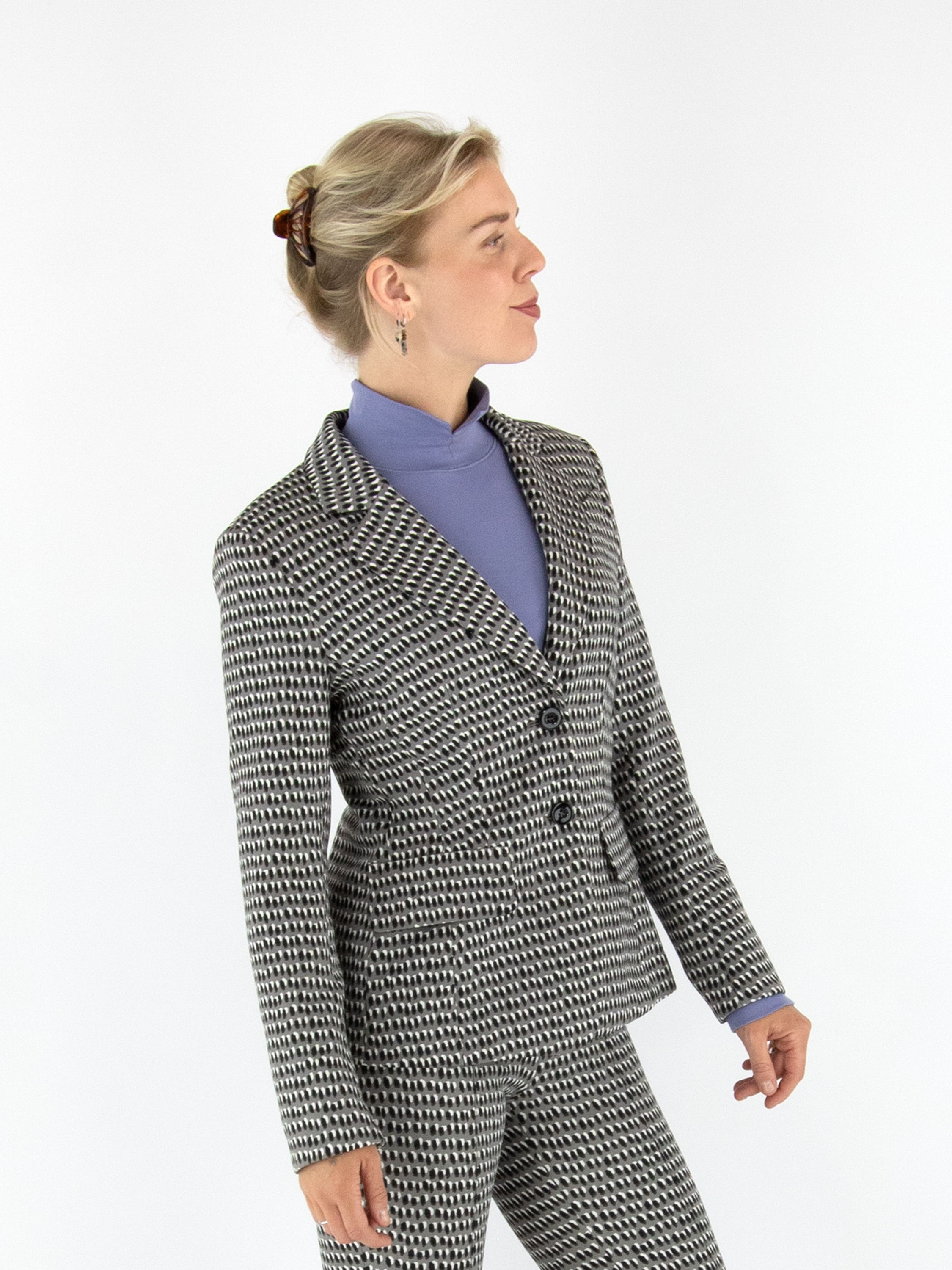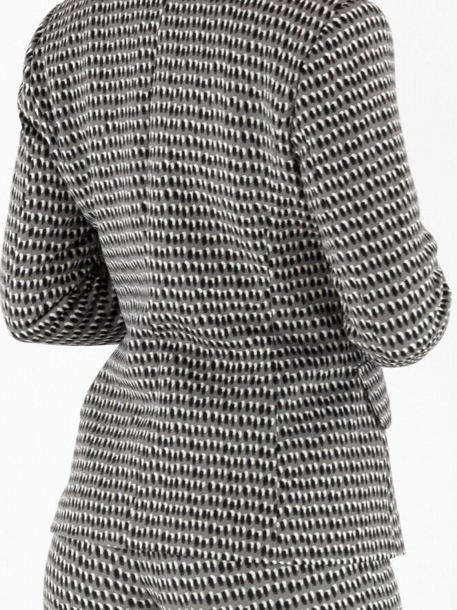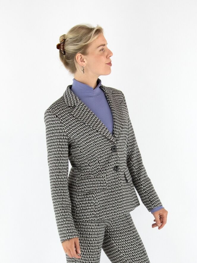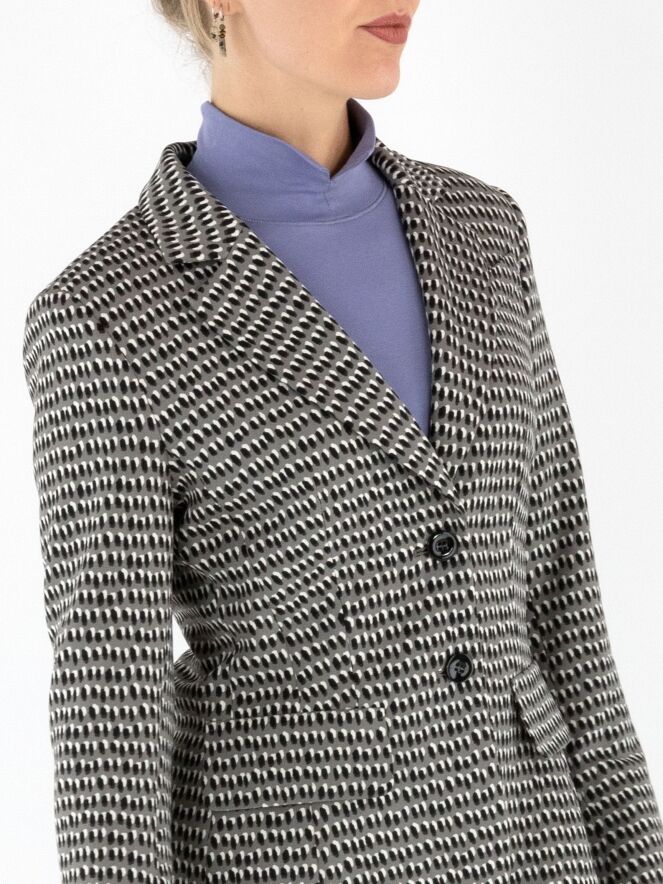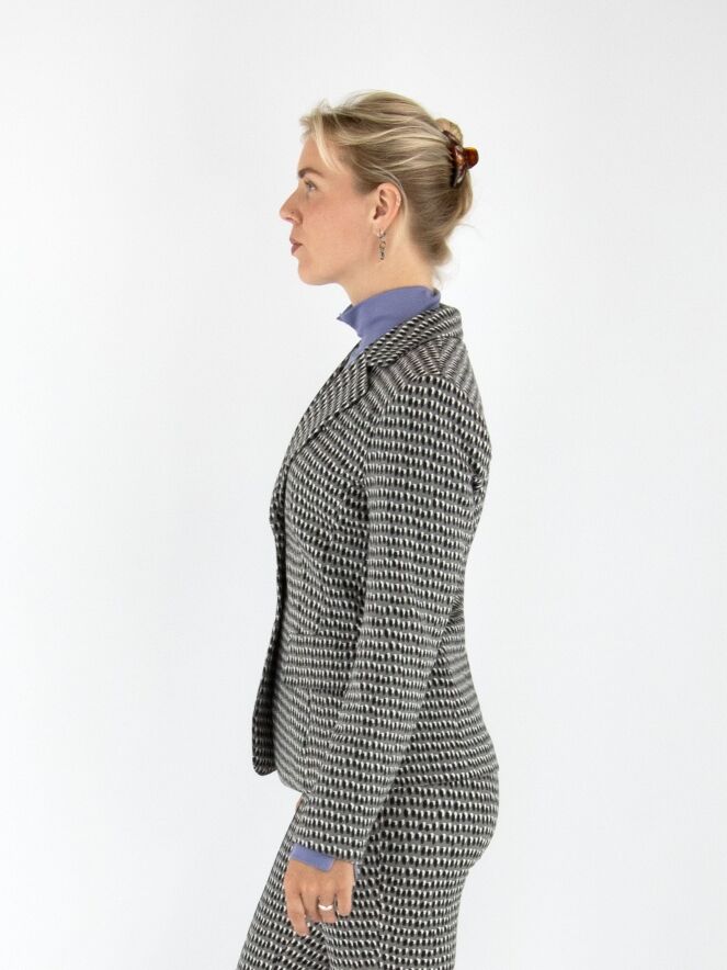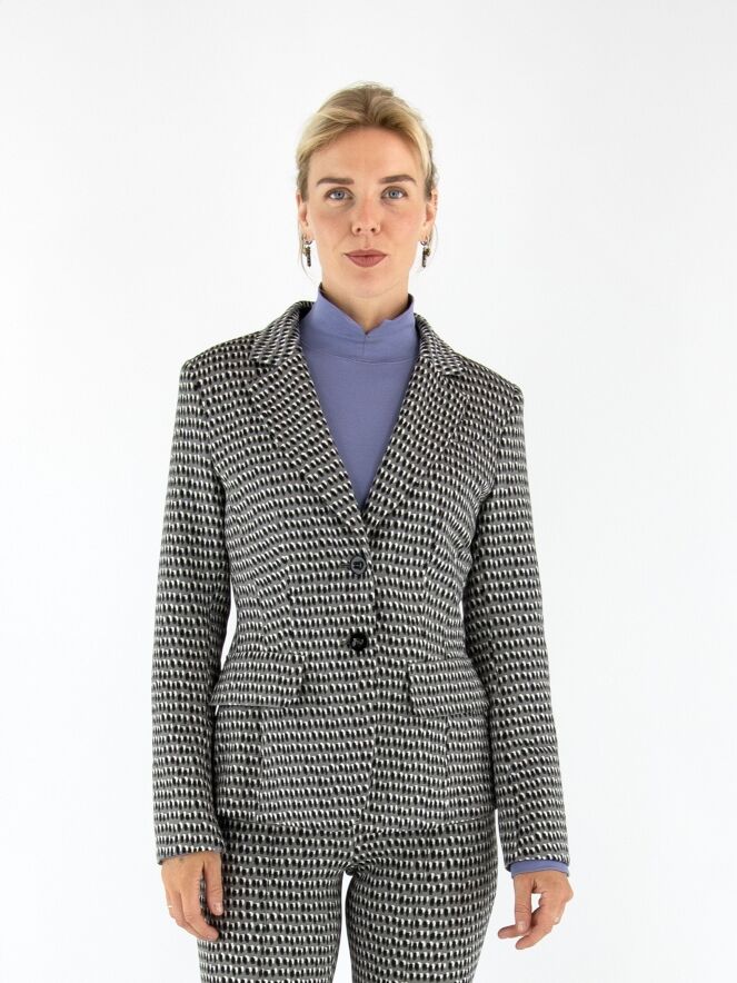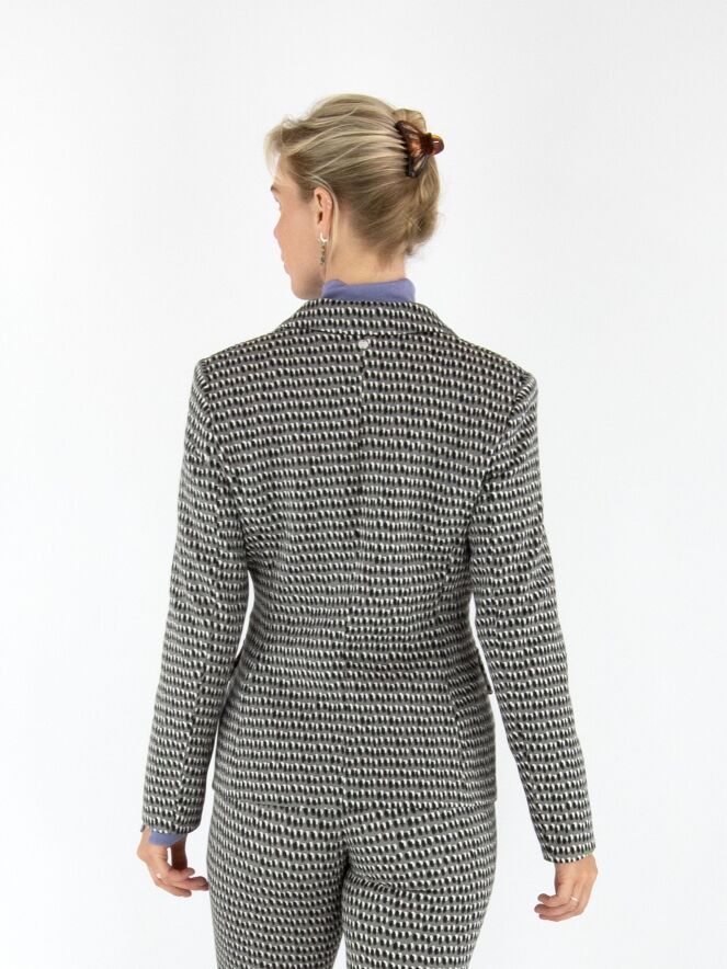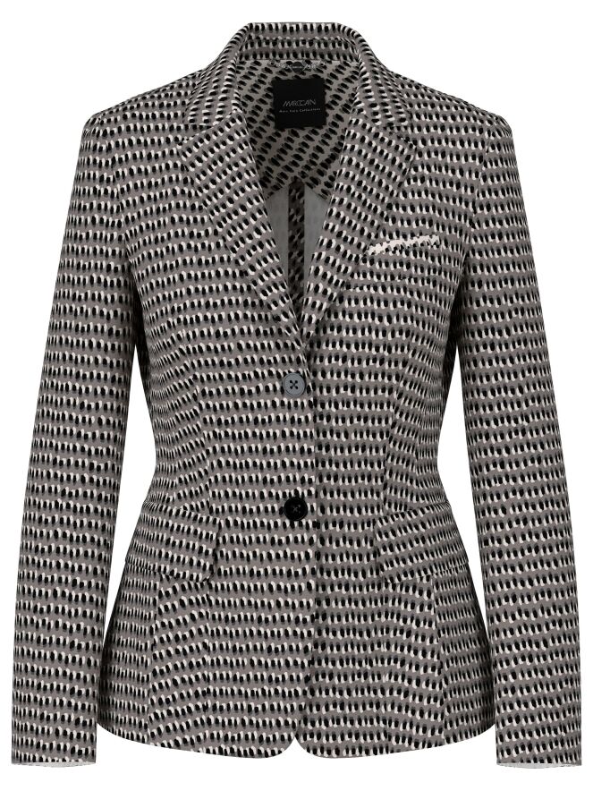 Een blazer van Marc Cain in scuba-kwaliteit met een stippenprint in zwart en wit op een grijze achtergrond. De blazer sluit met twee knopen en is deels gevoerd. Dit kledingstuk mag op 30 graden worden gewassen.