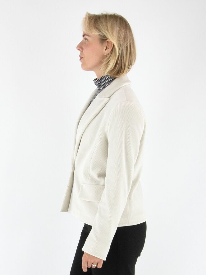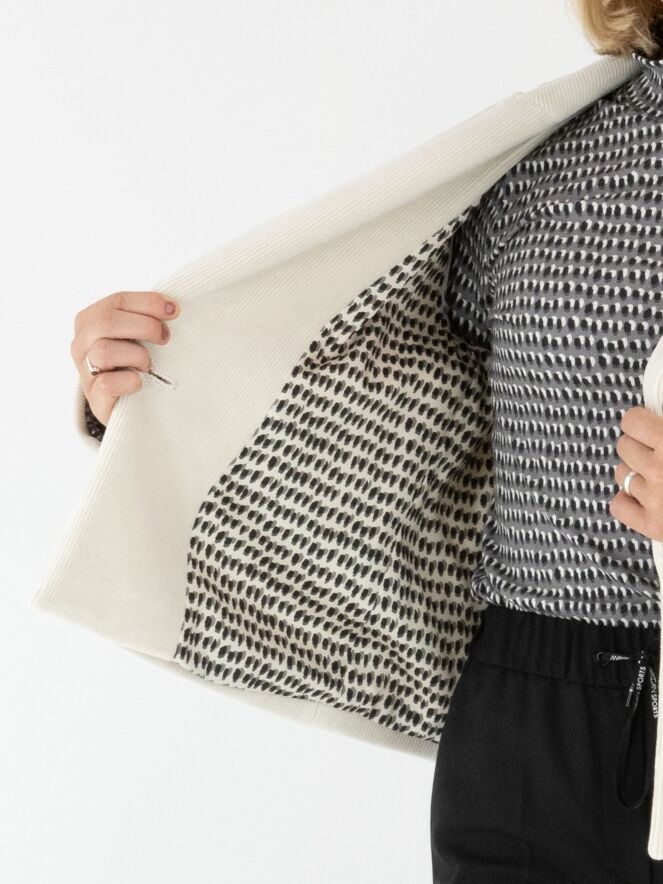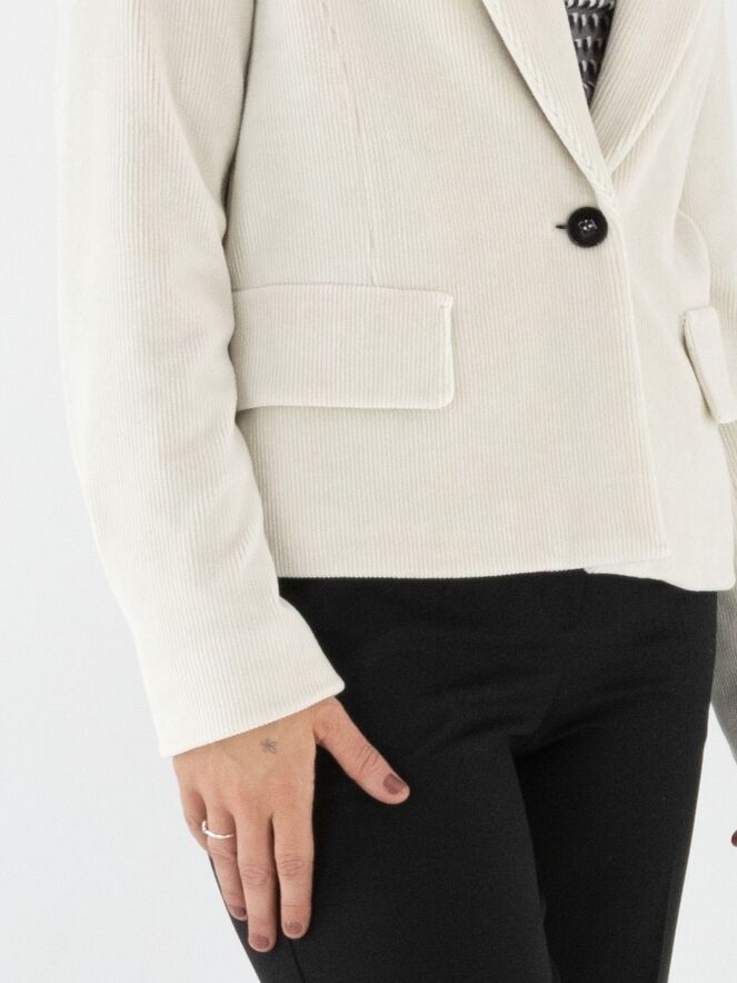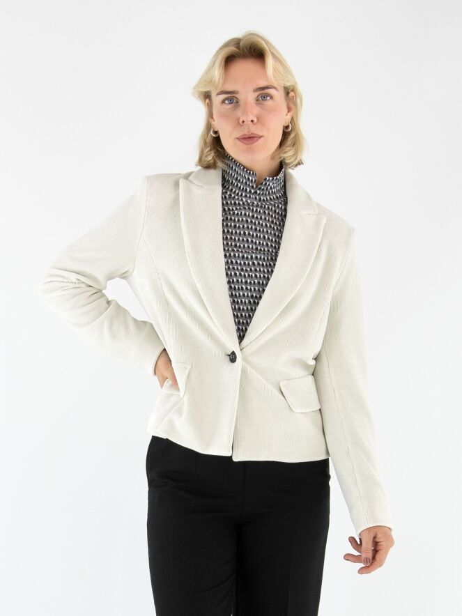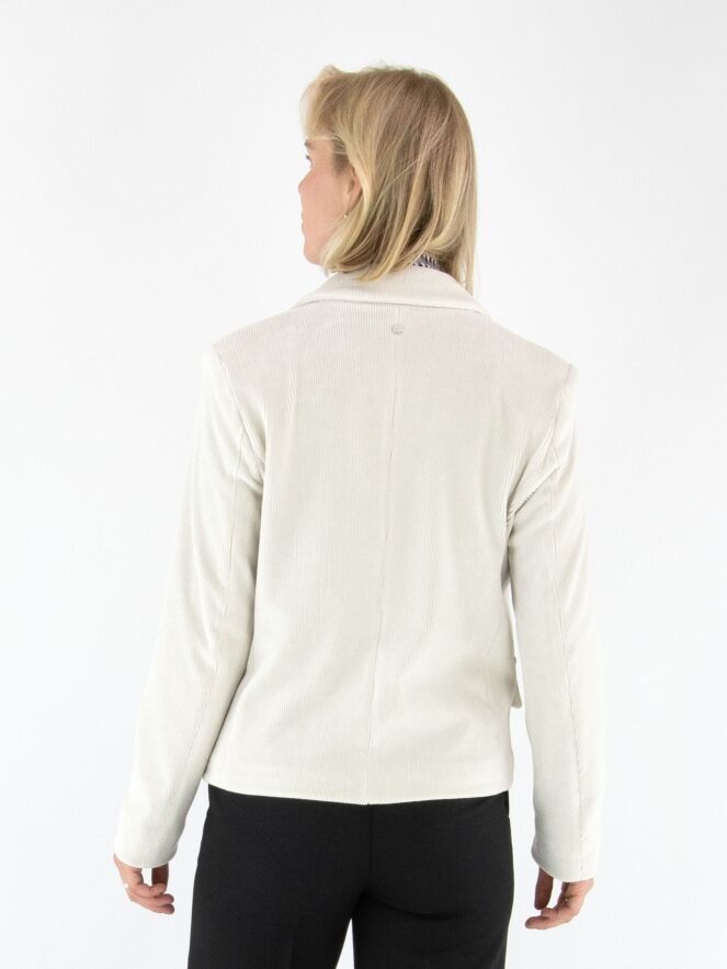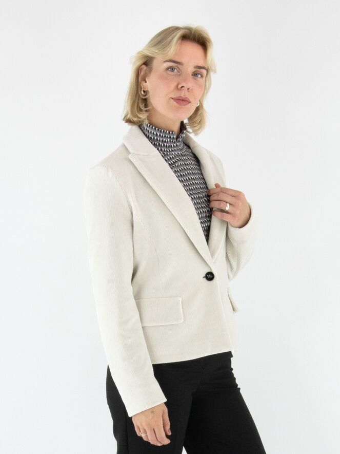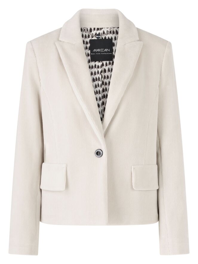 Een rib cord blazer van Marc Cain in een zachte beige kleur. De blazer sluit met één knoop en is aan de binnenkant gevoerd met een speelse stippenprint, wat een verrassend accent geeft. Deze blazer kan op 30 graden worden gewassen.