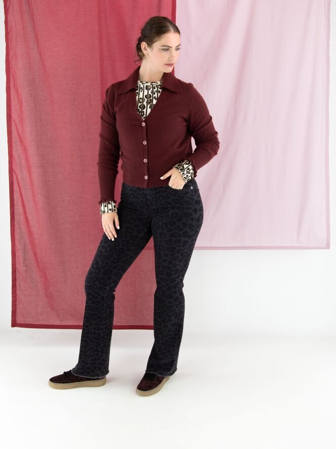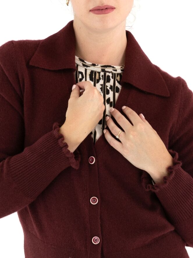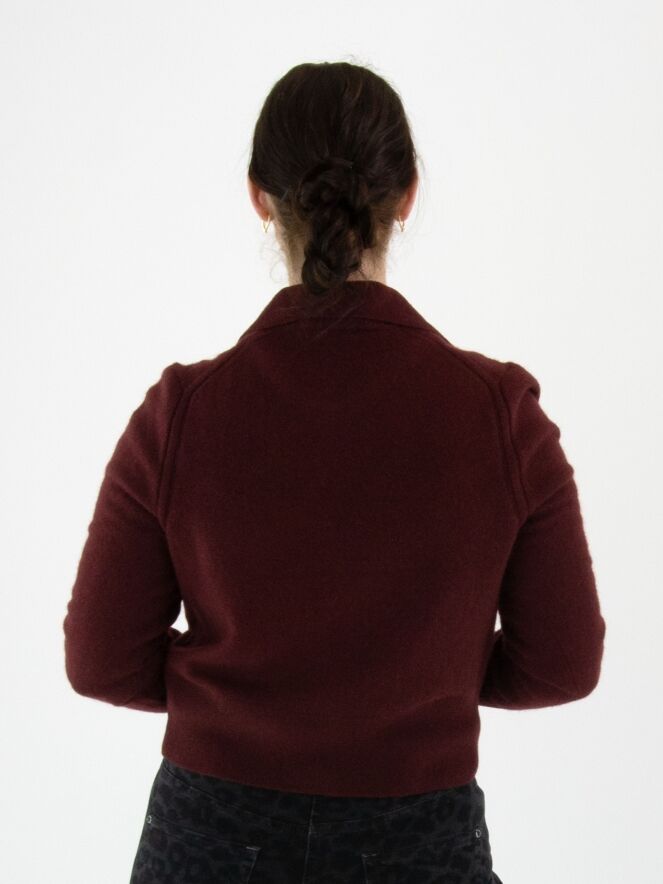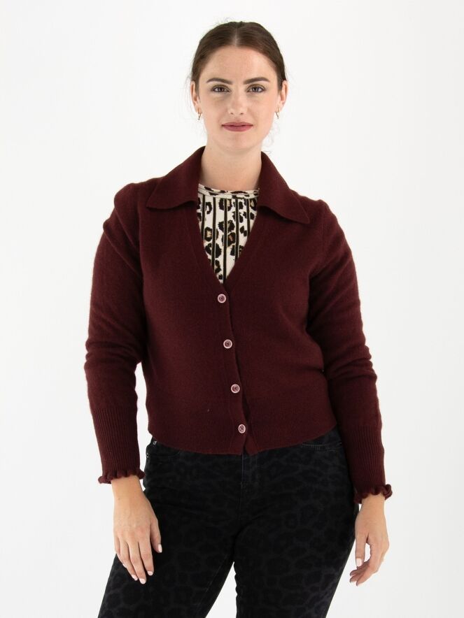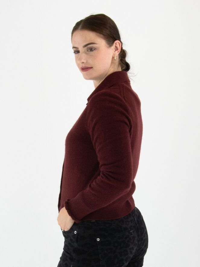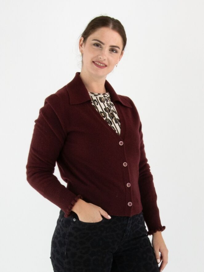 Een kort vest van Marc Cain in de kleur aubergine. Het vest sluit met vier knopen. Langs de rand van de hals bevindt zich een brede kraag. Aan de uiteinden van de lange mouwen zitten lange, fijn geribbelde manchetten met een gesmokte rand. Dit vest mag met de hand worden gewassen.