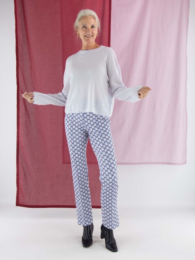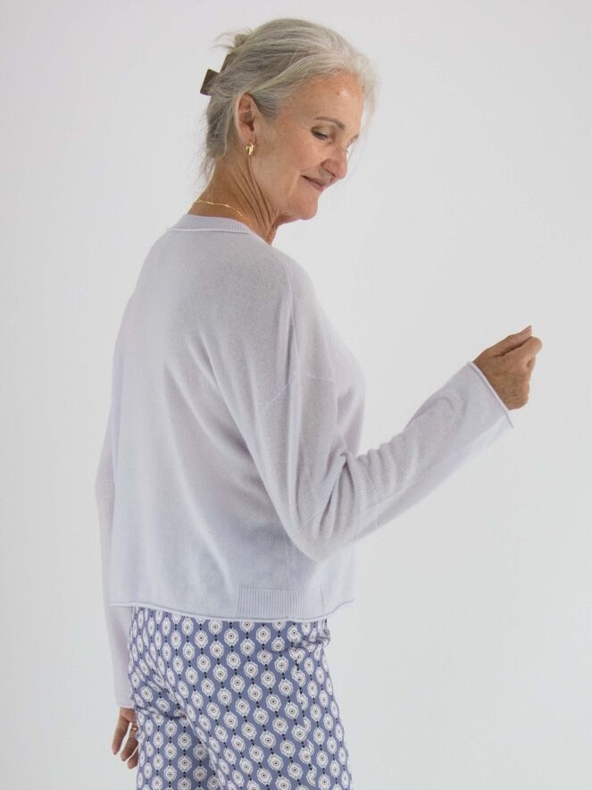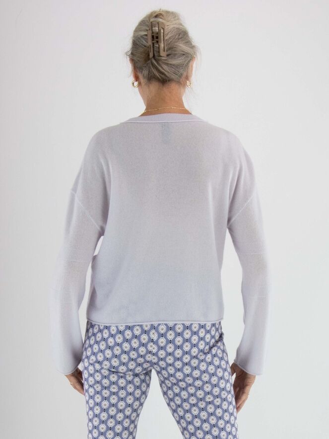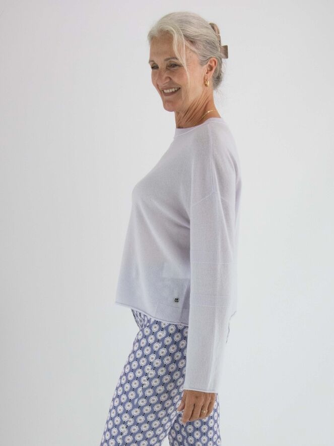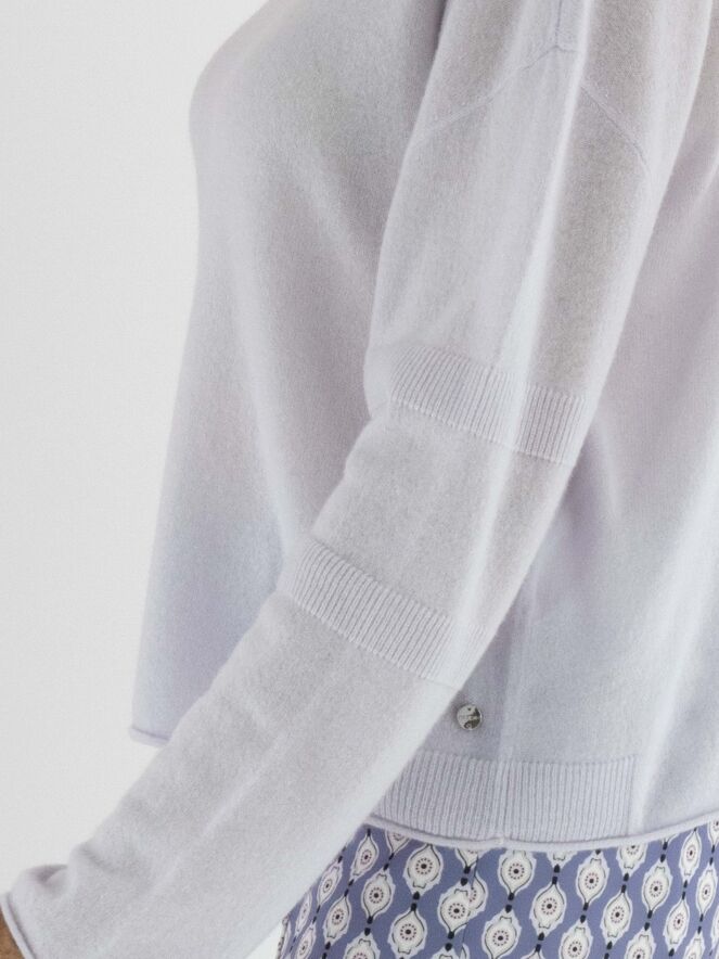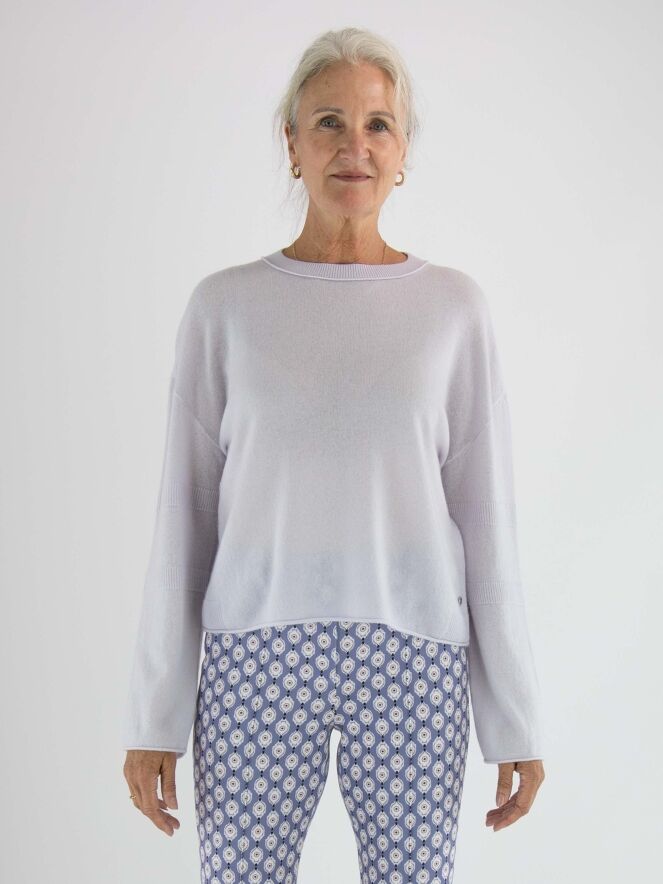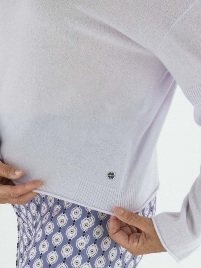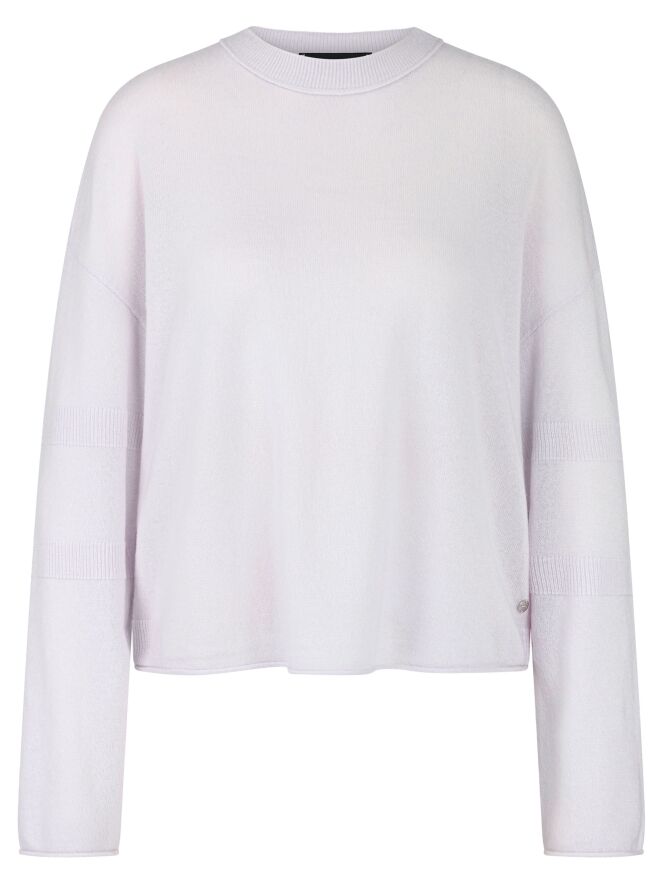Een pullover van Marc Cain in een pastel lila kleur. De pullover heeft een ronde hals en lange mouwen. Net boven en onder de elleboog is een fijn geribbelde, gebreide tricot boord aangebracht. Deze pullover mag met de hand worden gewassen.