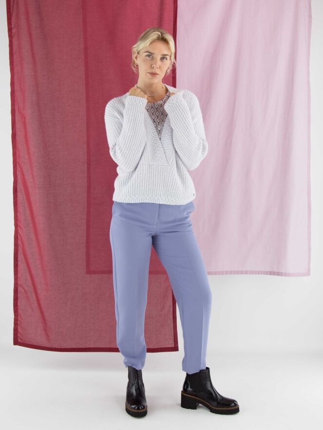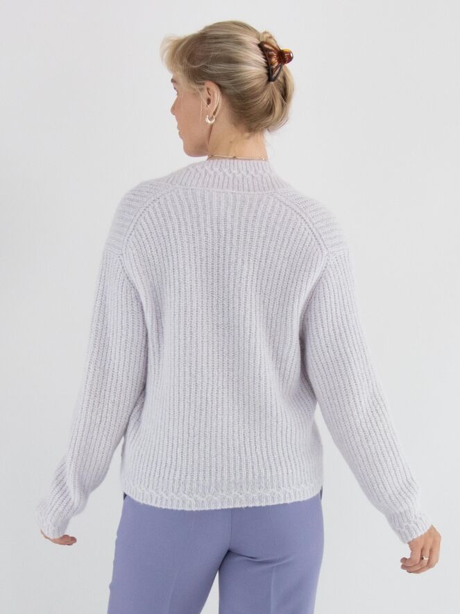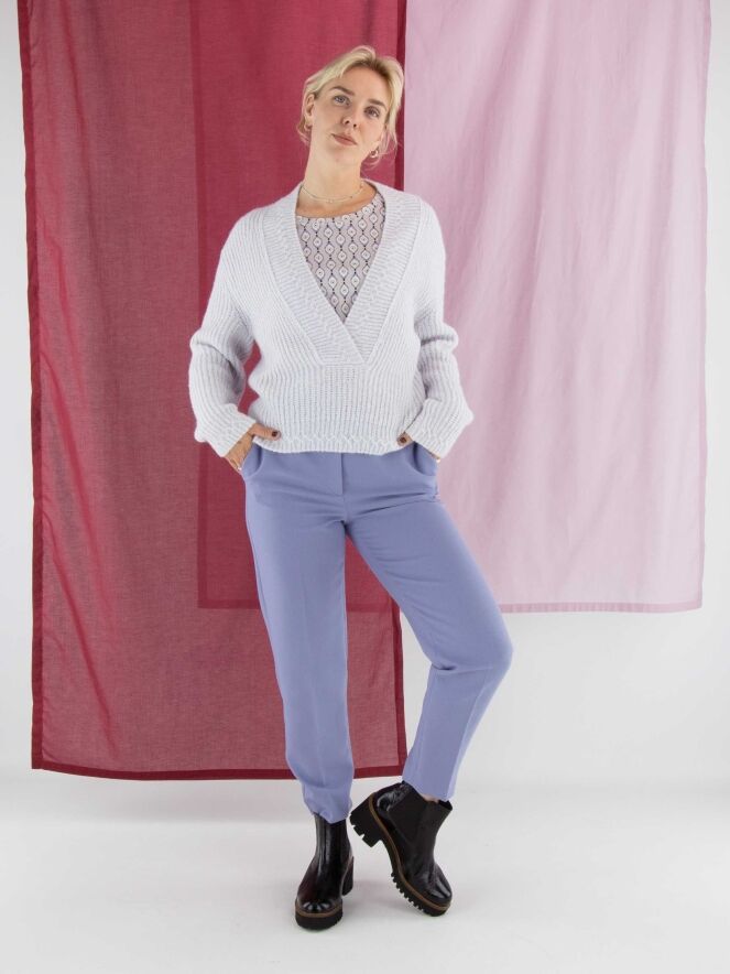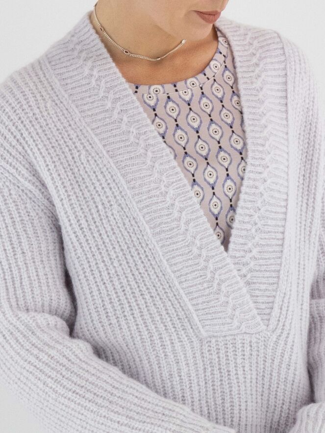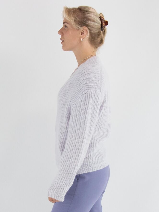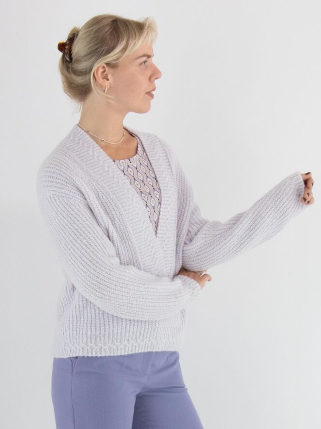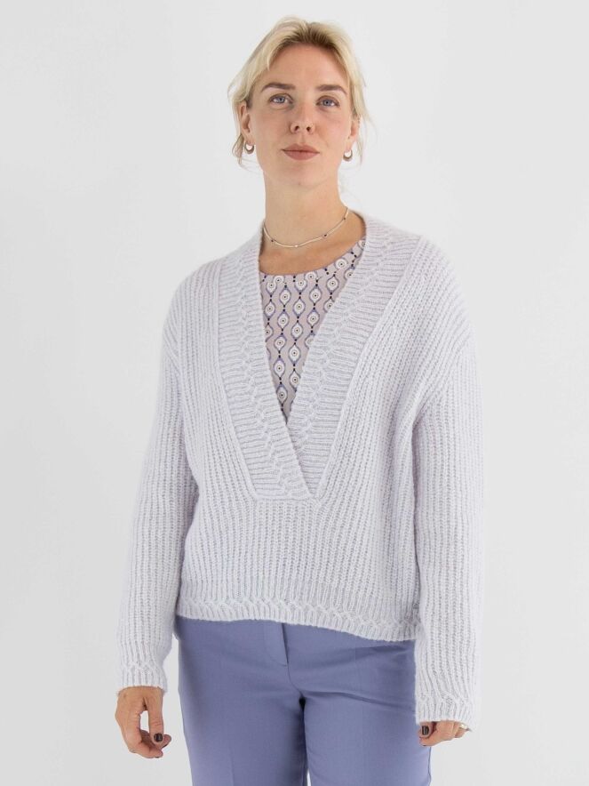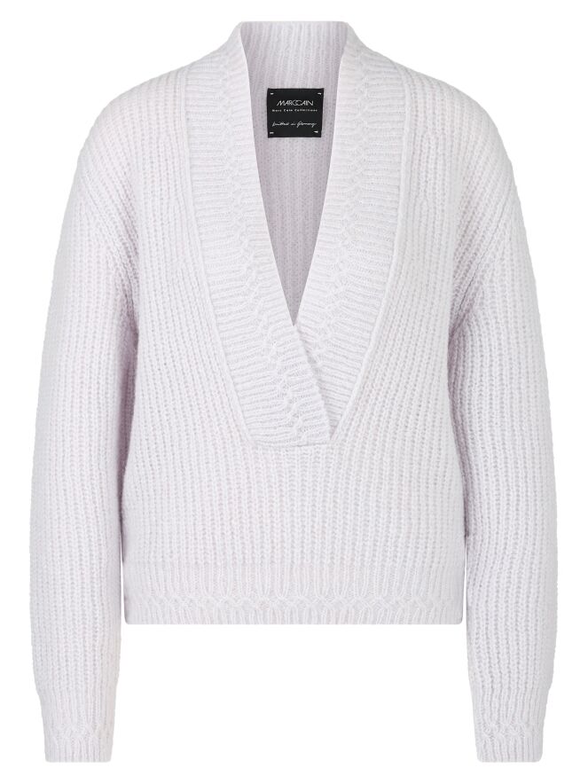 Een korte pullover van Marc Cain in een pastel-lila kleur. De pullover heeft een diepe V-hals met een brede gebreide boord langs de rand. Deze pullover mag met de hand worden gewassen.