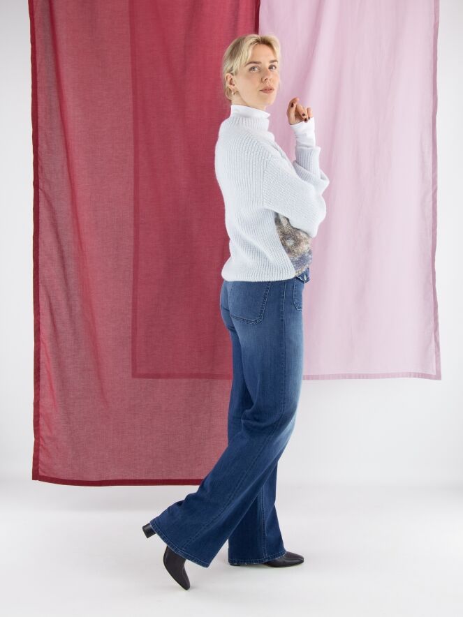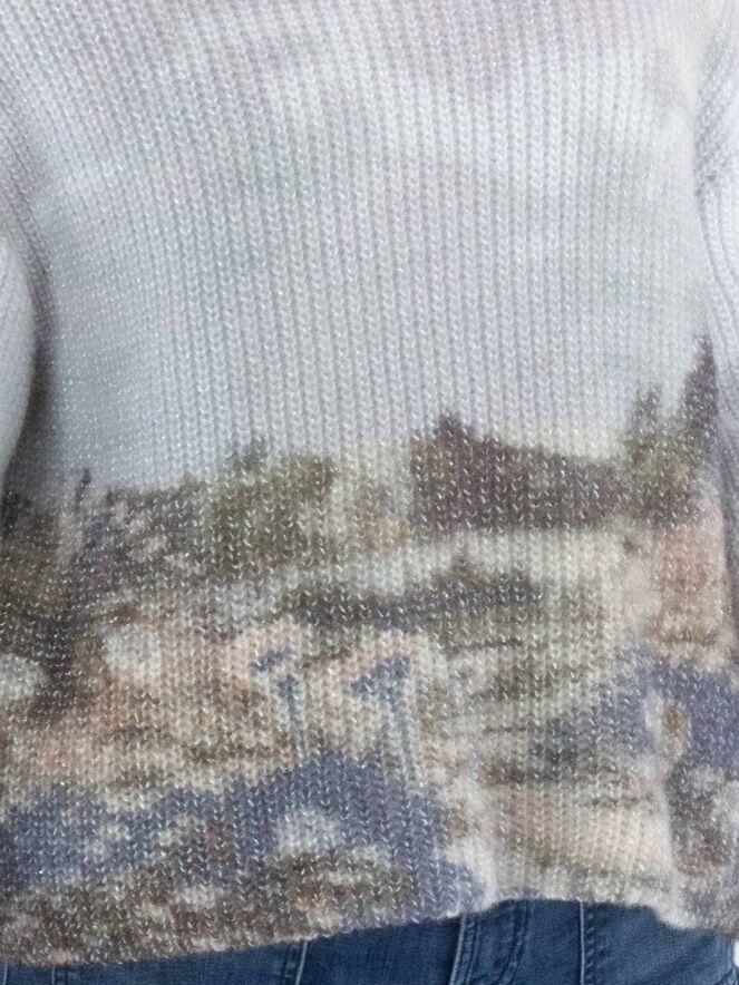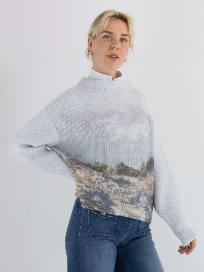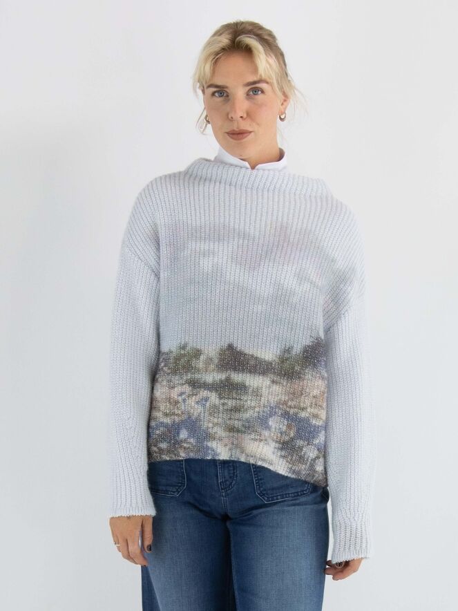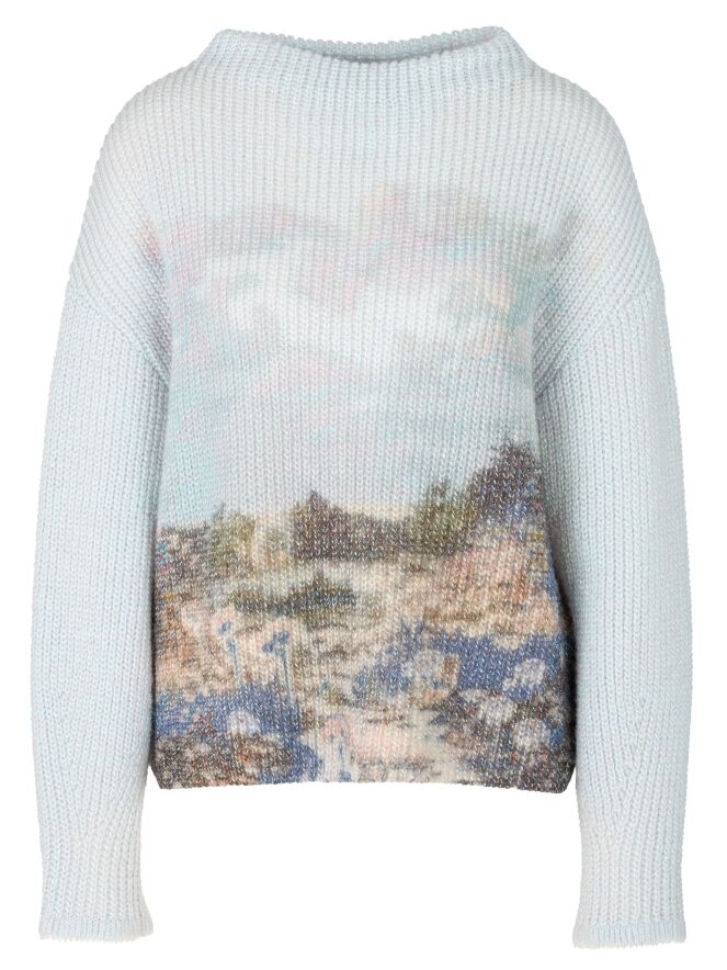 Een pullover van Marc Cain, gebreid in een patentsteek, met een grafische landschapprint in meerdere kleuren op een lichtblauwe achtergrond. De pullover heeft een boothals en lange mouwen. Deze pullover mag met de hand worden gewassen.