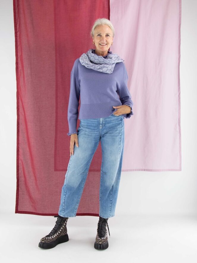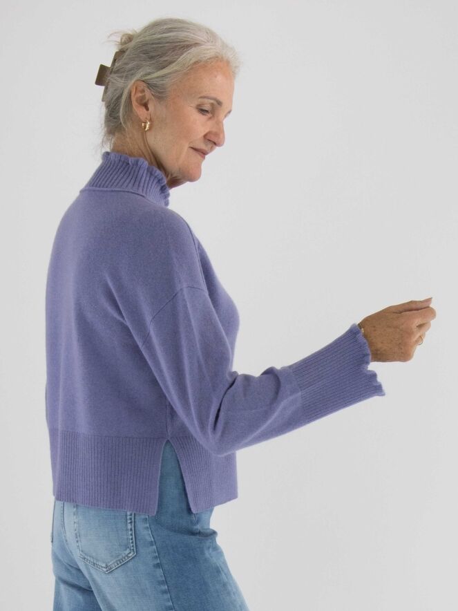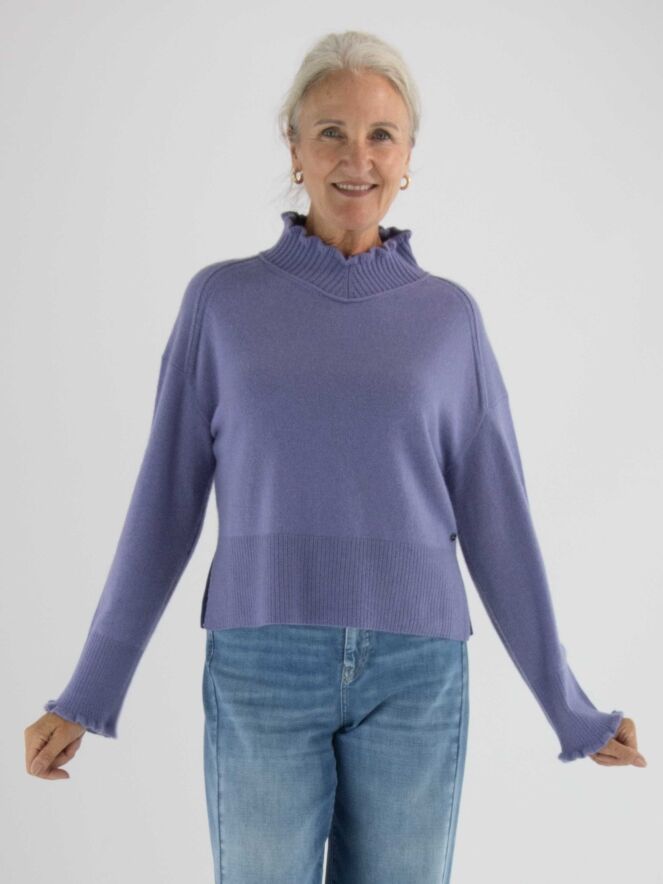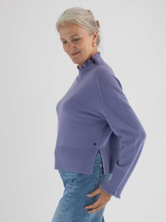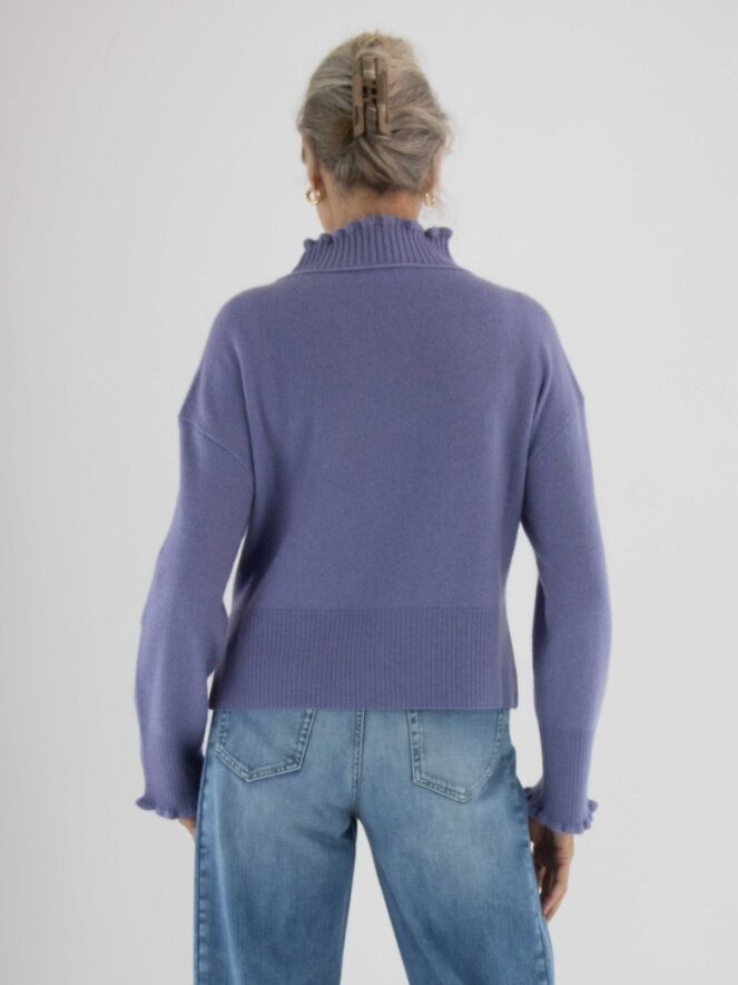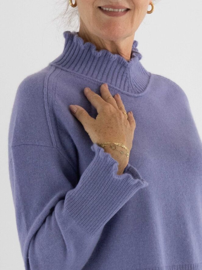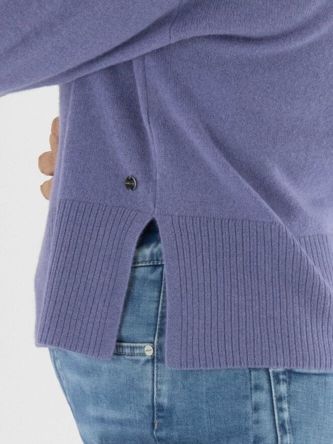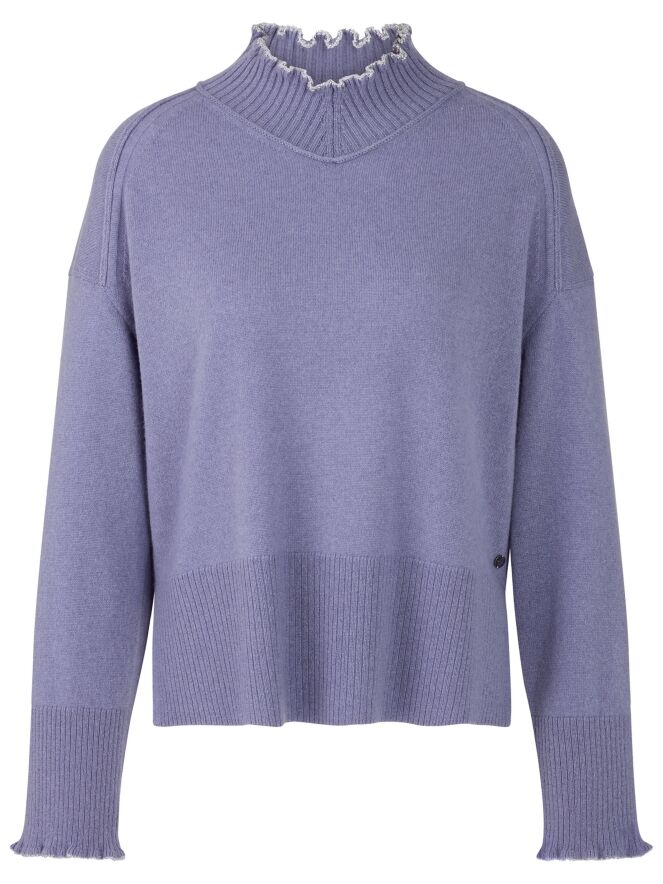 Een pullover van Marc Cain in de kleur lila. De pullover heeft een hoge, vallende turtlehals met een grof geribbelde boord. De randen van de lange mouwen zijn gesmokt. Aan de onderkant bevindt zich een brede geribbelde boord. Deze pullover mag met de hand worden gewassen.