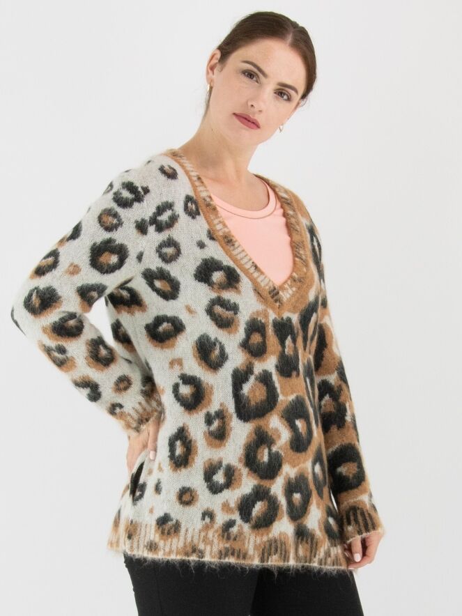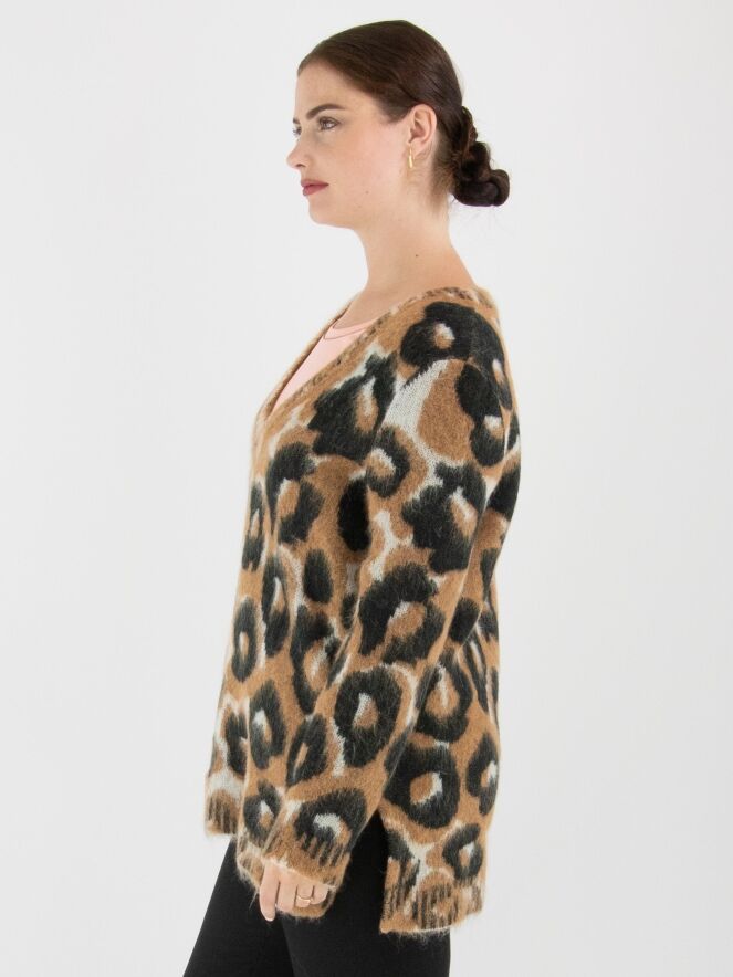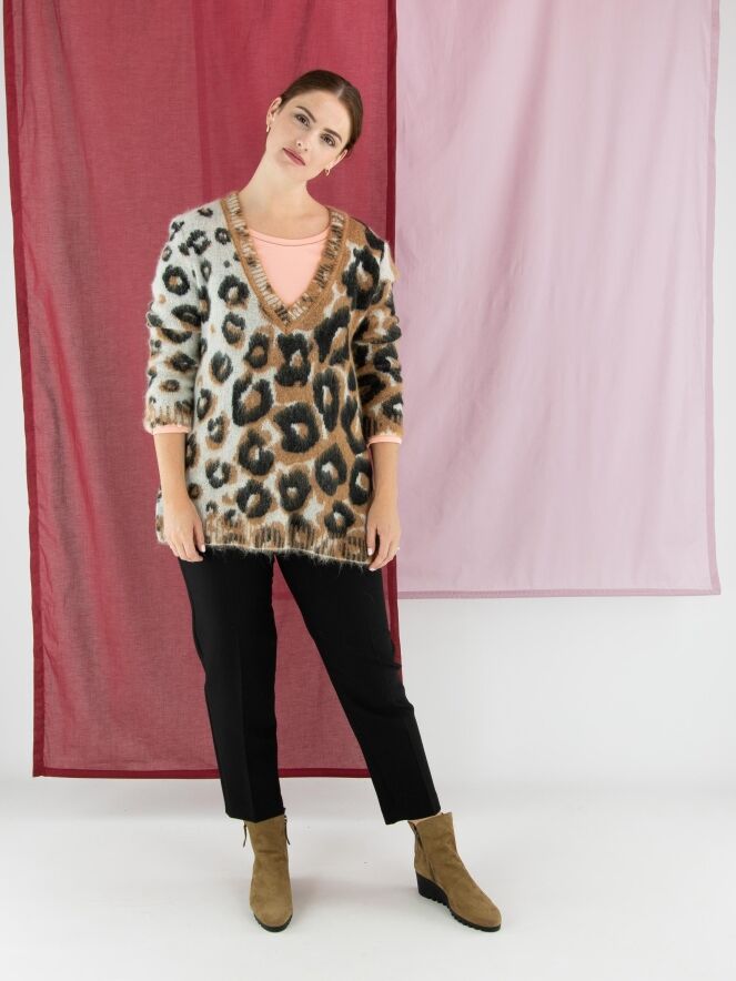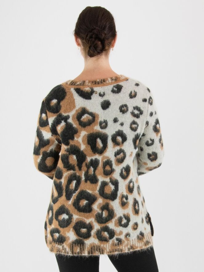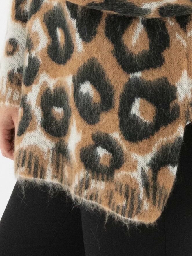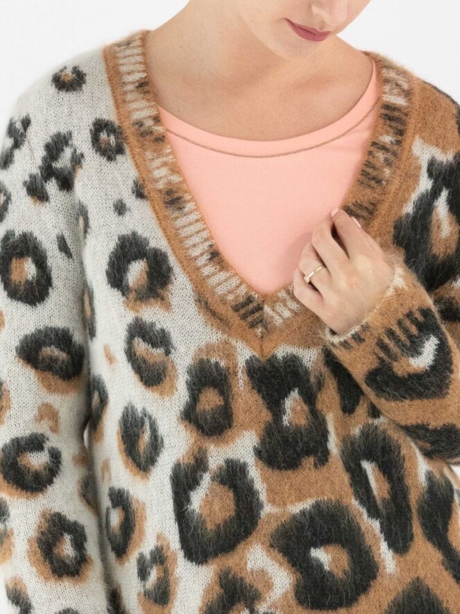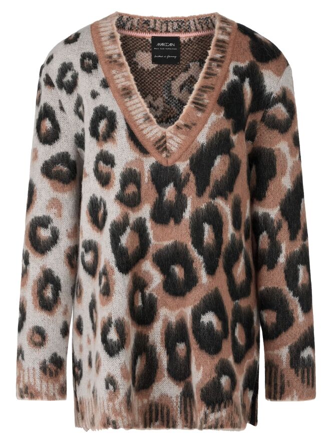 Een luxe pullover van Marc Cain in een panterprint met de kleuren cognac, zwart en beige. De diepe V-hals is afgewerkt met een geribbelde boord langs de rand. Deze pullover mag met de hand worden gewassen.