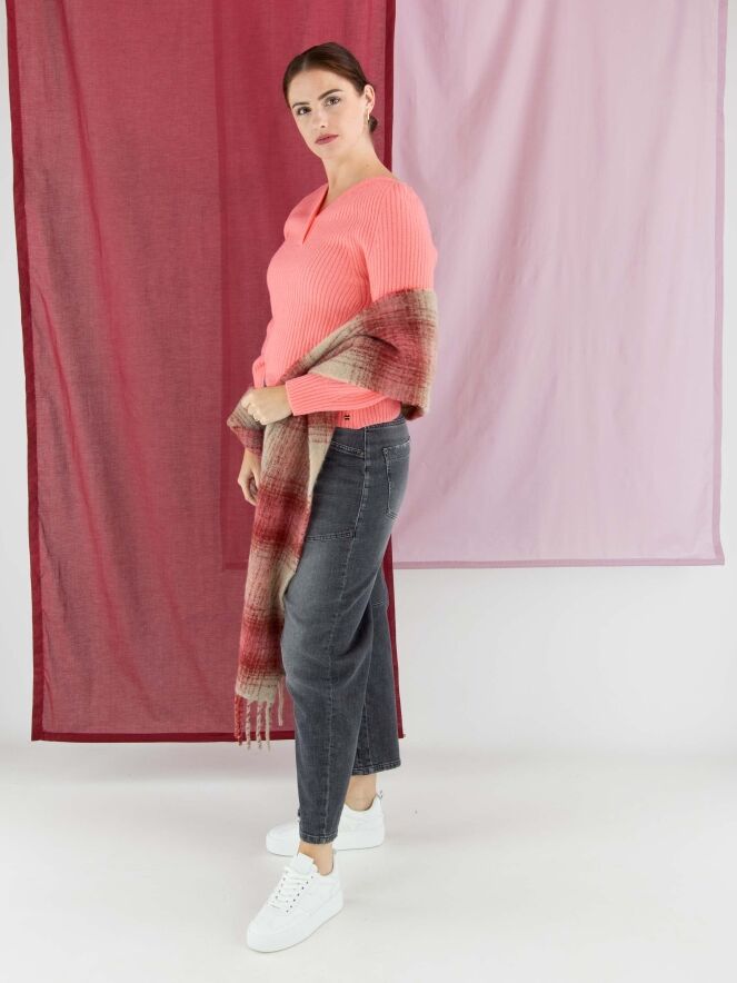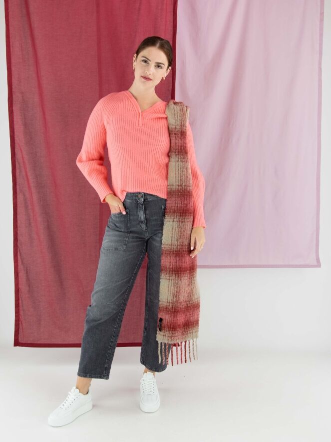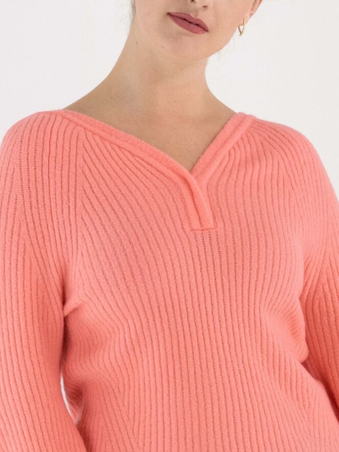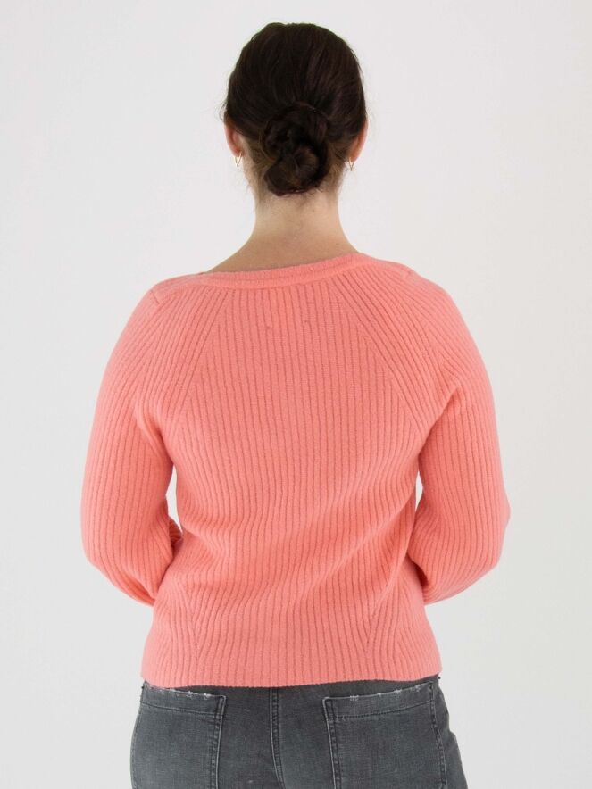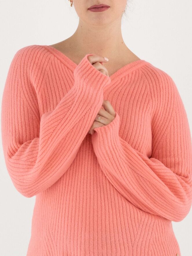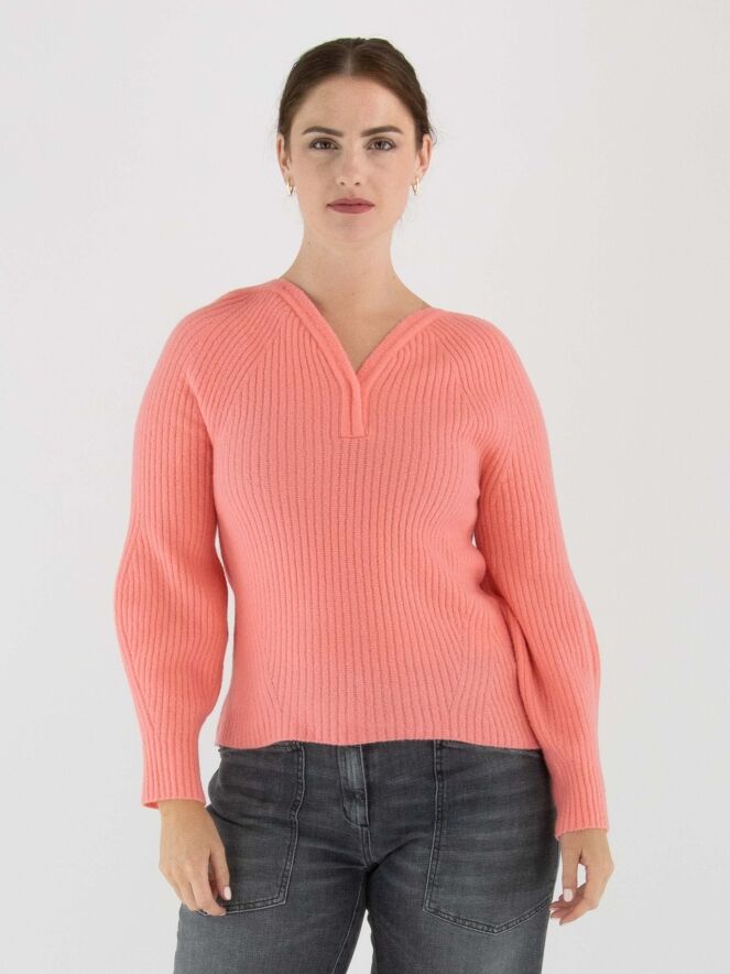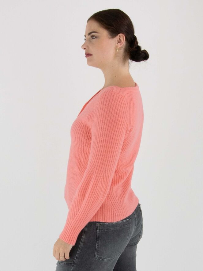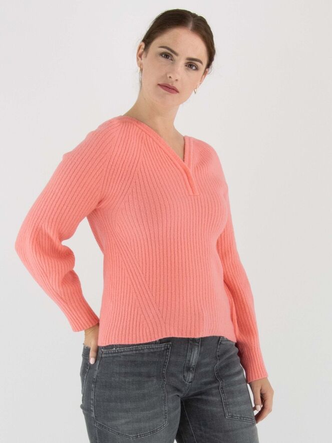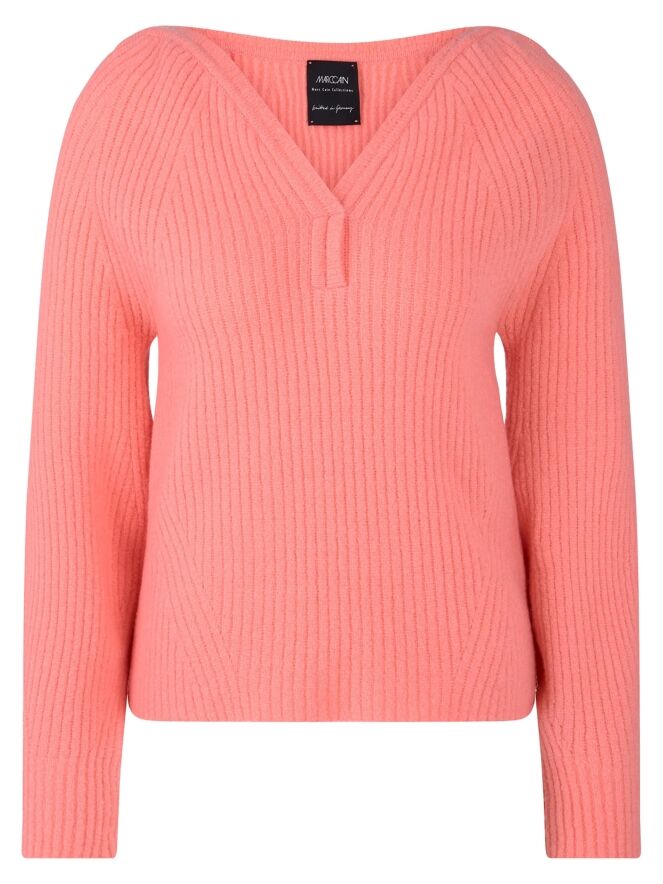 Een pullover van Marc Cain in een geribbelde structuur in een zalmroze kleur. De V-hals heeft een afgeronde vorm. Deze pullover mag met de hand worden gewassen.