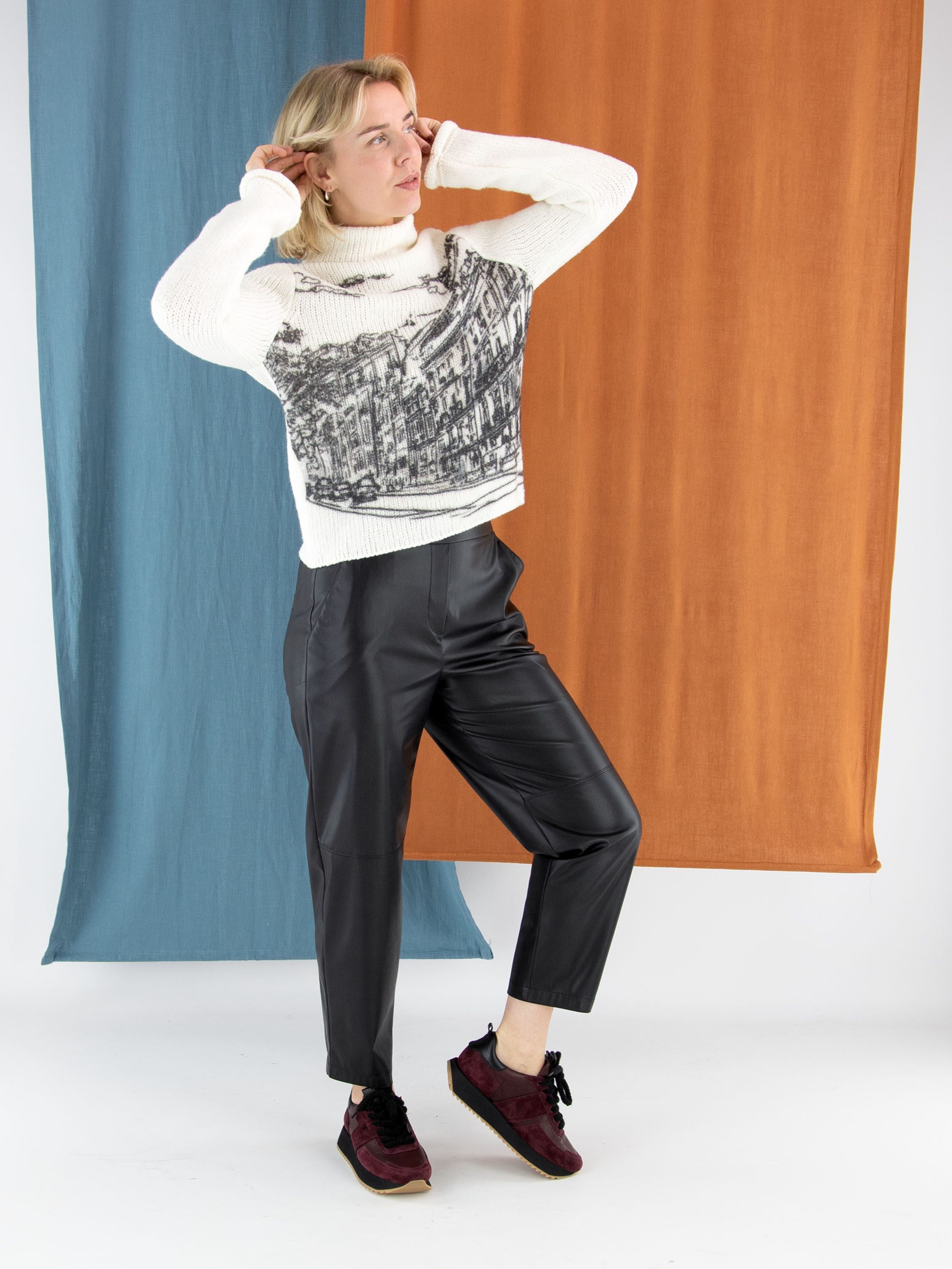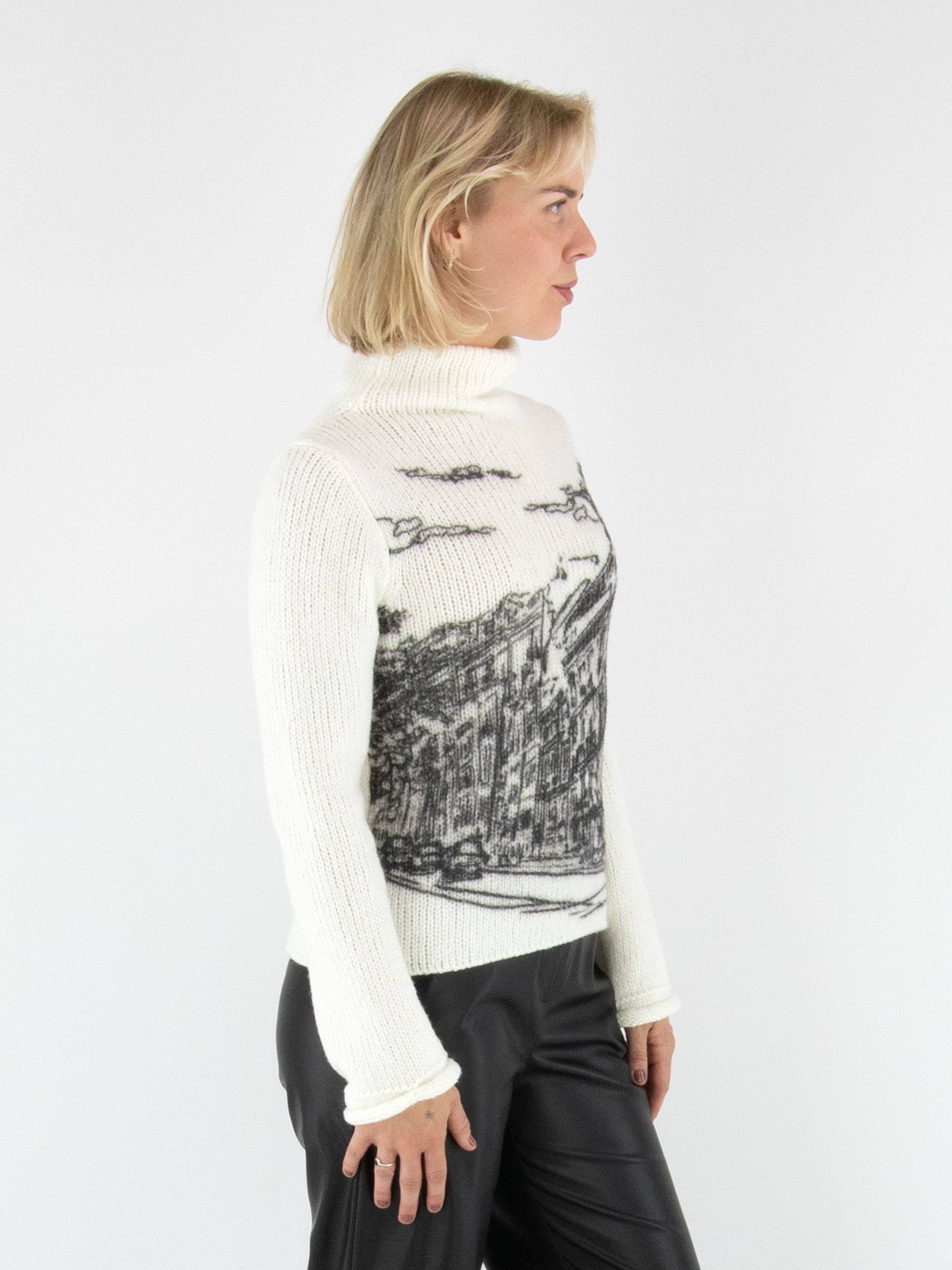 Deze stijlvolle pullover van Marc Cain is aan de voorzijde uitgevoerd met een dessin van een schets van een gebouw in zwart op een roomwitte achtergrond. De achterzijde is in een uni roomwitte kleur. De pullover heeft een elegante vallende col en kan met de hand worden gewassen.