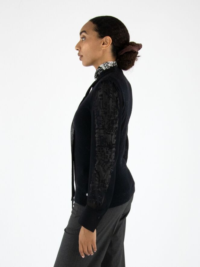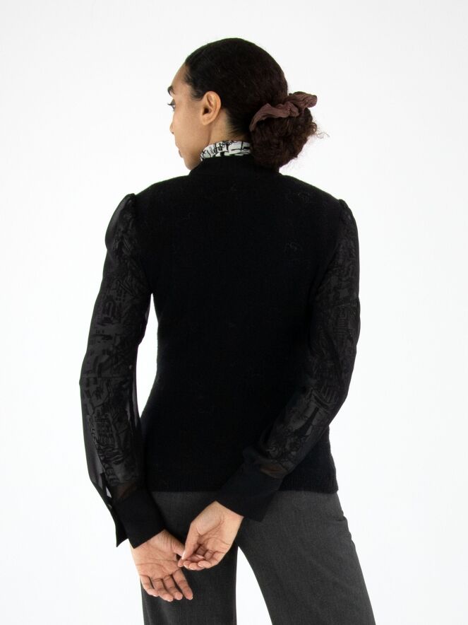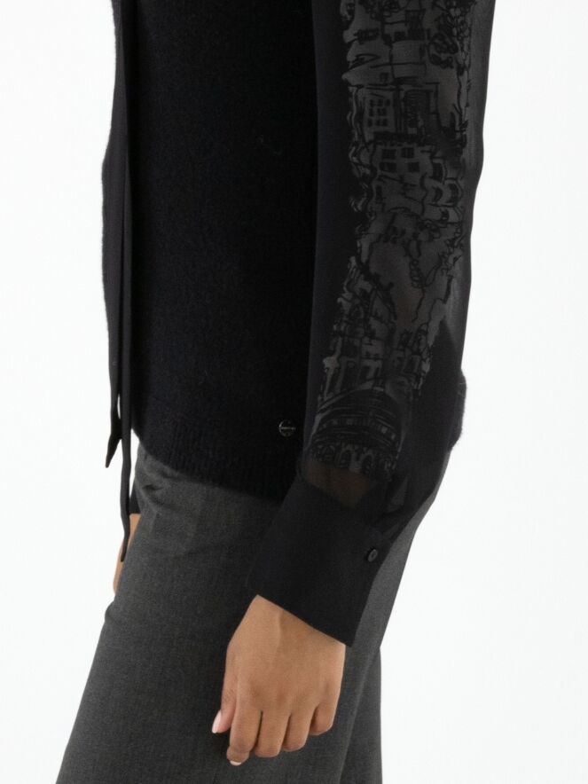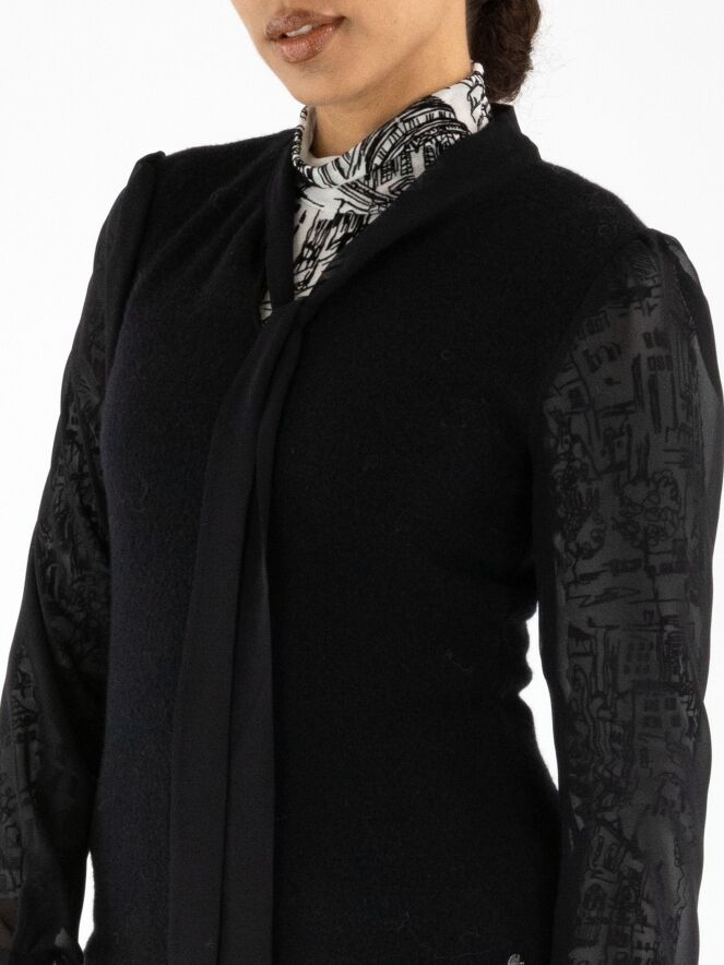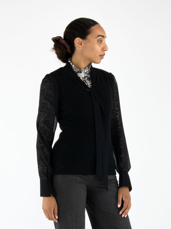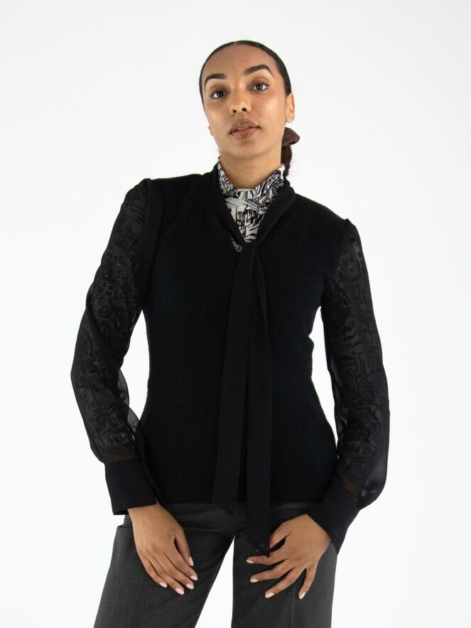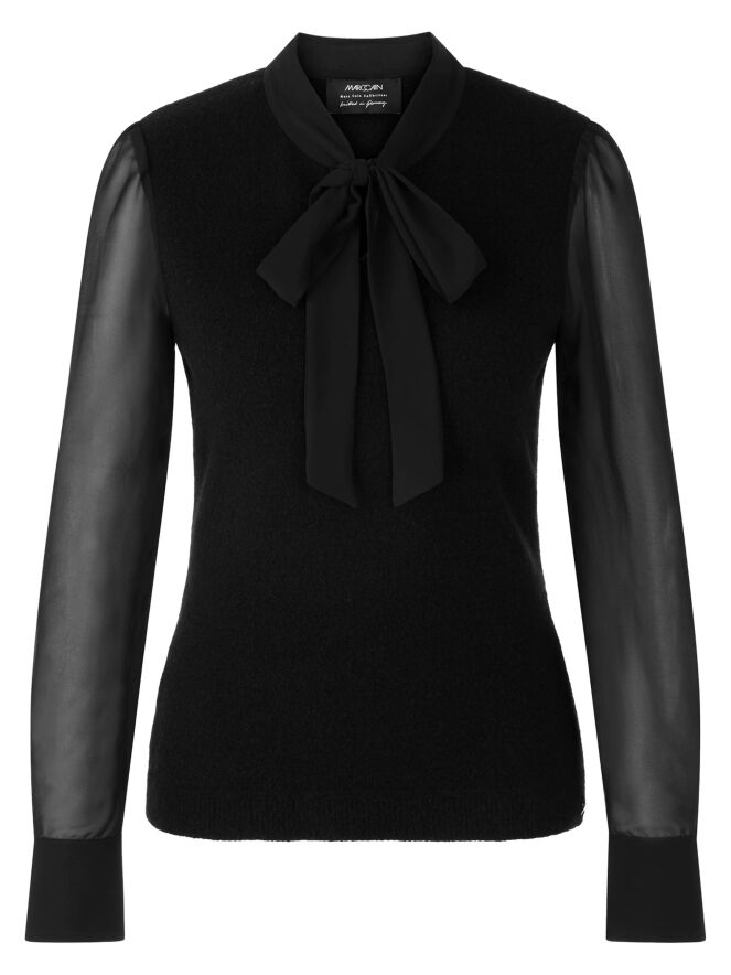 Een luxe pullover van Marc Cain in de kleur zwart. Vanuit de kraag van de V-hals lopen twee decoratieve lange linten die gestrikt kunnen worden. De lange mouwen zijn uitgevoerd in een transparante zwarte stof. Deze pullover mag met de hand worden gewassen.