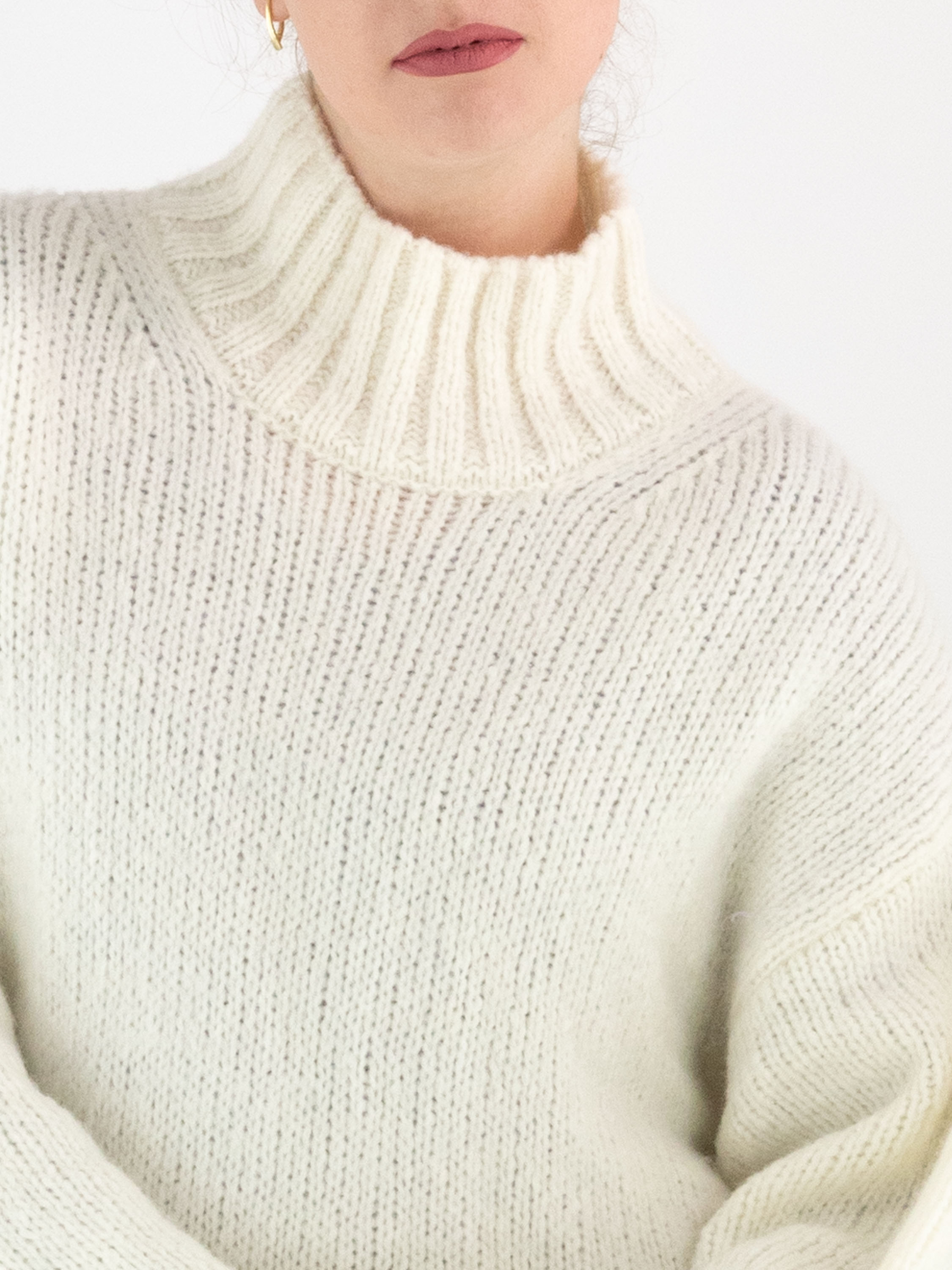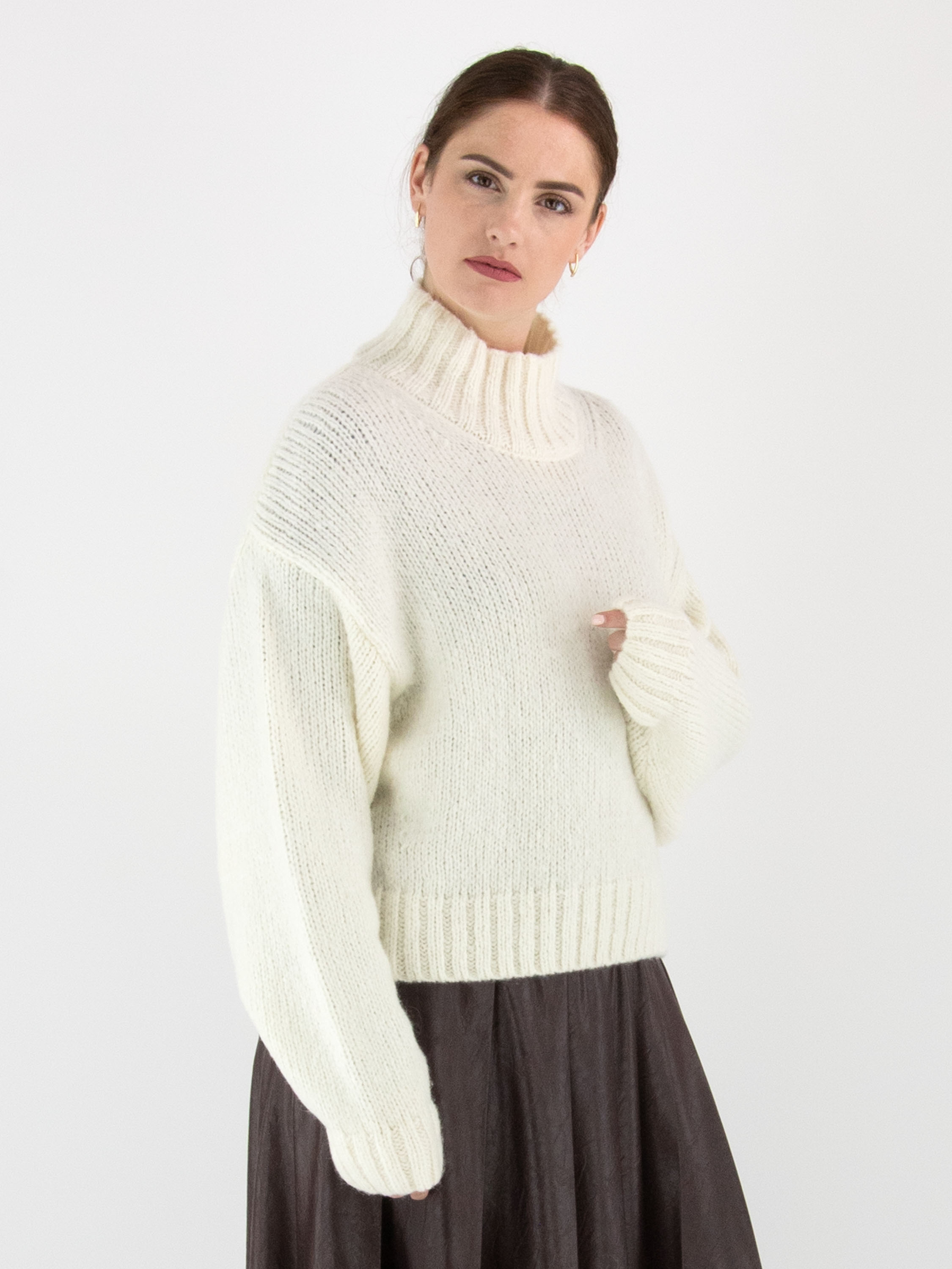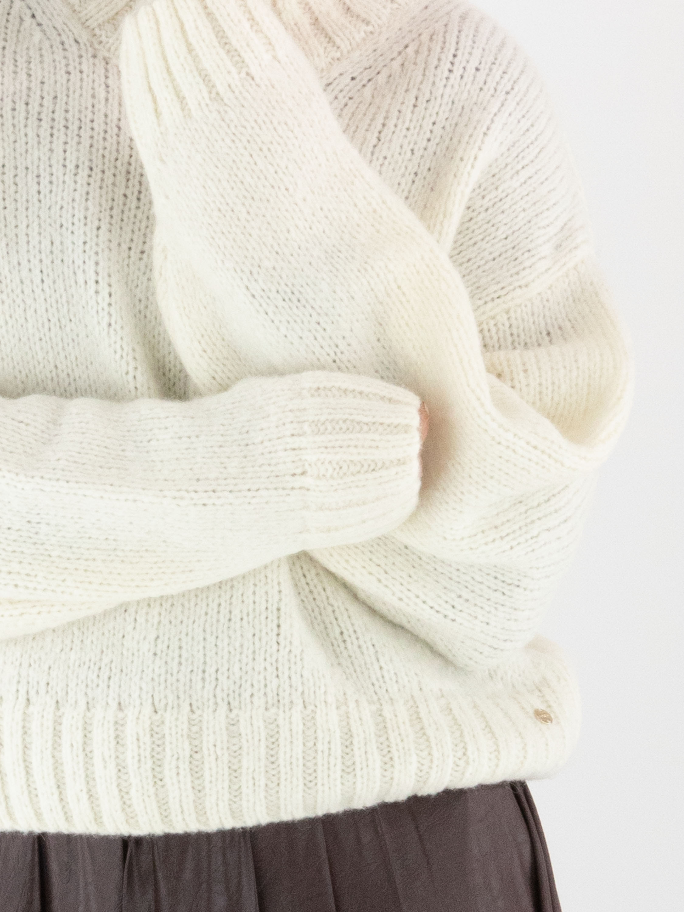 Een pullover van Marc Cain in de kleur roomwit. De rand van de turtle hals, de uiteinden van de lange mouwen en de onderkant zijn afgewerkt met een grofgebreid ribbelpatroon. Deze pullover mag met de hand worden gewassen.