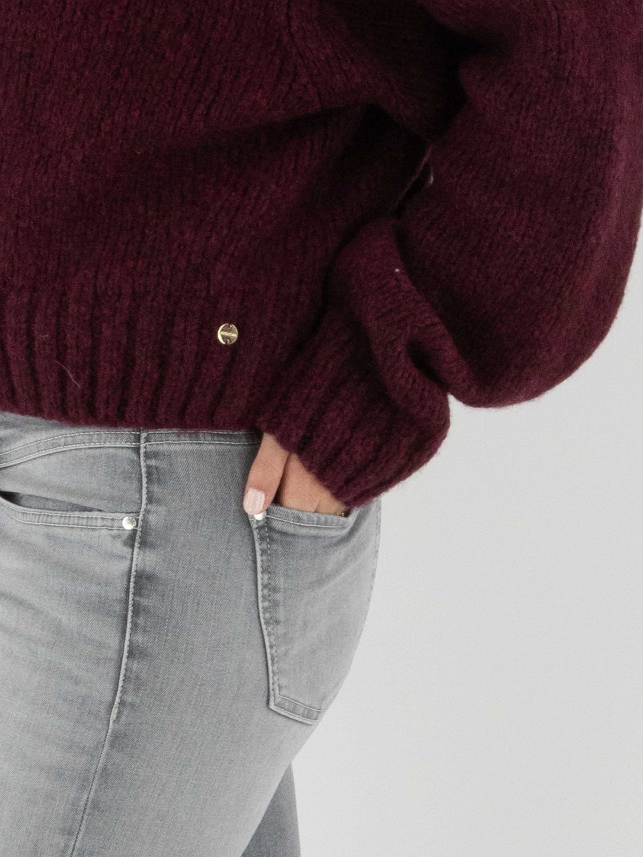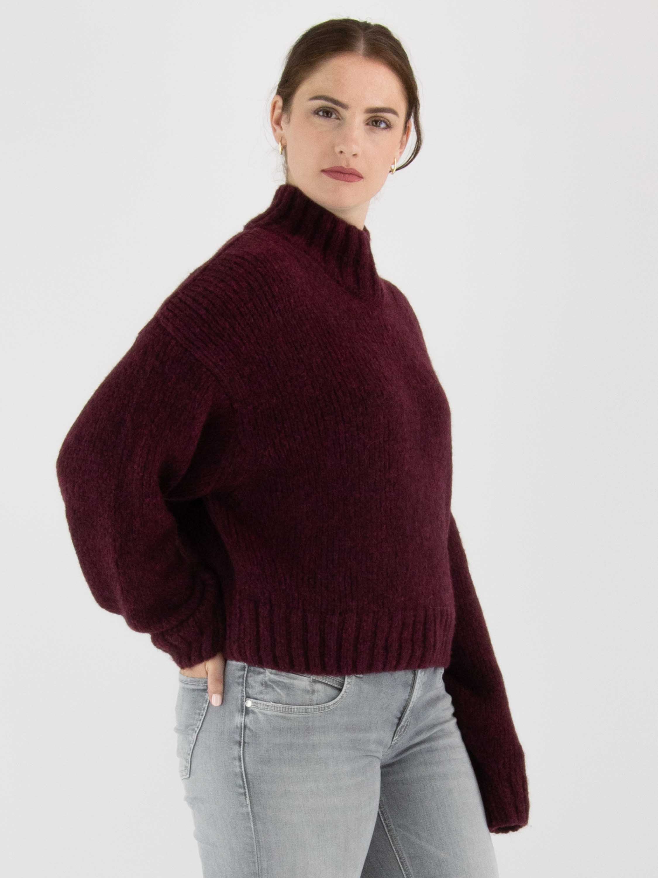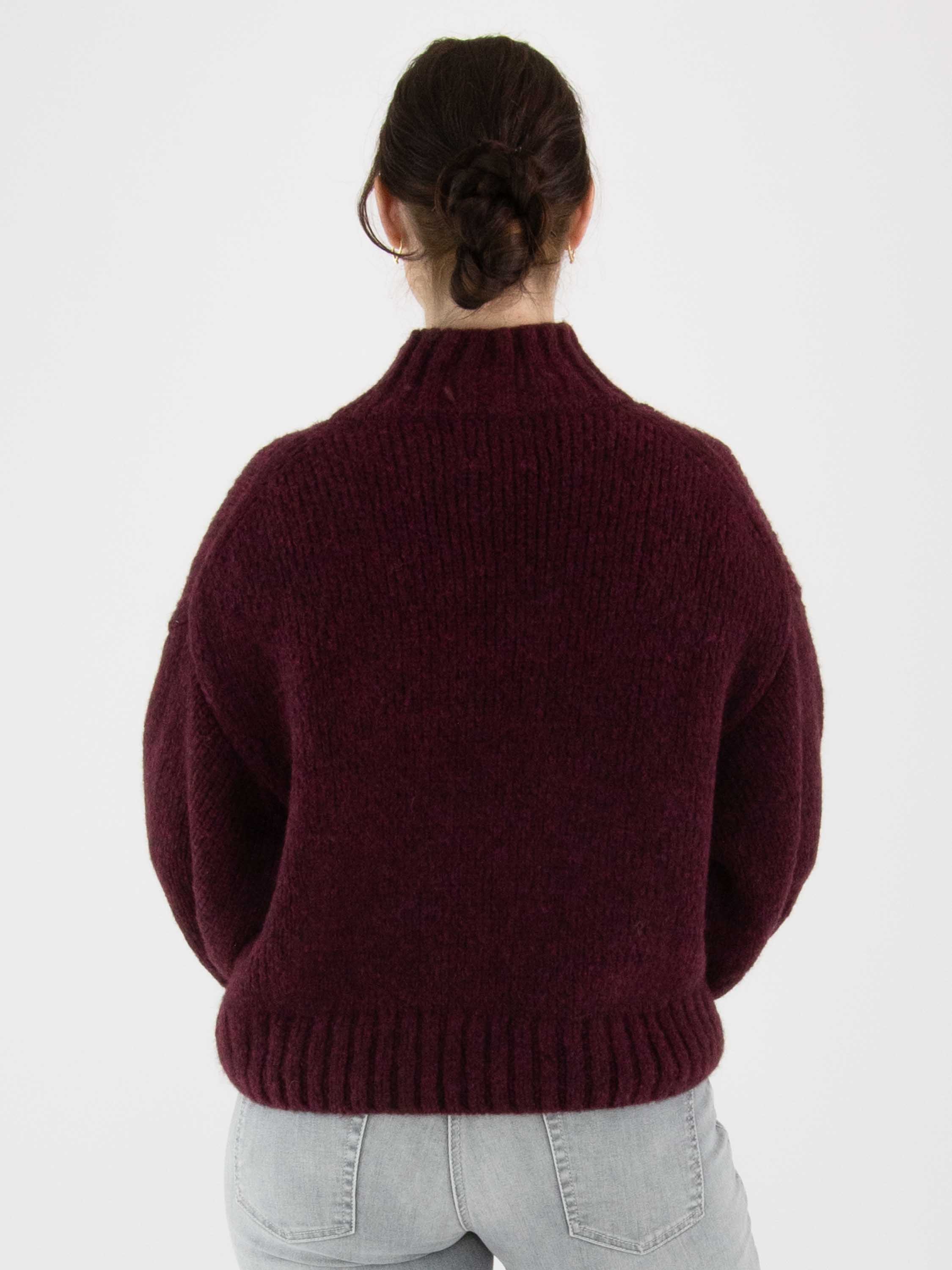 Een pullover van Marc Cain in de kleur aubergine. De rand van de turtle hals, de uiteinden van de lange mouwen en de onderkant zijn afgewerkt met een grofgebreid ribpatroon. Deze pullover mag met de hand worden gewassen.