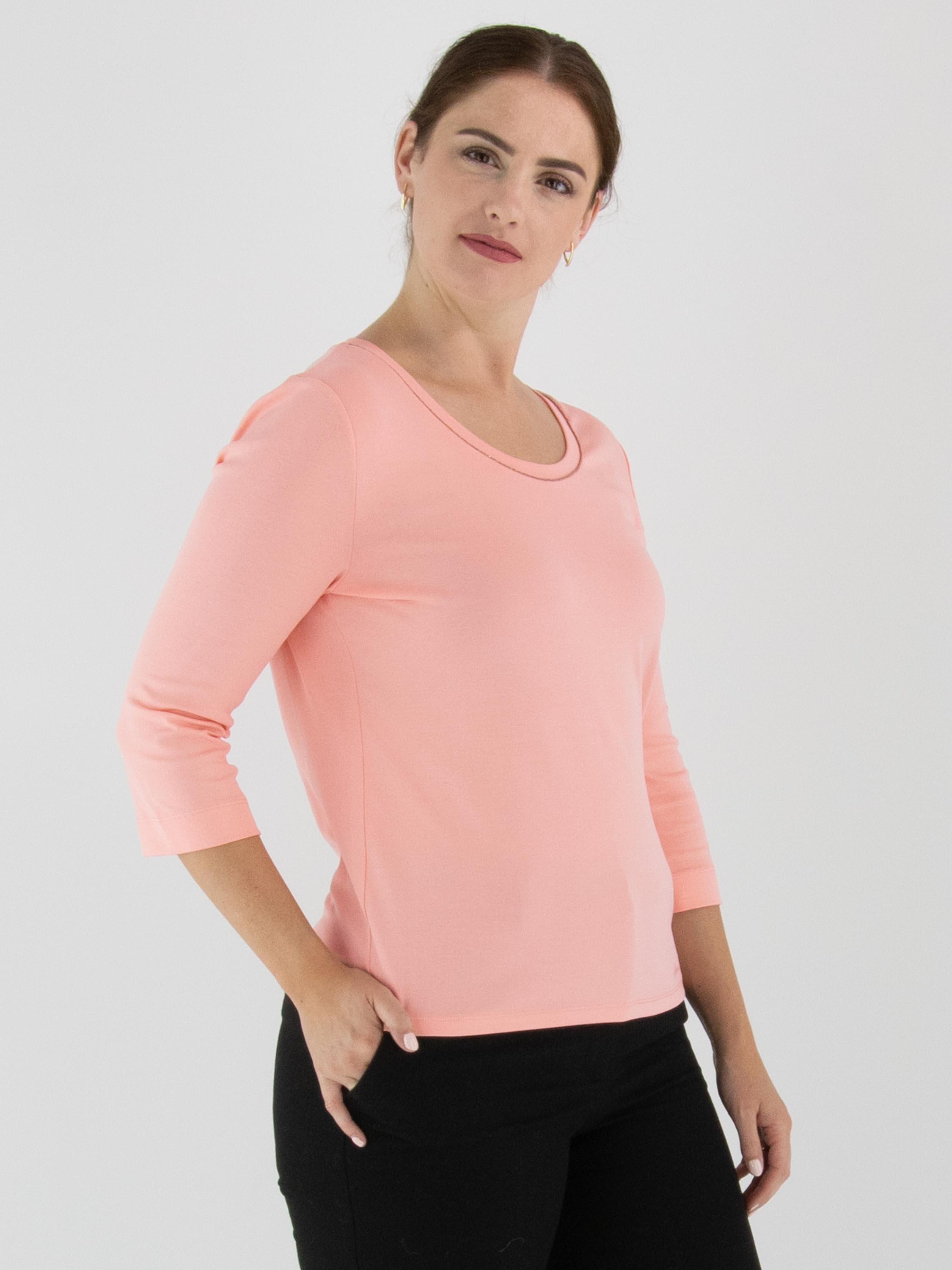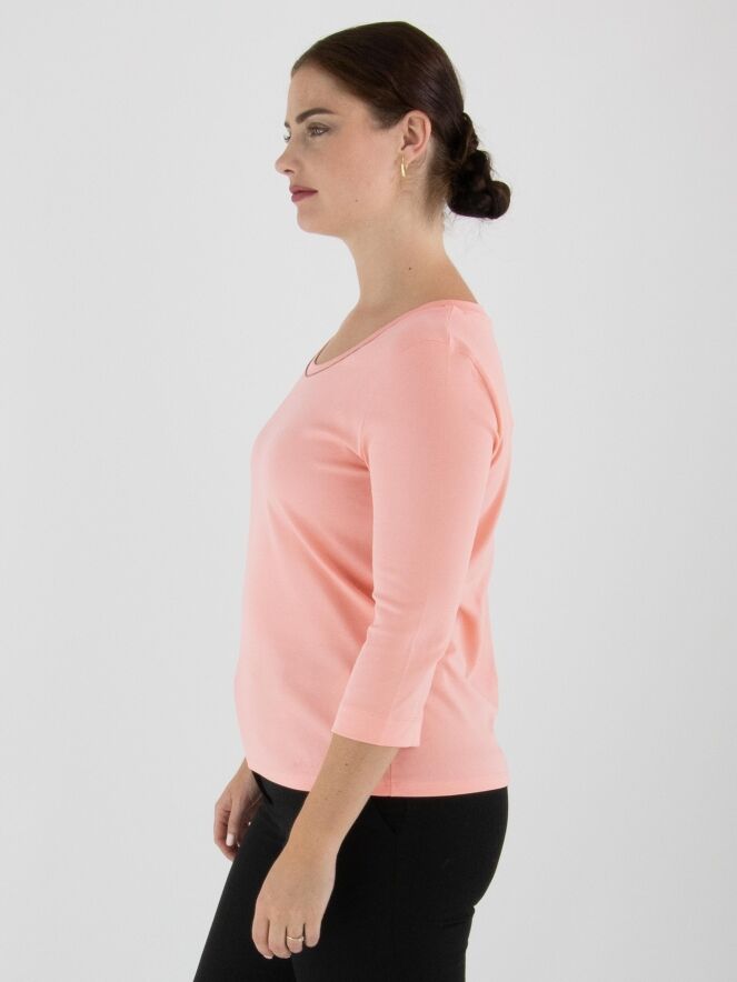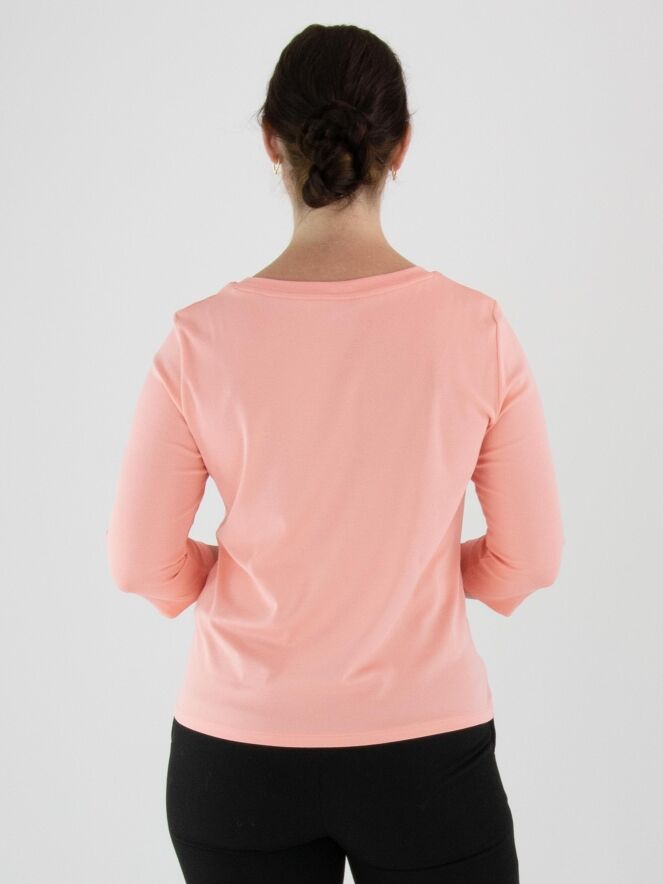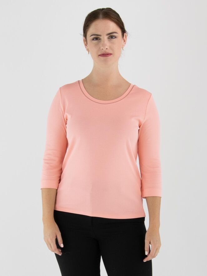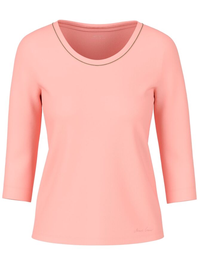 Een shirt van Marc Cain in de kleur zalmroze. Het shirt heeft halflange mouwen en een ronde hals. Langs de rand van de hals loopt een verfijnde bies met strassteentjes. Dit shirt mag op 30 graden worden gewassen.
