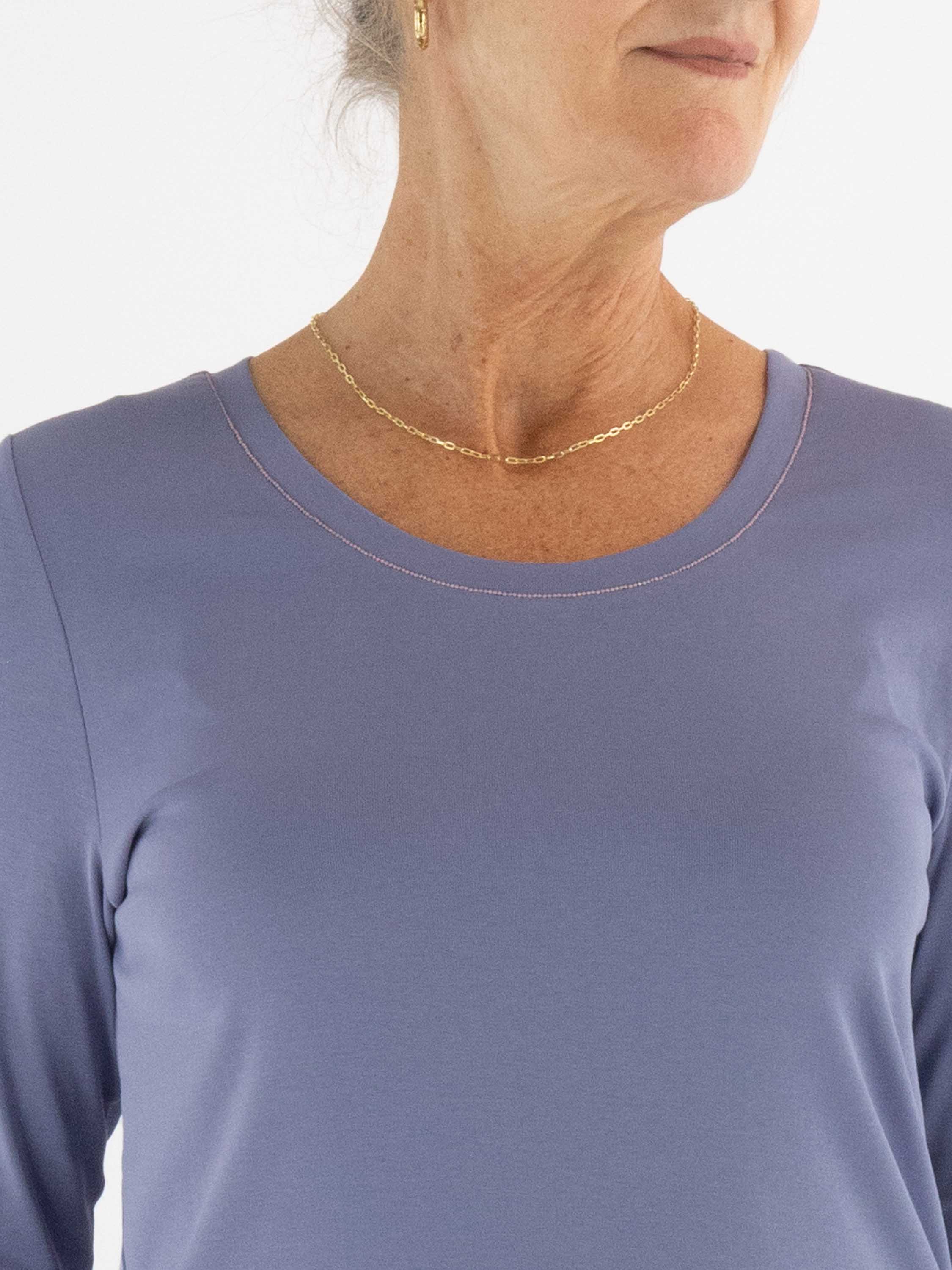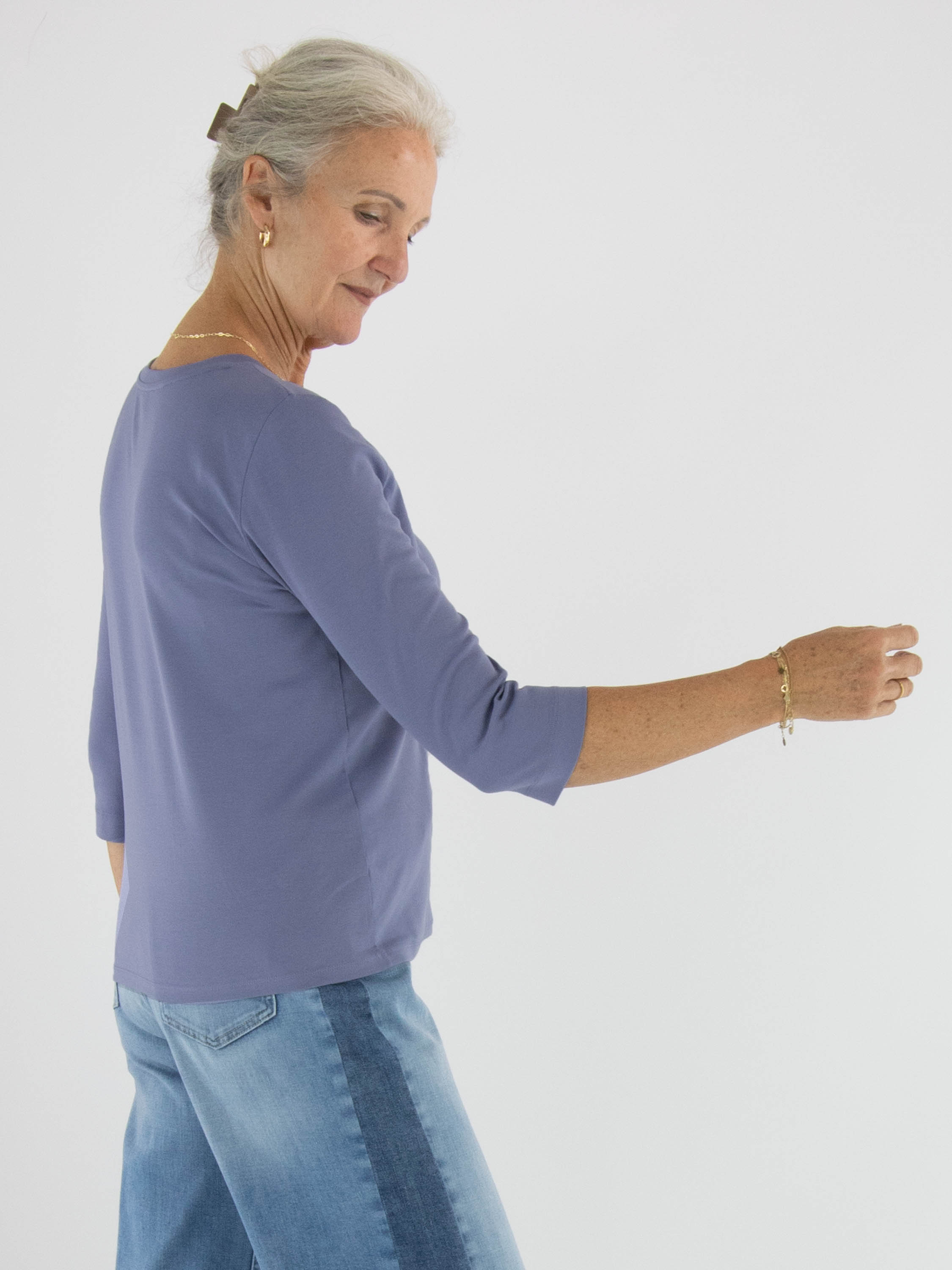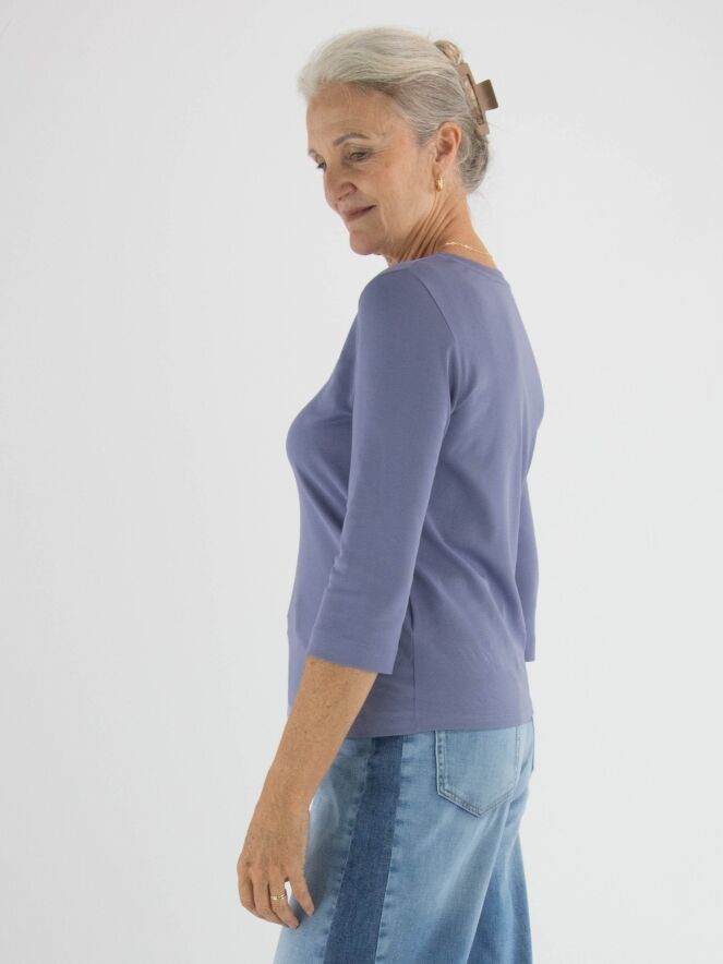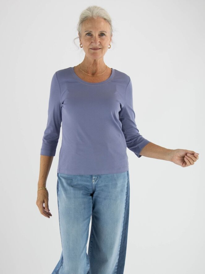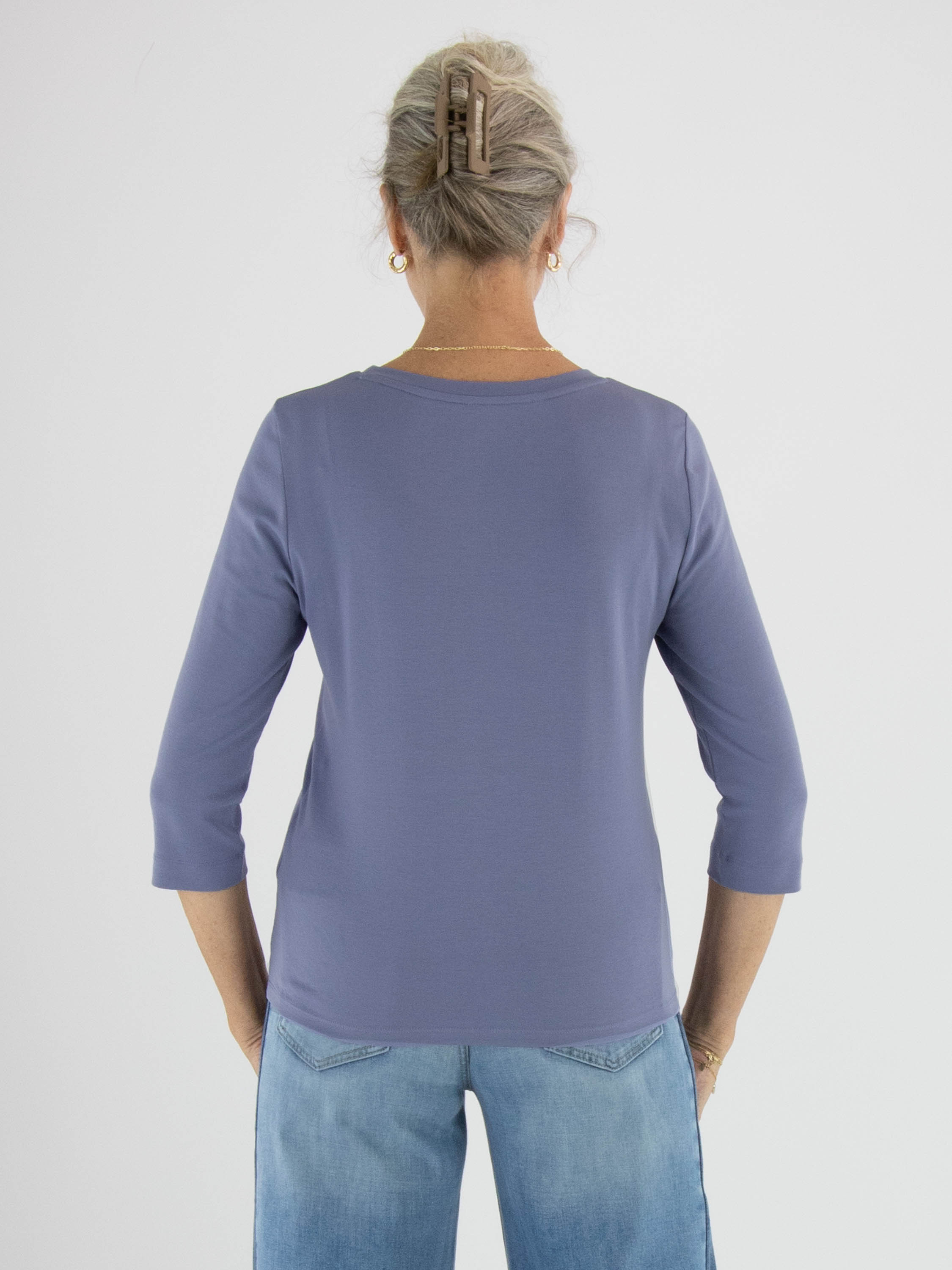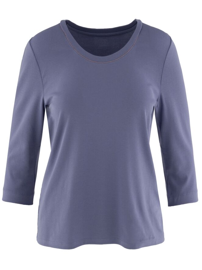 Een shirt van Marc Cain in de kleur lila. Het shirt heeft halflange mouwen en een ronde hals. Langs de rand van de hals loopt een strassbies. Dit shirt mag op 30 graden worden gewassen.