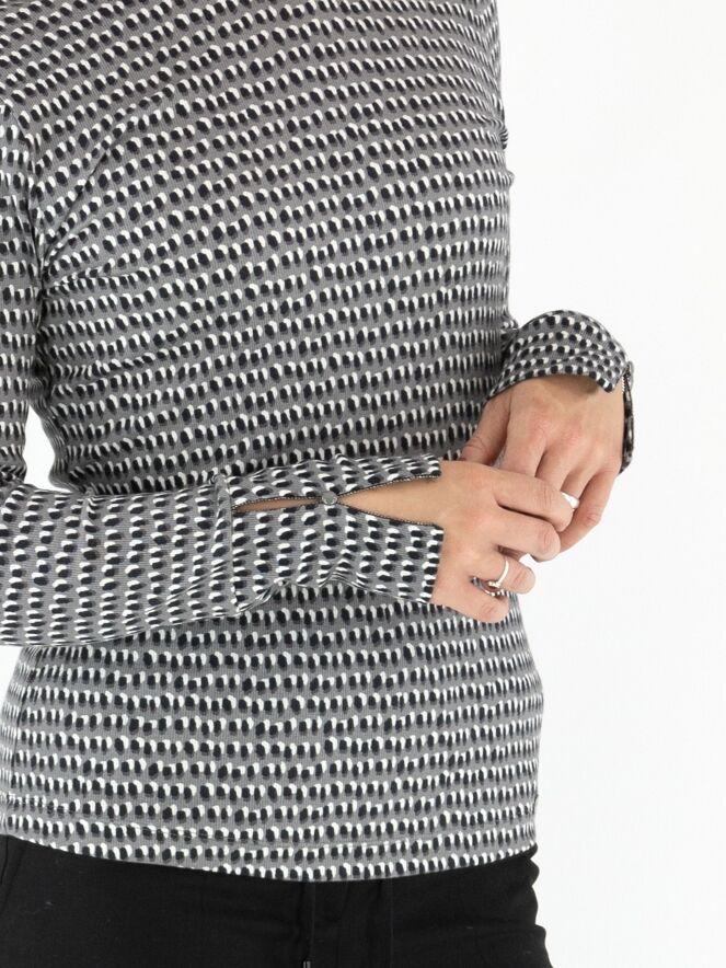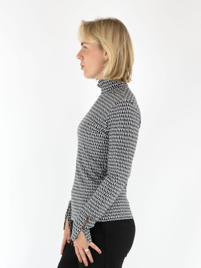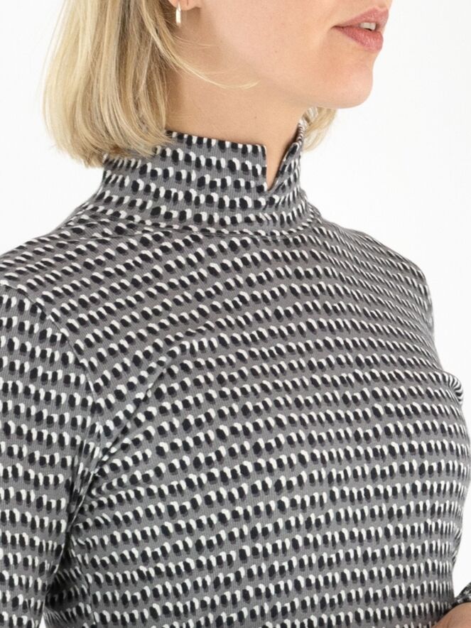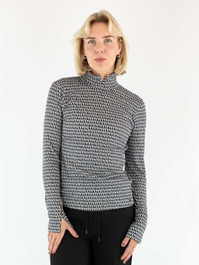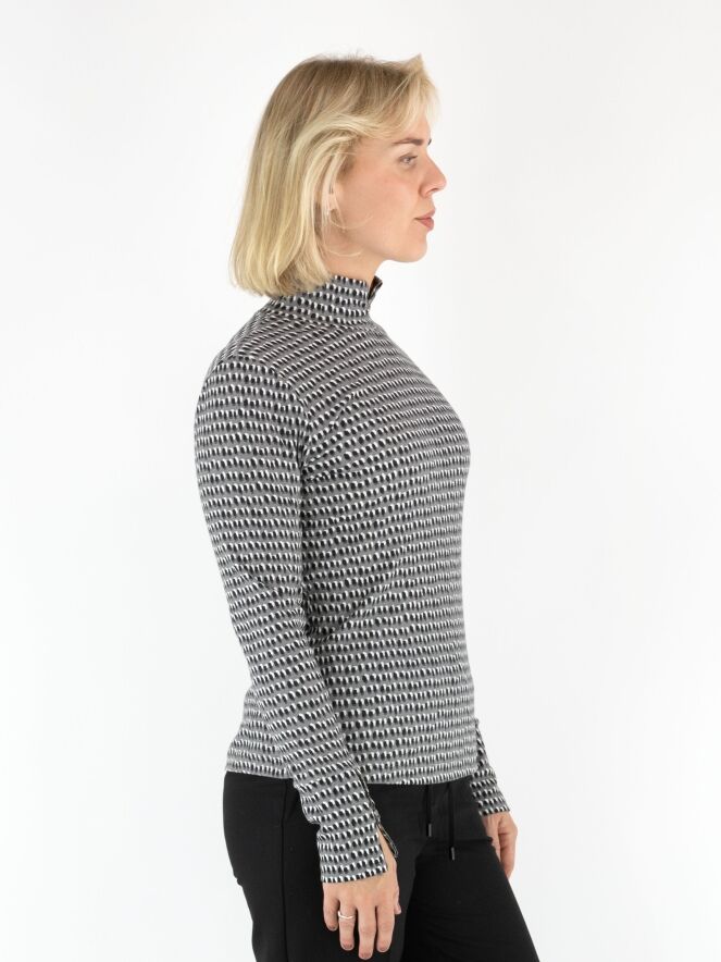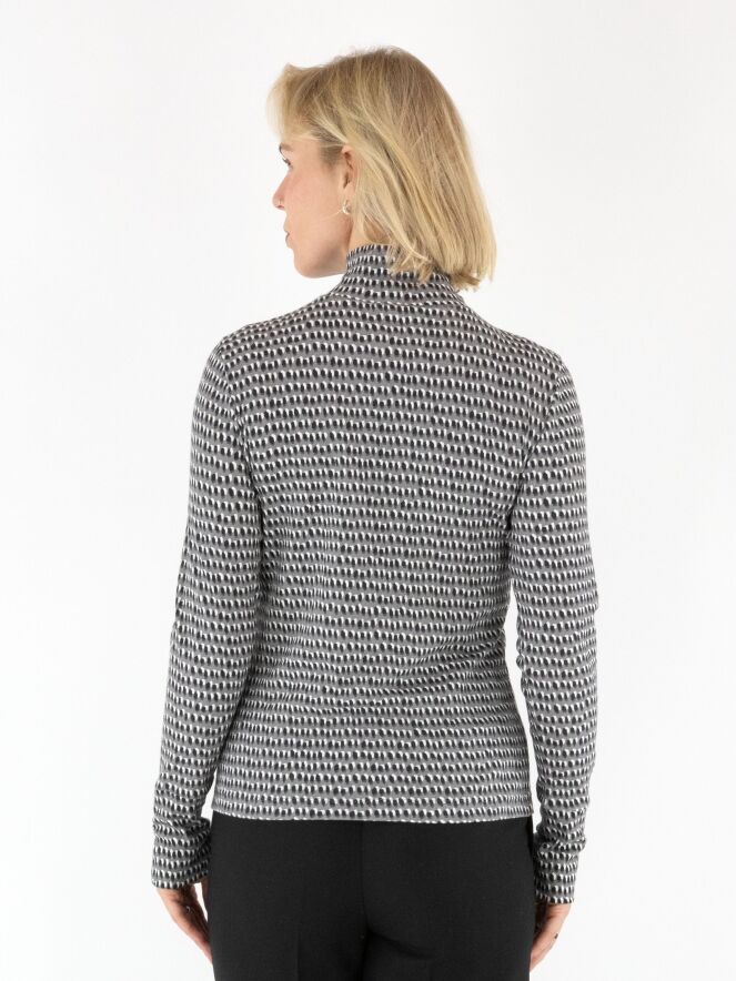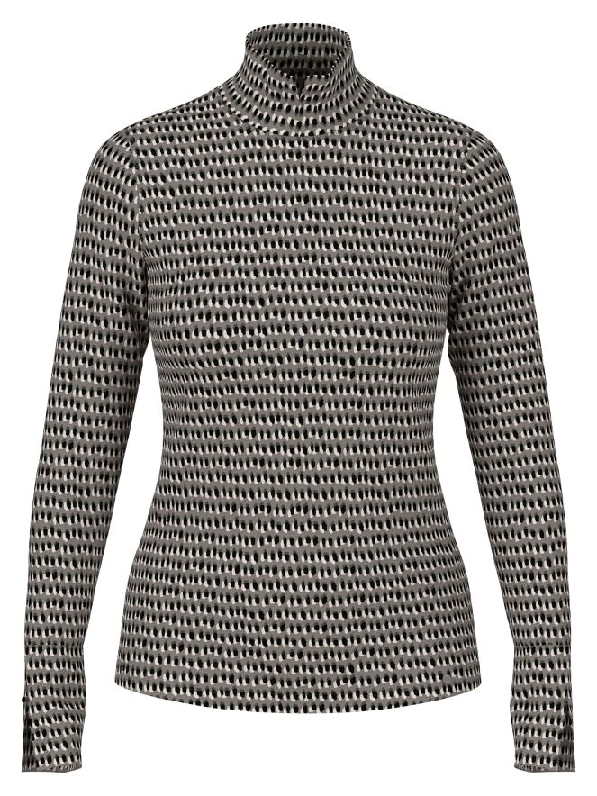 Een fijn geribbeld shirt van Marc Cain in een stippenprint met zwart en roomwit op een lichtgrijze achtergrond. Het shirt heeft een turtlehals en lange mouwen. Dit shirt mag op 30 graden worden gewassen.