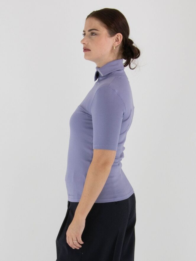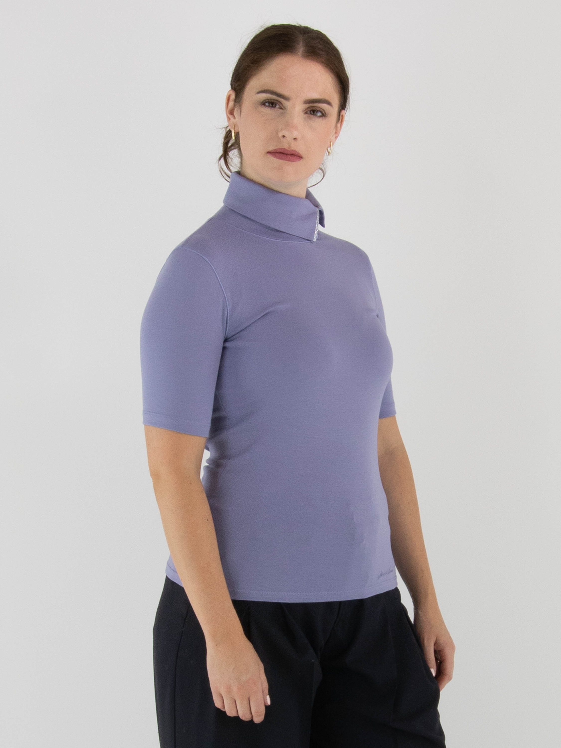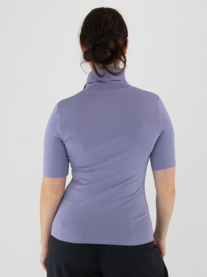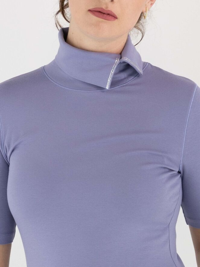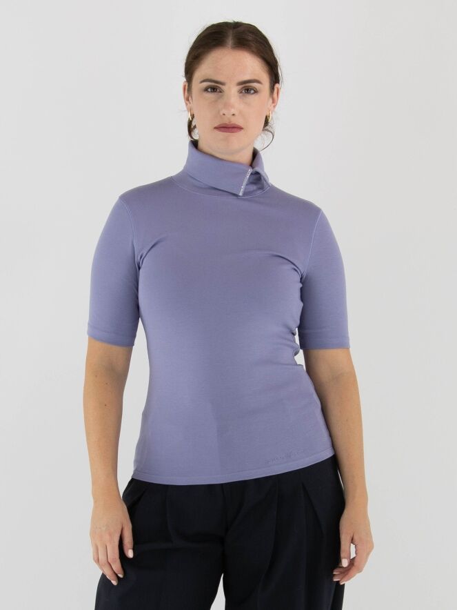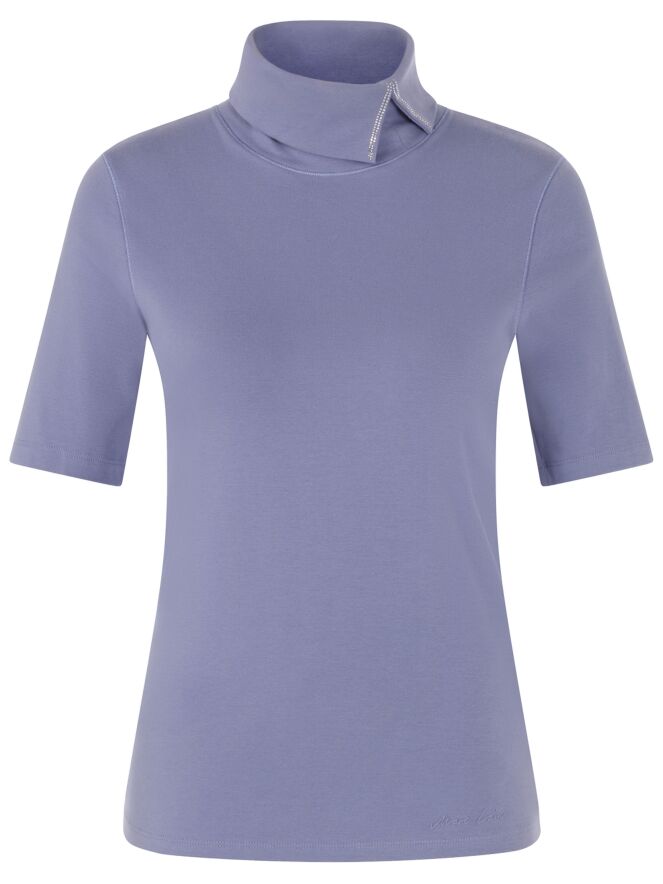 Een shirt van Marc Cain in een lila kleur. Het shirt heeft korte mouwen en een turtlehals met een splitje links van het midden aan de voorkant. Langs de rand van het splitje zijn decoratieve strassteentjes verwerkt. Dit shirt mag op 30 graden worden gewassen.