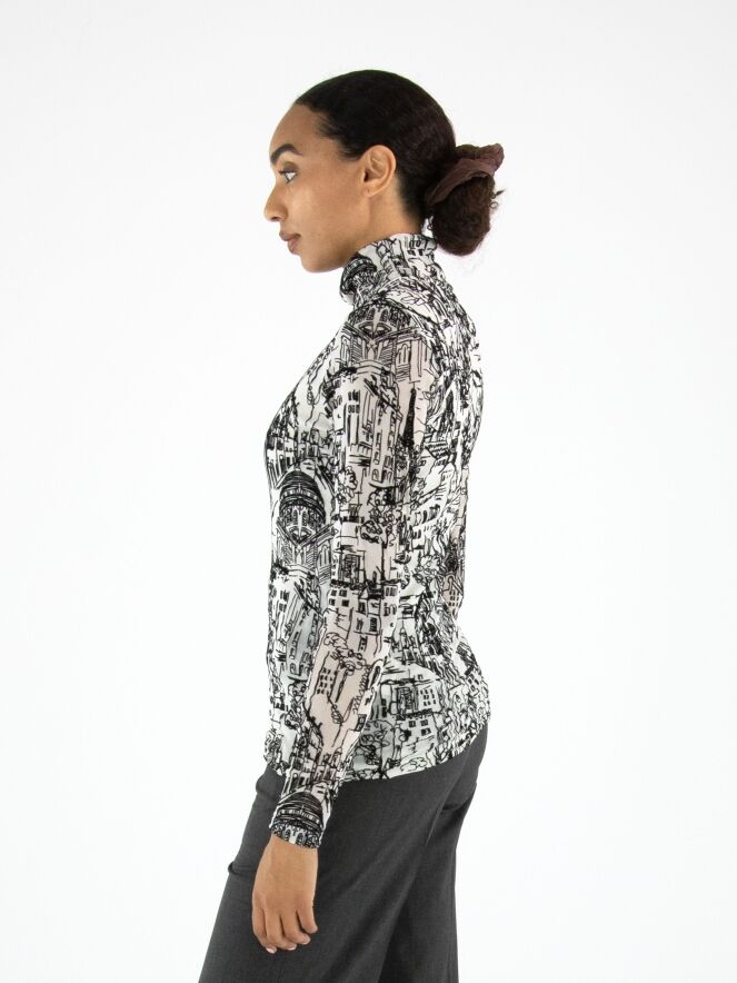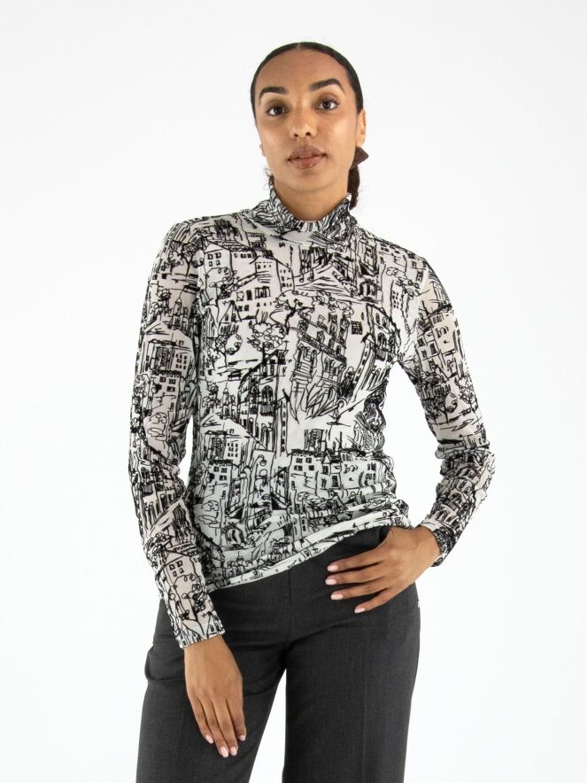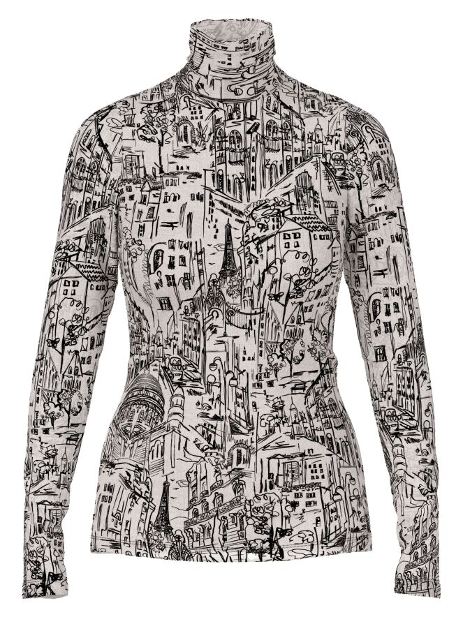 Een licht transparant shirt van Marc Cain met een schetsprint van de straten van Parijs in zwart op een lichtgrijze achtergrond. Het shirt heeft een turtlehals en lange mouwen. Dit shirt mag op 30 graden worden gewassen.