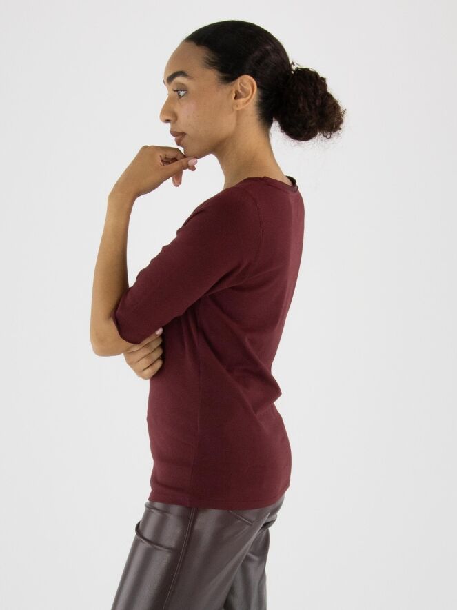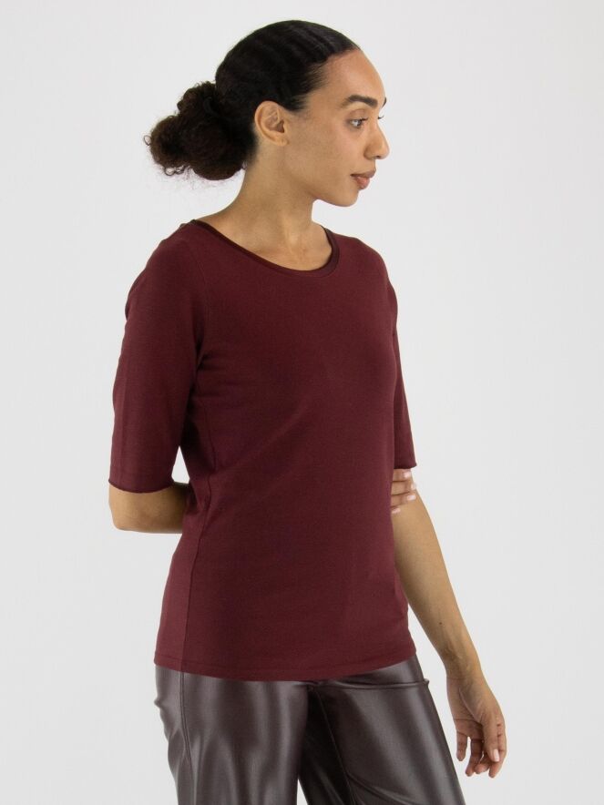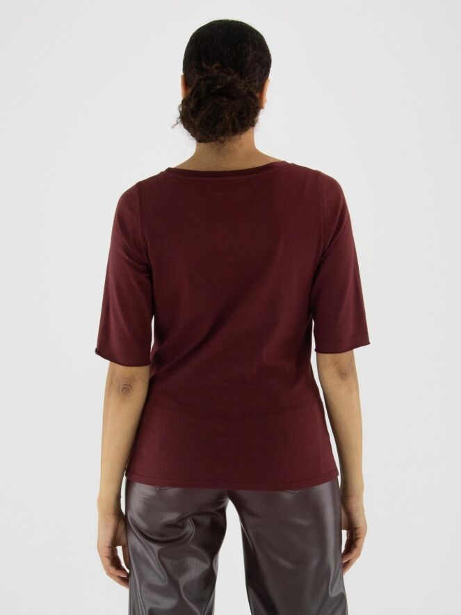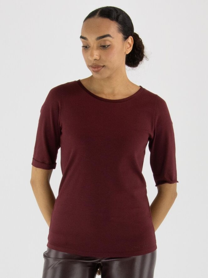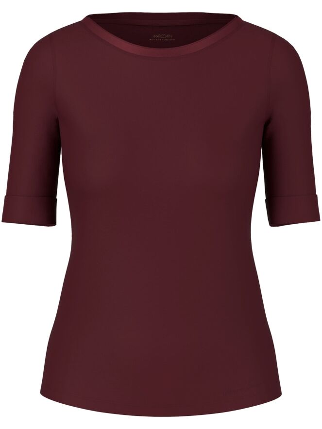 Een shirt van Marc Cain in de kleur aubergine. Langs de rand van de ronde hals loopt een dubbele, matte satijnen bies. Het shirt heeft korte mouwen en mag met de hand worden gewassen.