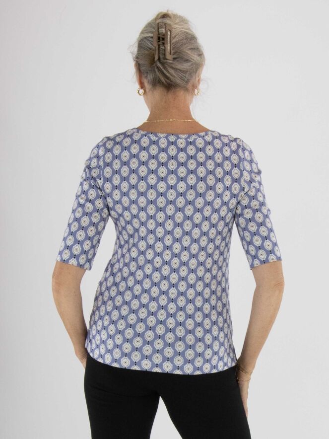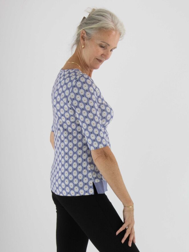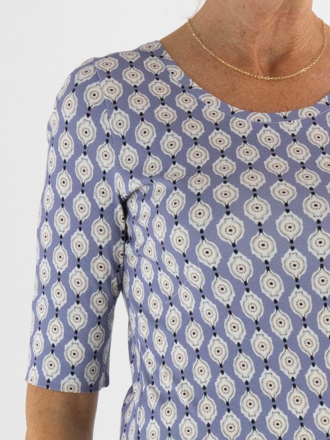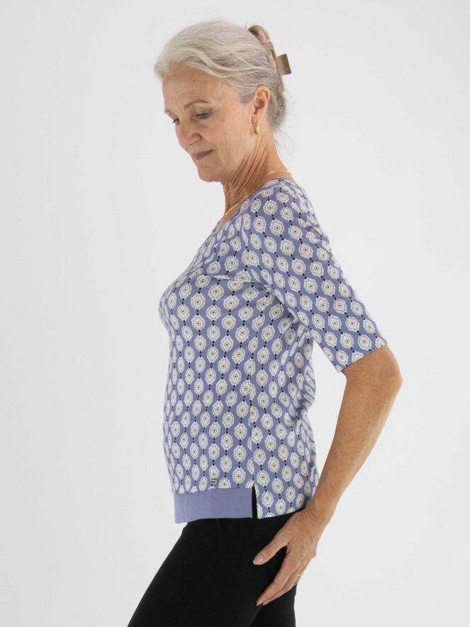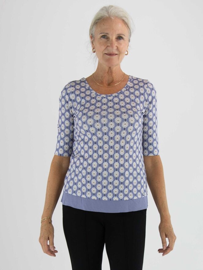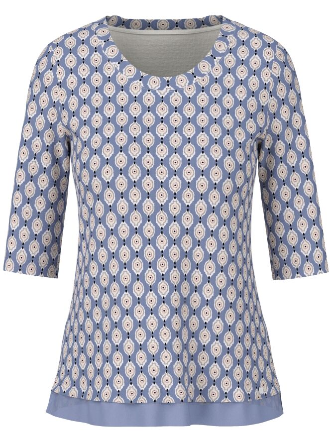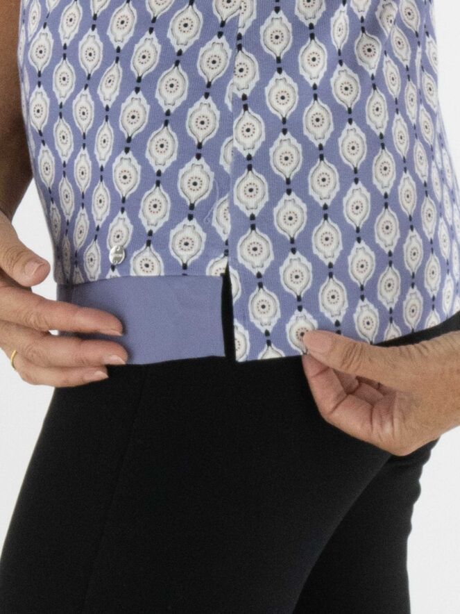 Een shirt van Marc Cain in een grafische print met de kleuren beige, roze, roomwit en zwart op een lila achtergrond. Aan de onderkant zit aan de voorzijde een brede voile bies in een roze kleur. Het shirt heeft een ronde hals en korte mouwen. Dit shirt mag op 30 graden worden gewassen.