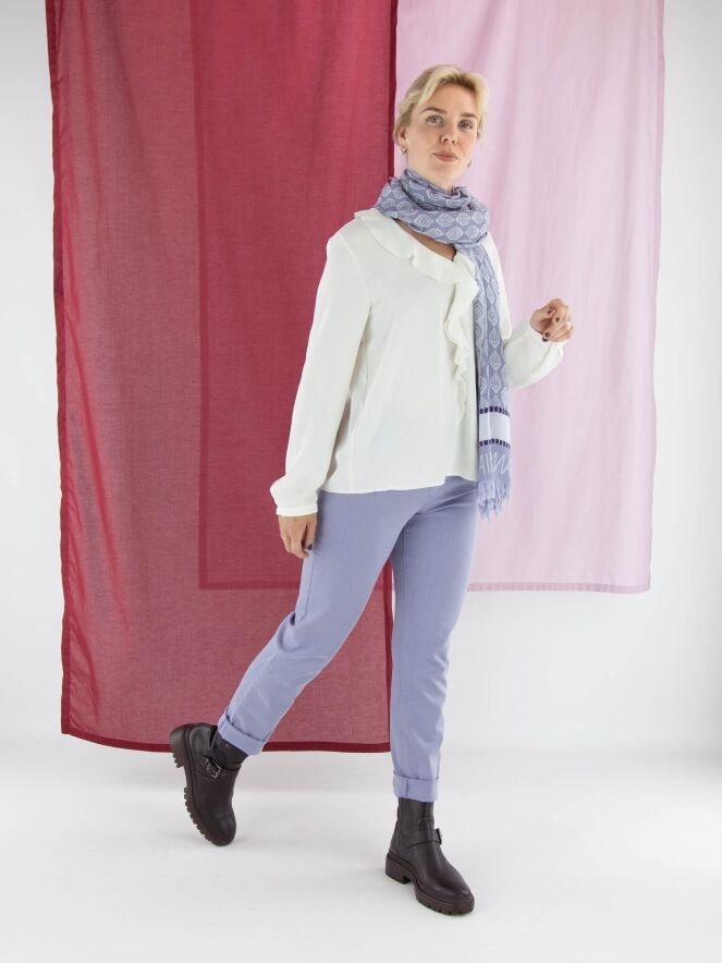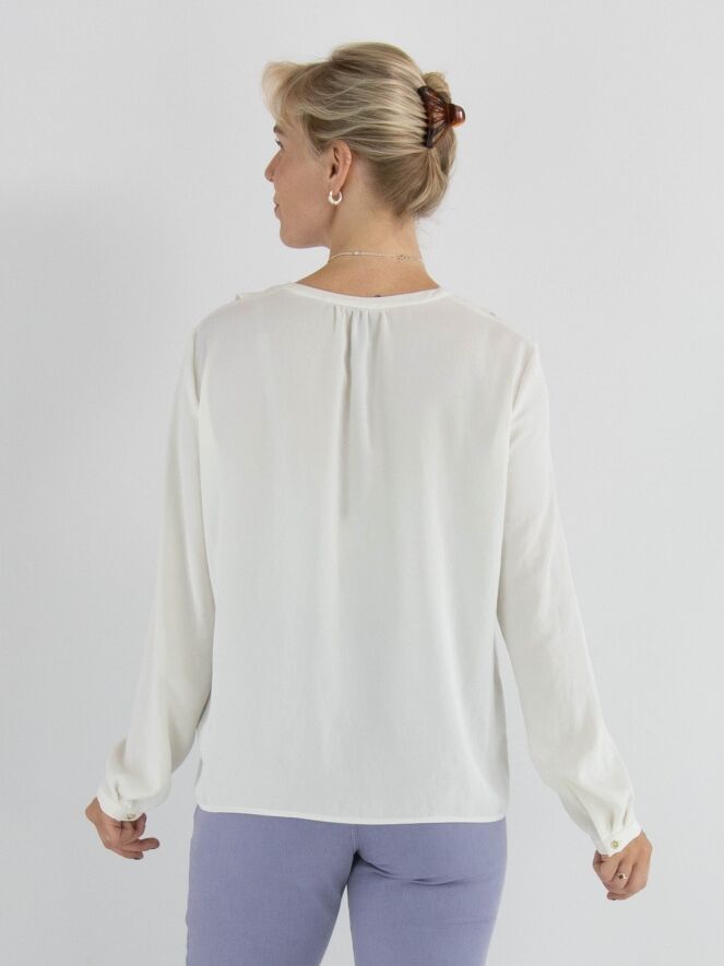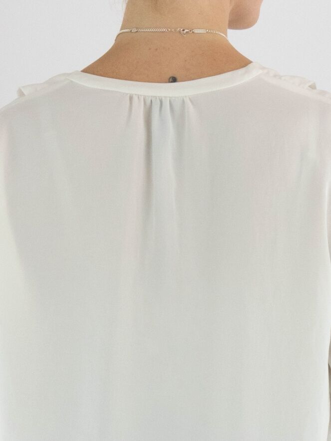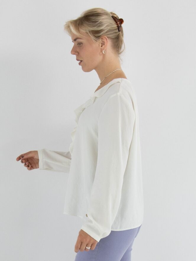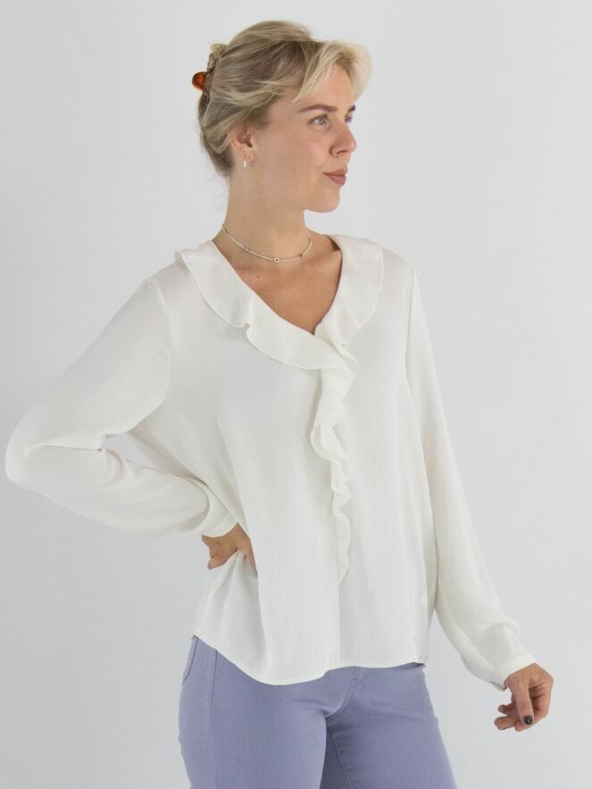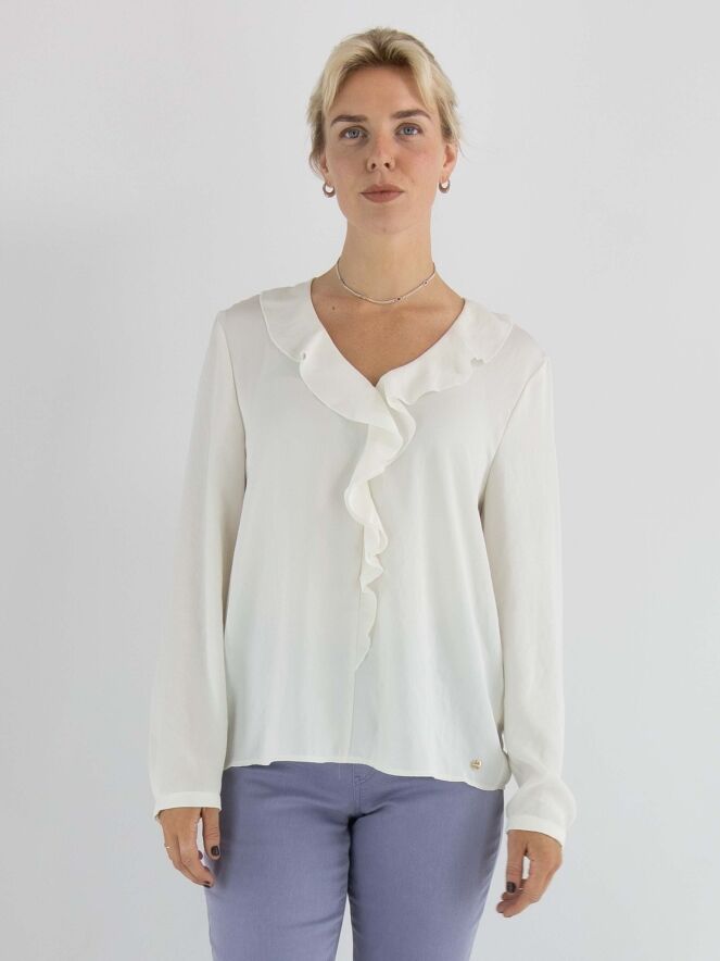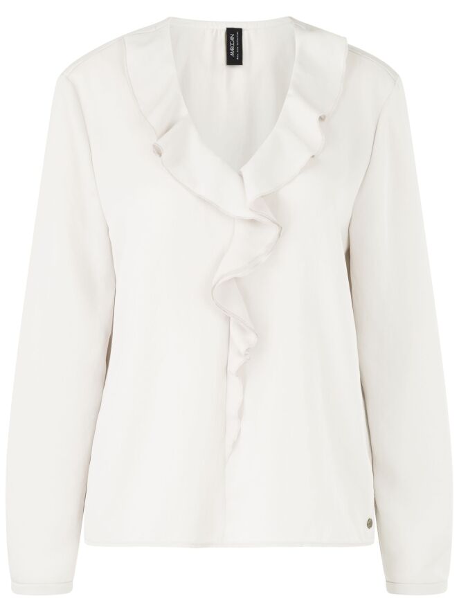Een blouse van Marc Cain in de kleur roomwit. De blouse heeft een brede, golvende kraag die vanuit de onderkant van de V-hals als een volant doorloopt tot aan de taille. Aan het uiteinde van de lange mouwen zit een manchet met een omslagbies en een knoopsluiting. Deze blouse mag op 30 graden worden gewassen.
