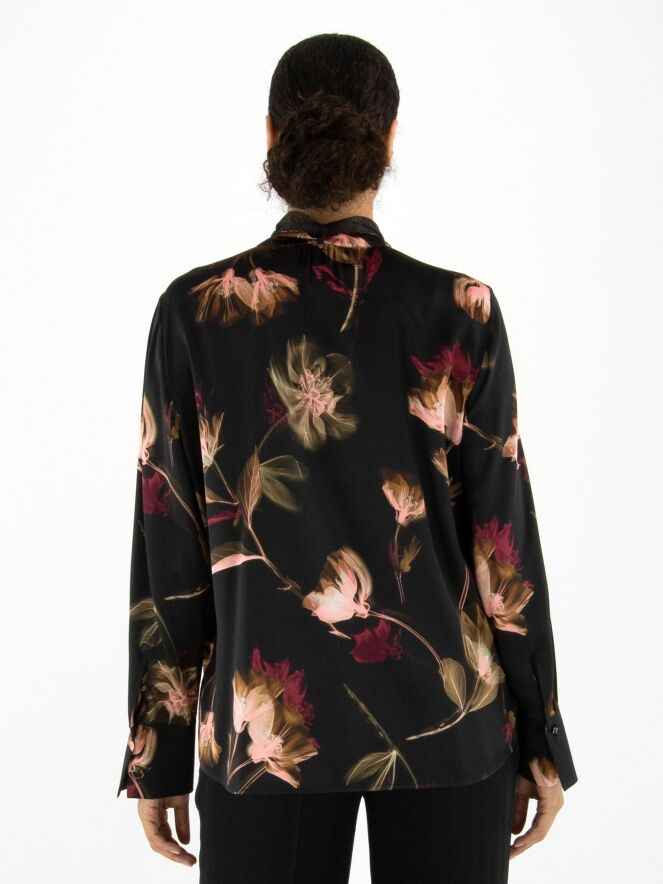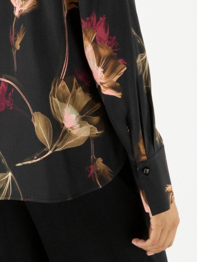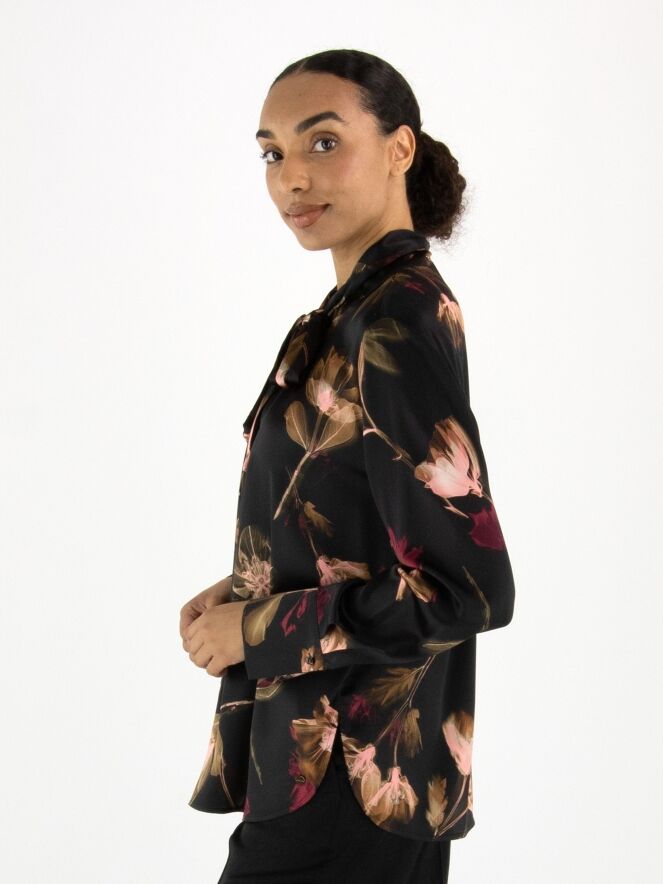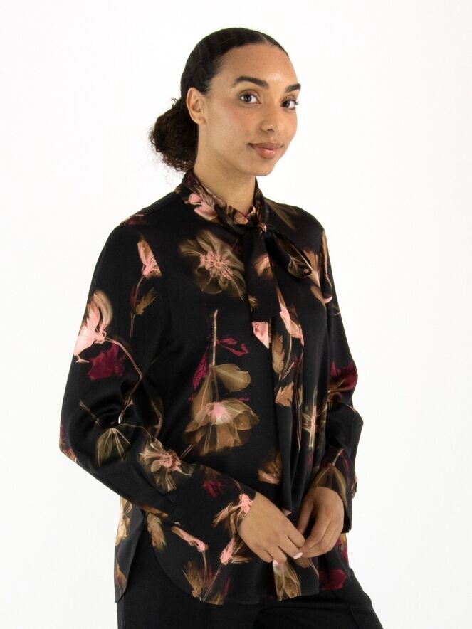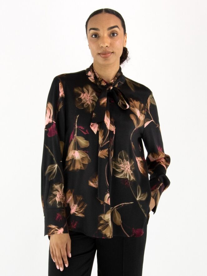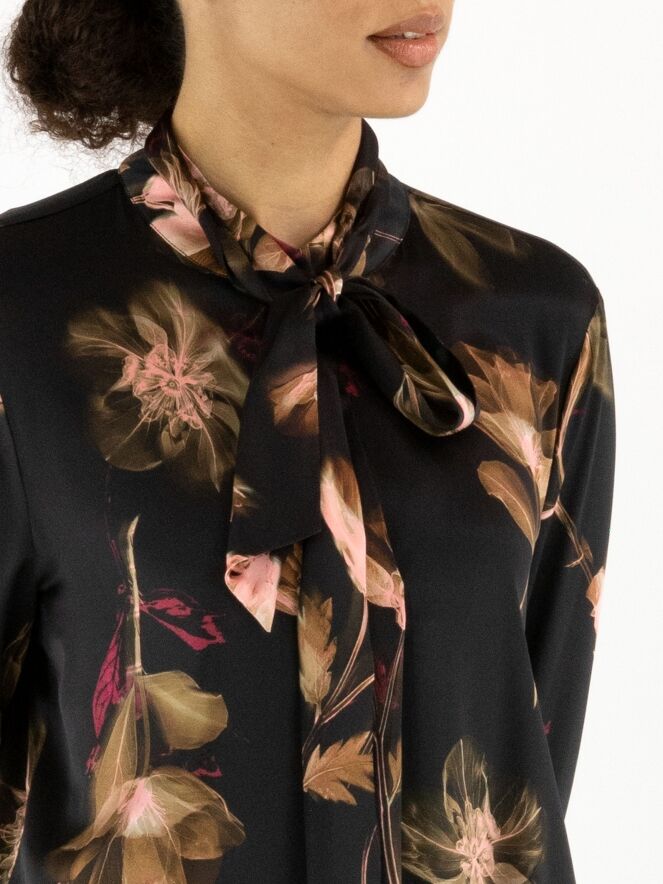 Een blouse van Marc Cain in een bloemenprint met meerdere tinten roze en olijfgroen op een zwarte achtergrond. Vanuit de hals loopt een los decoratief lint waarmee een strik kan worden gemaakt. Deze blouse mag met de hand worden gewassen.