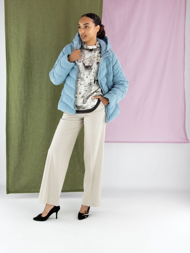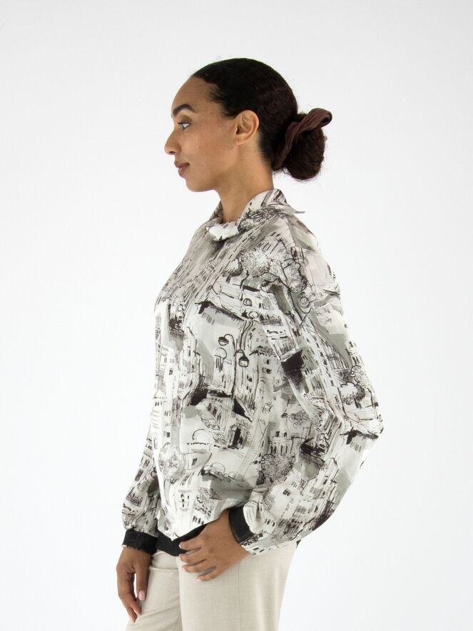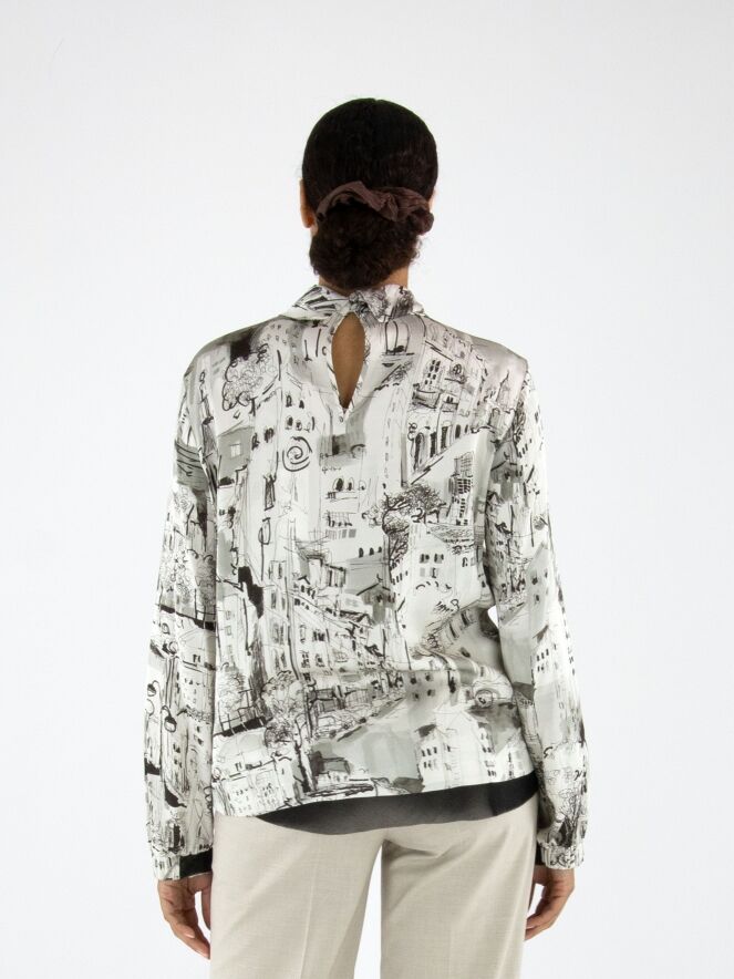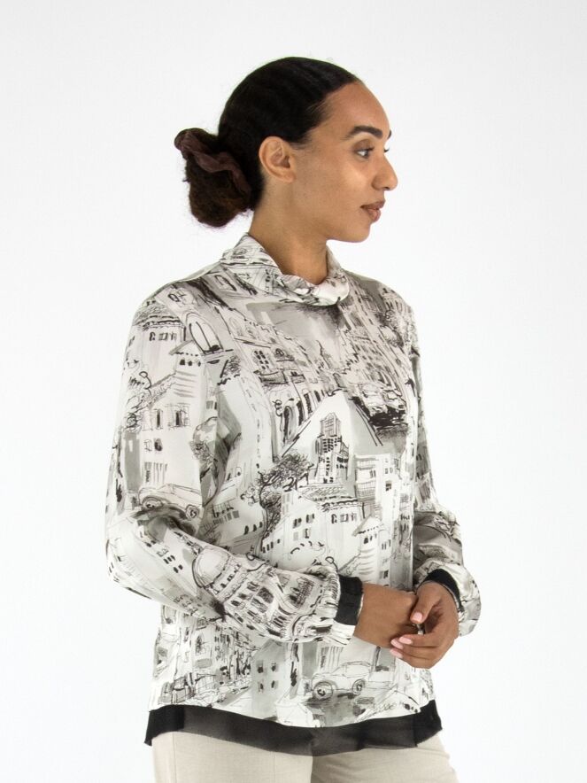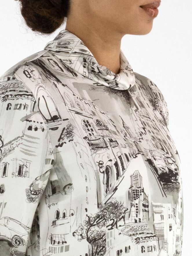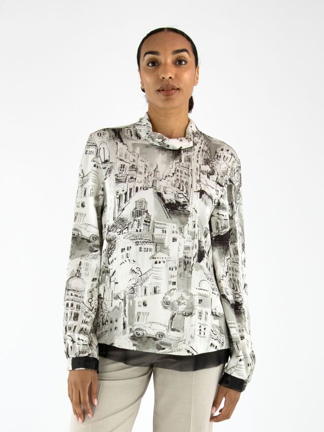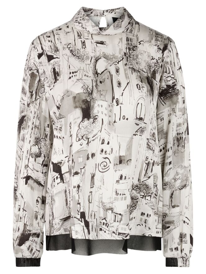 Een shirt van Marc Cain in een print van de straten van Parijs met meerdere tinten wit, grijs en zwart. Het shirt heeft een hoge, vallende turtlehals. Langs de onderrand is een voile zwarte bies die onder de stof uitkomt. Deze voile stof is ook deels verwerkt langs de rand van de lange mouwen. Aan het uiteinde van de lange mouwen bevindt zich een elastische, fijn geplooide boord. Dit shirt mag op 30 graden worden gewassen.