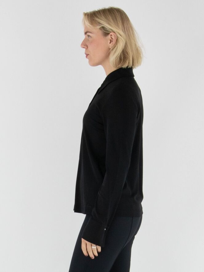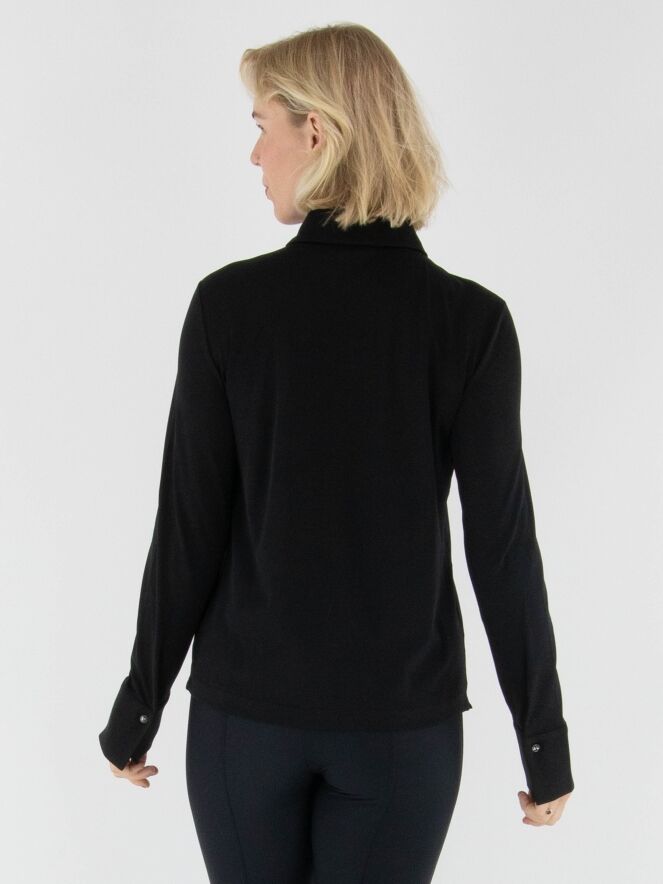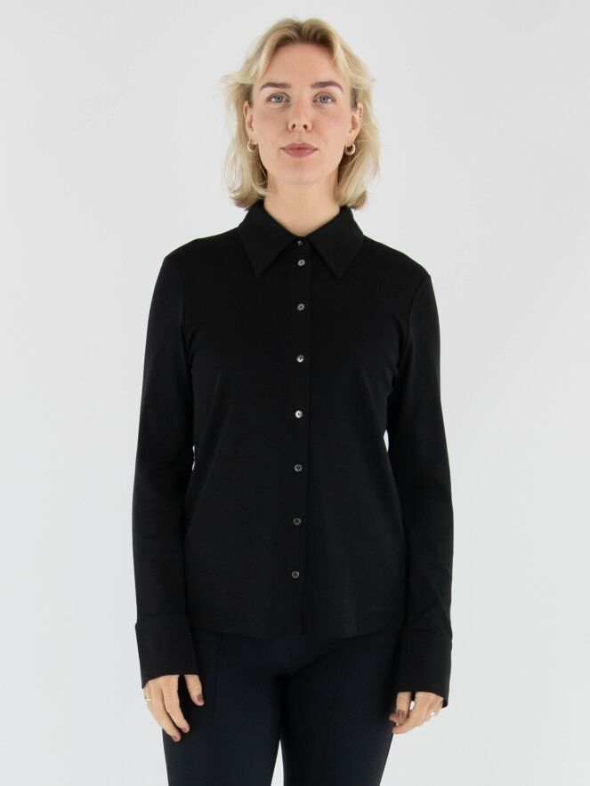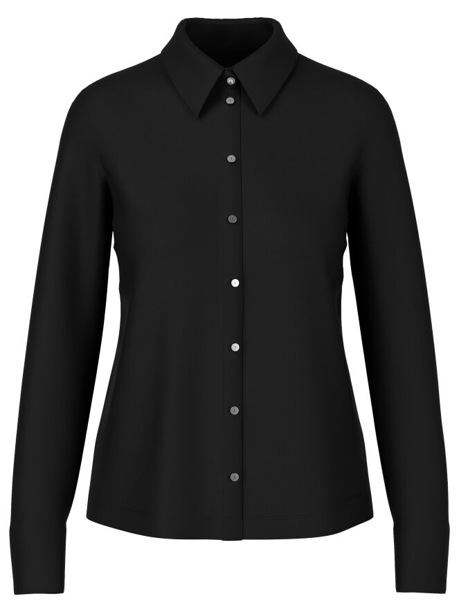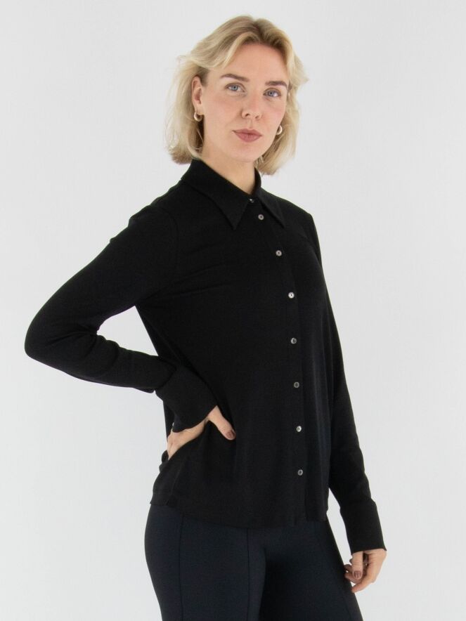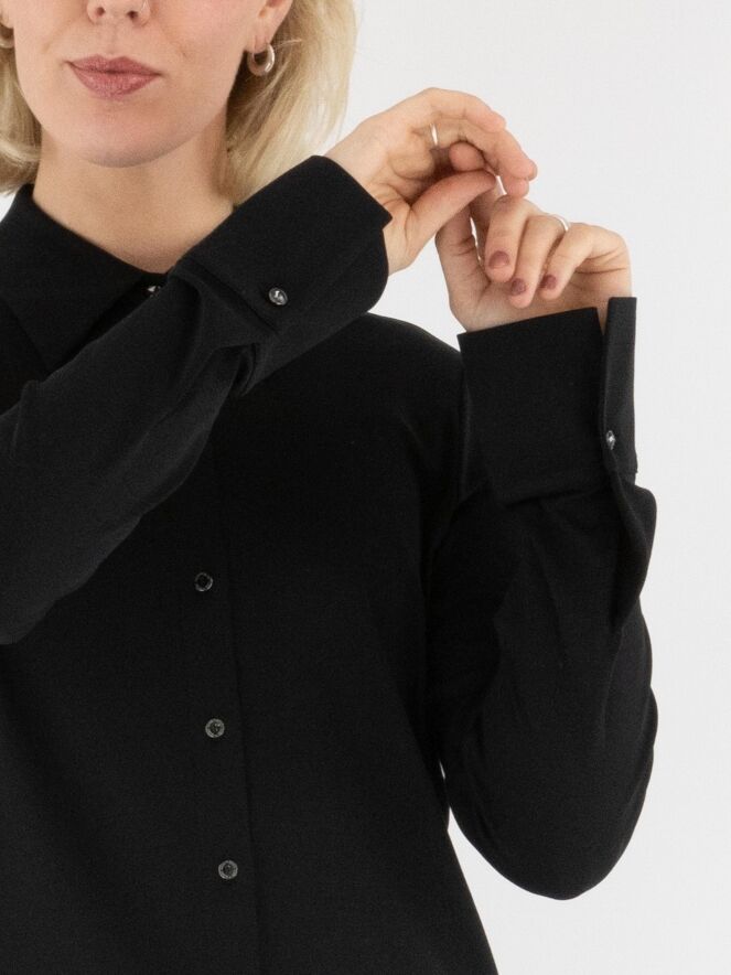 Een blouse van Marc Cain in het zwart. De sluiting is uitgevoerd met zilverkleurige knoopjes en in de manchetten van de mouwen zit een knoopje met een strassteentje. Deze blouse mag op 30 graden worden gewassen.