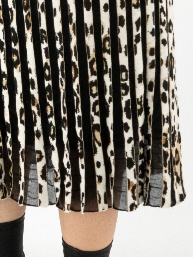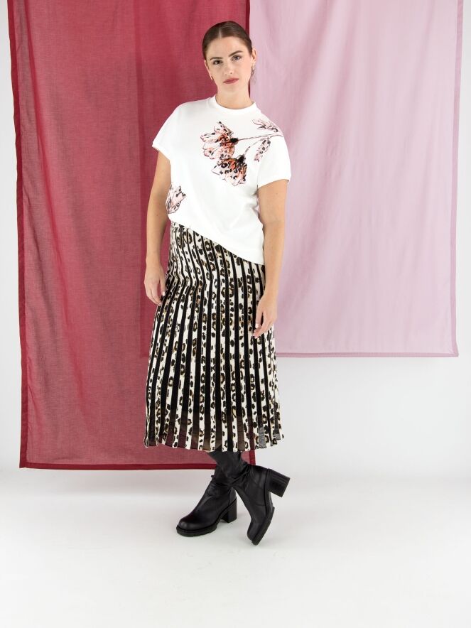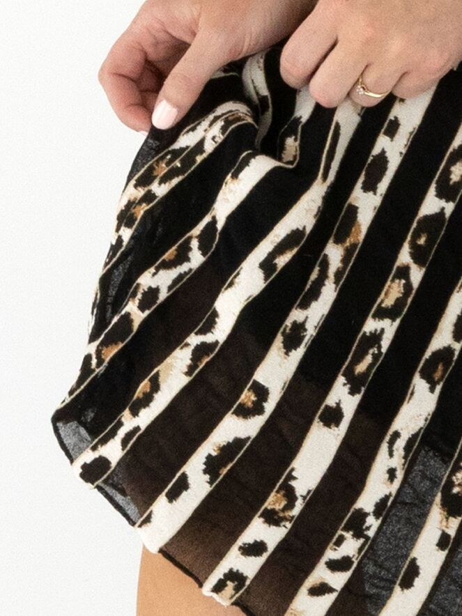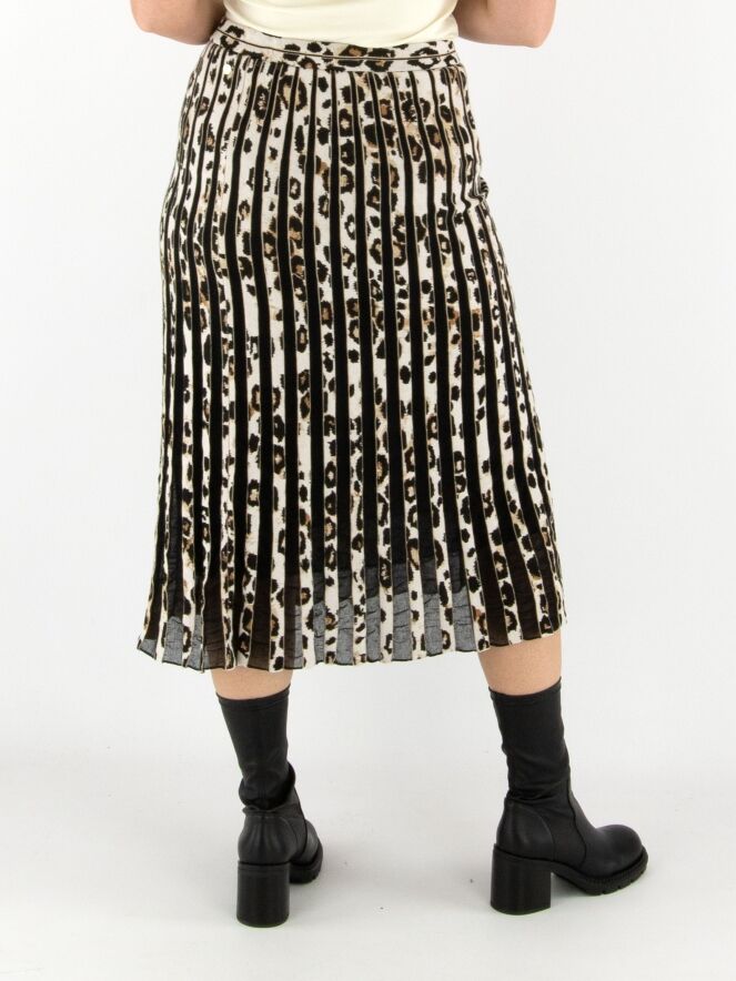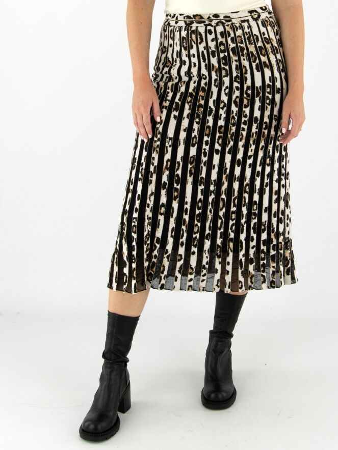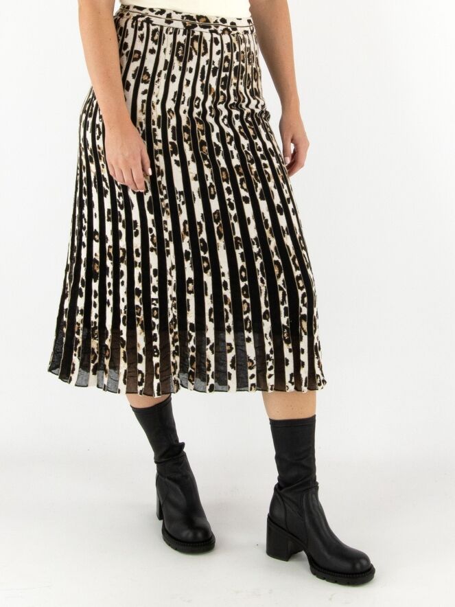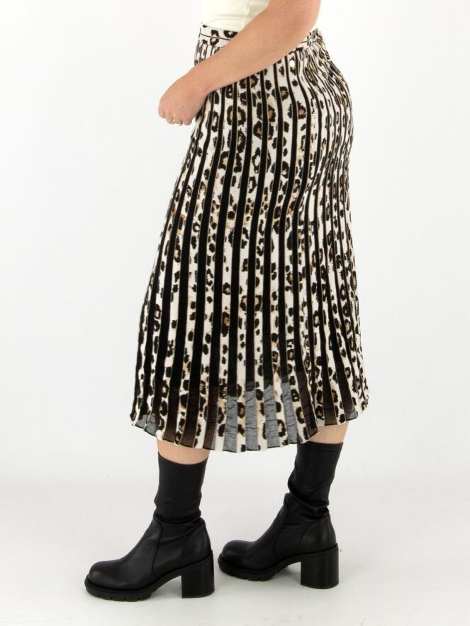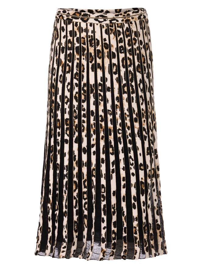 Een rok van Marc Cain in een panterprint met meerdere tinten bruin en zwart op een zandkleurige achtergrond. In de print is een verticale streepstructuur in het zwart verwerkt. De taille heeft een elastische band. De rok heeft een lichte A-lijn en is voorzien van een losse voering. Deze rok mag op 30 graden worden gewassen.