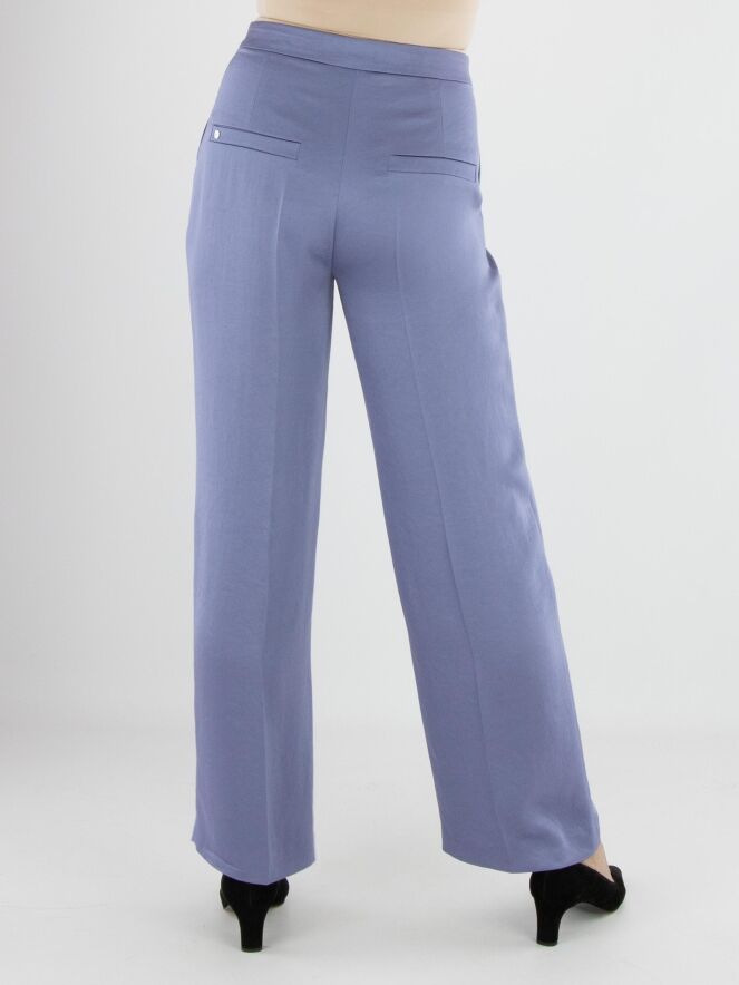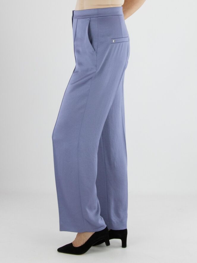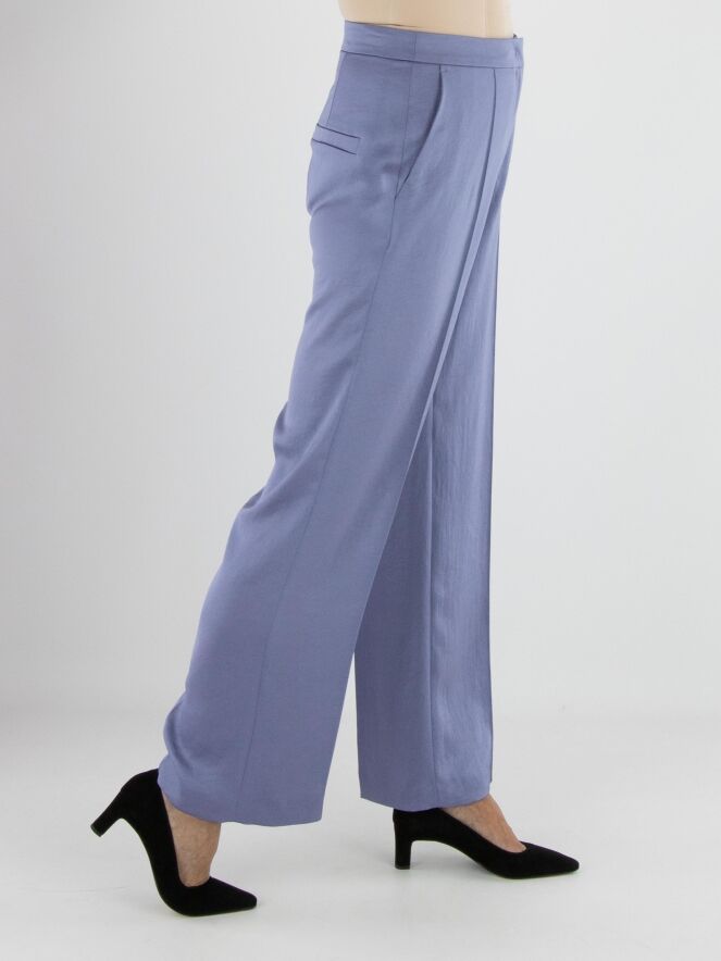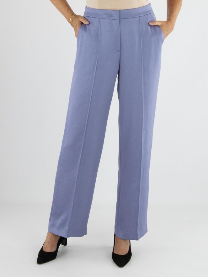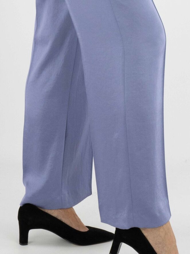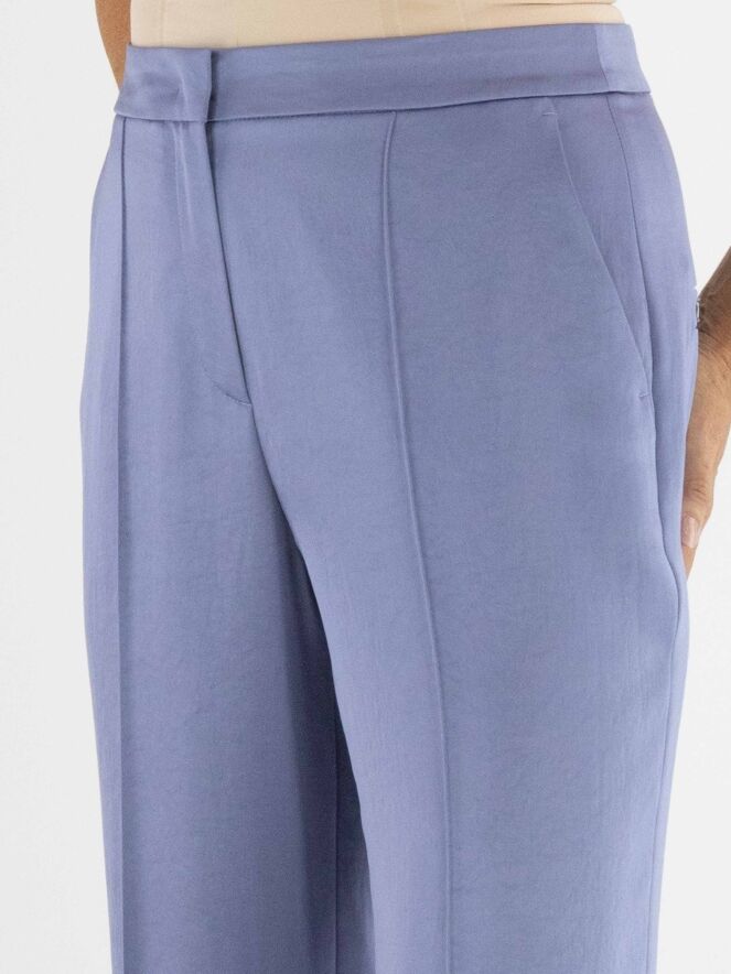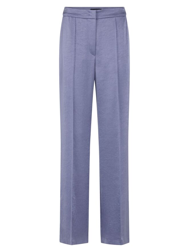 Een mat satijnen broek van Marc Cain in een lila kleur. In het midden van de pijpen zit een omgekeerde stiknaad en aan de achterkant van de pijpen loopt in het midden een ingestreken plooi. De broek heeft steekzakken en mag op 30 graden worden gewassen.