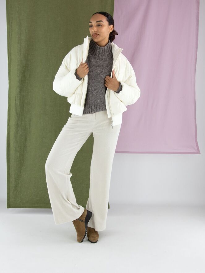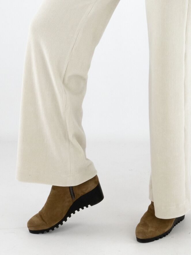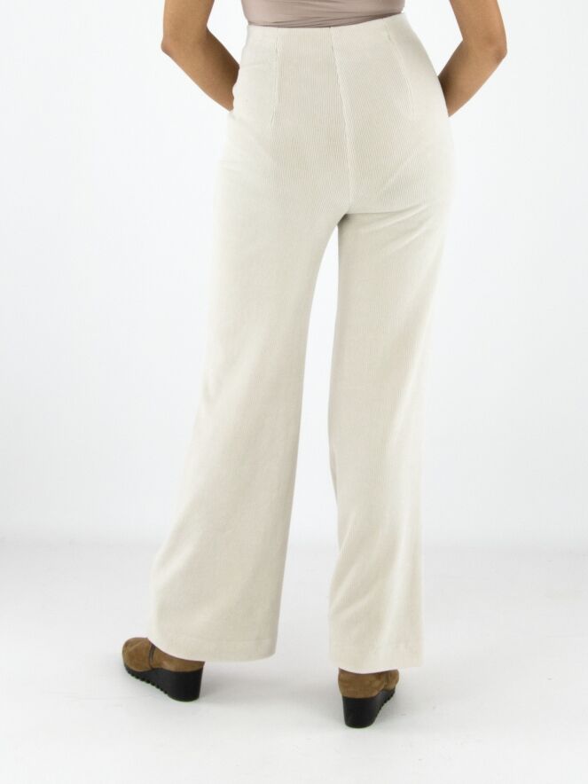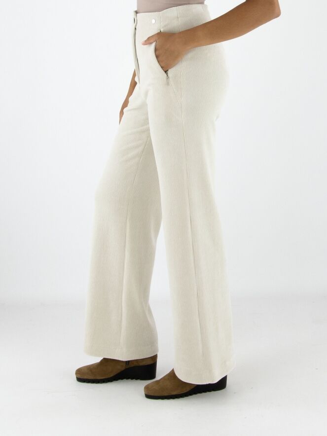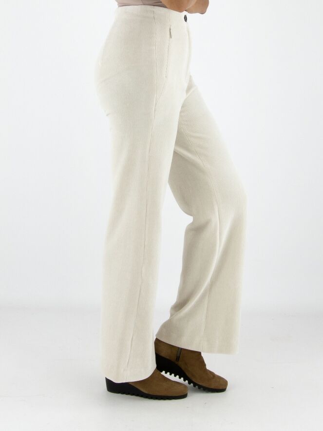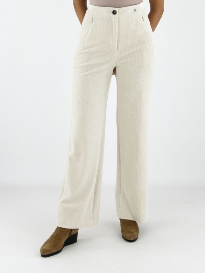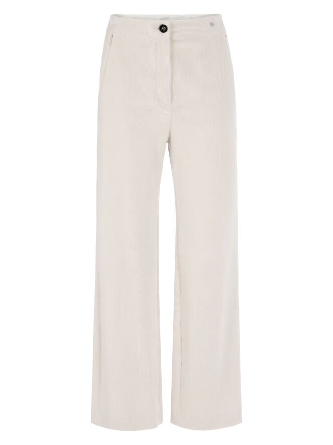 Een rib cord broek van Marc Cain in een stijlvolle beige kleur. De pijpen zijn recht gesneden en de steekzakken zijn voorzien van een praktische ritssluiting. Deze luxe damesbroek kan op 30 graden worden gewassen.