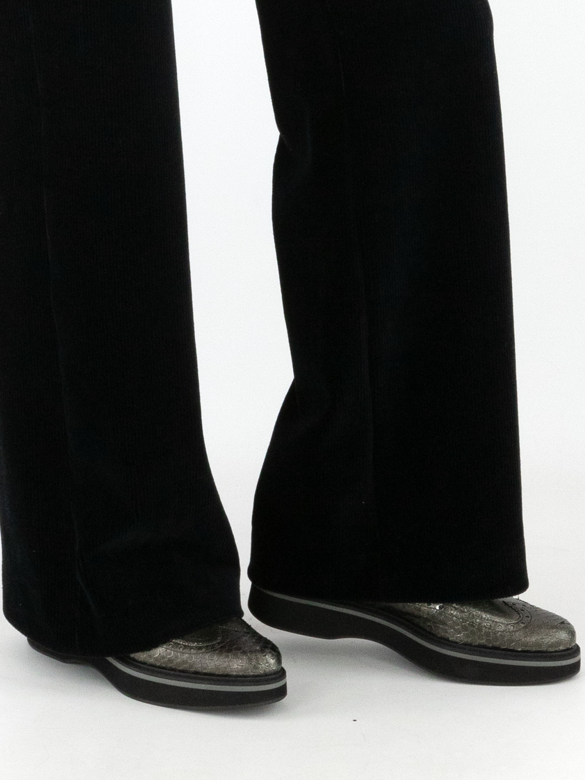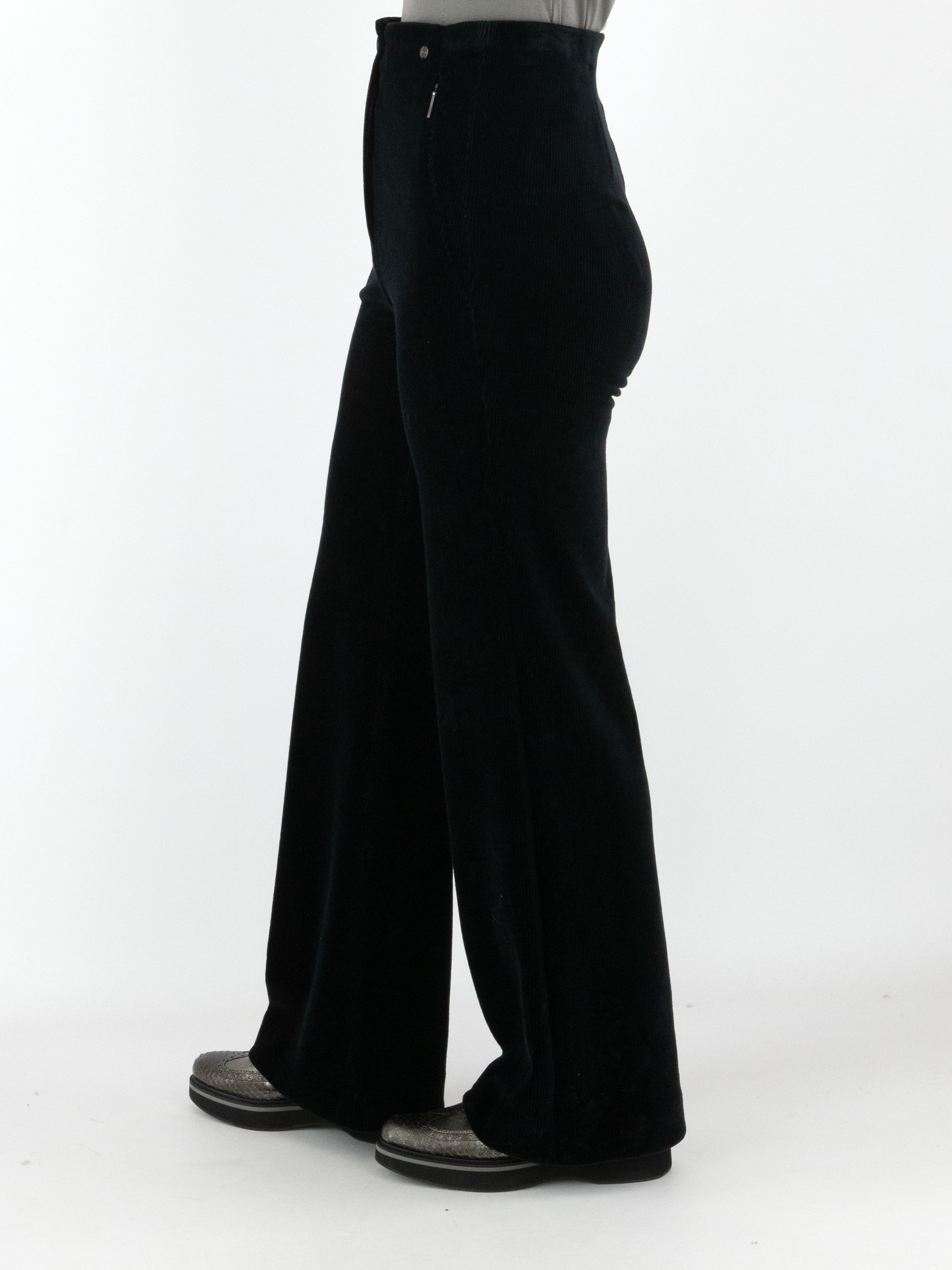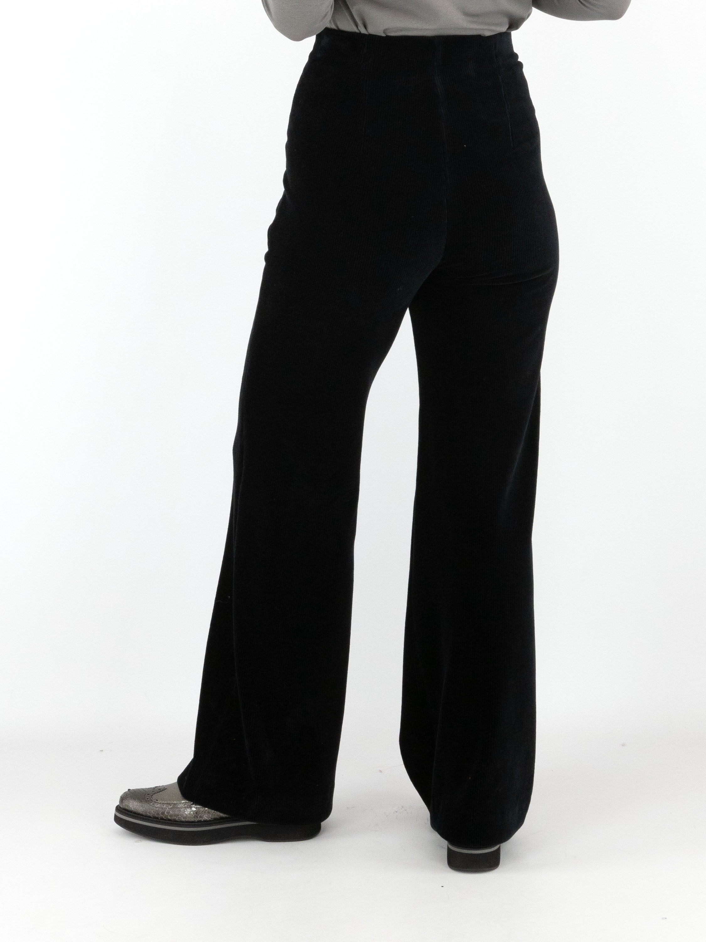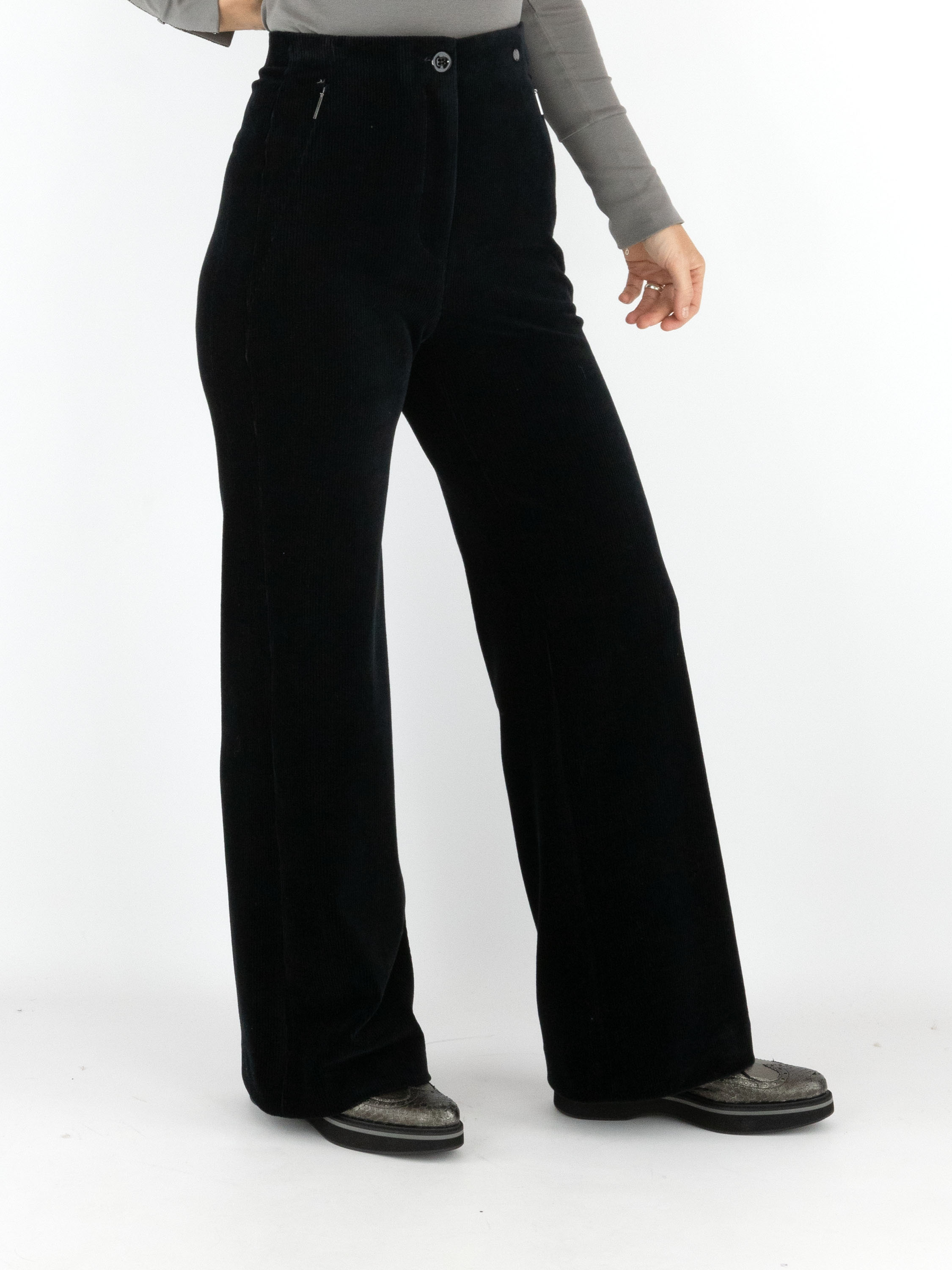 Een rib cord broek van Marc Cain in de kleur zwart. De broek heeft recht gesneden pijpen en is voorzien van steekzakken met een ritssluiting, wat zorgt voor een moderne en luxe uitstraling. Deze broek kan op 30 graden worden gewassen.