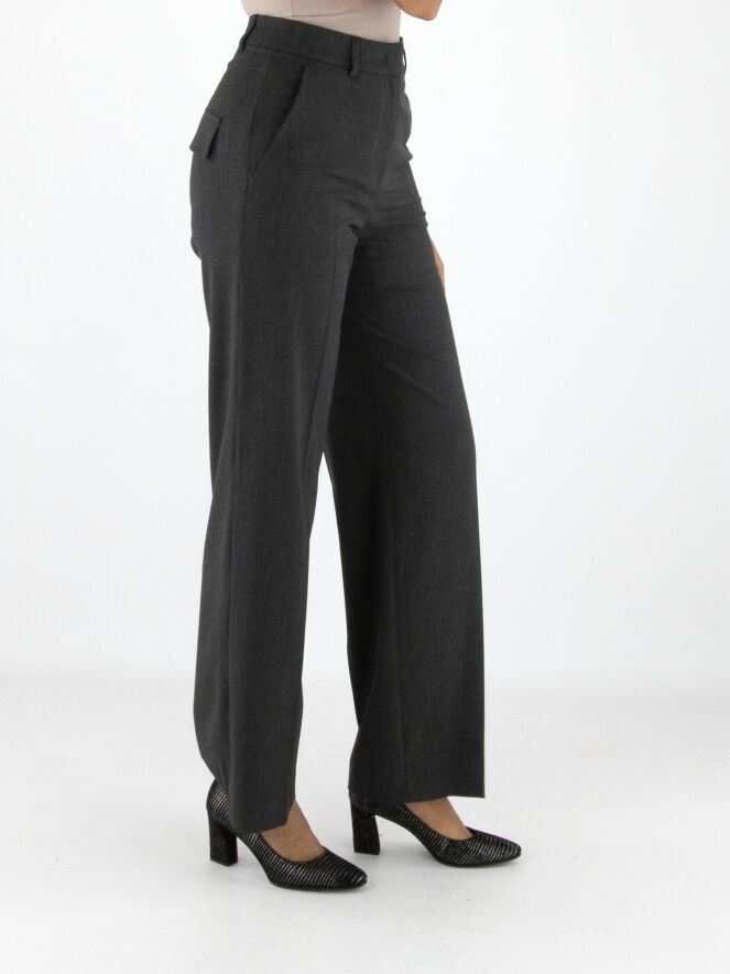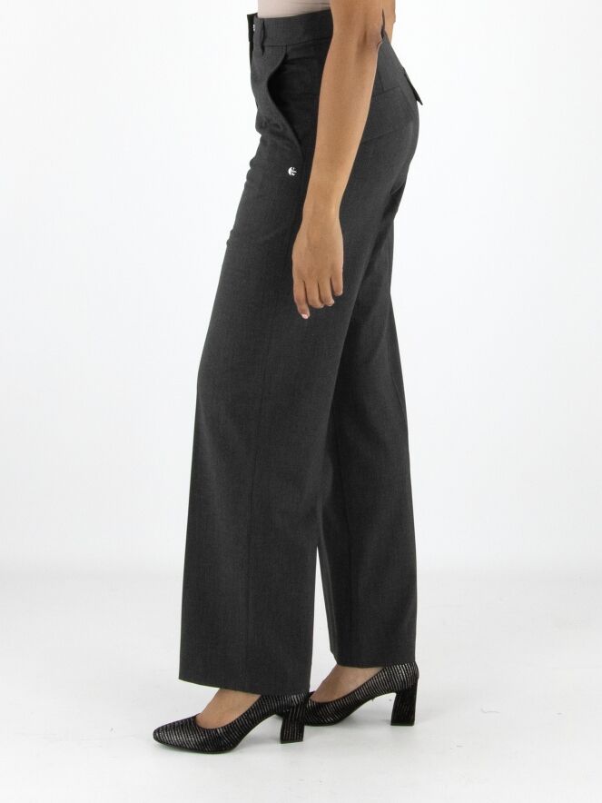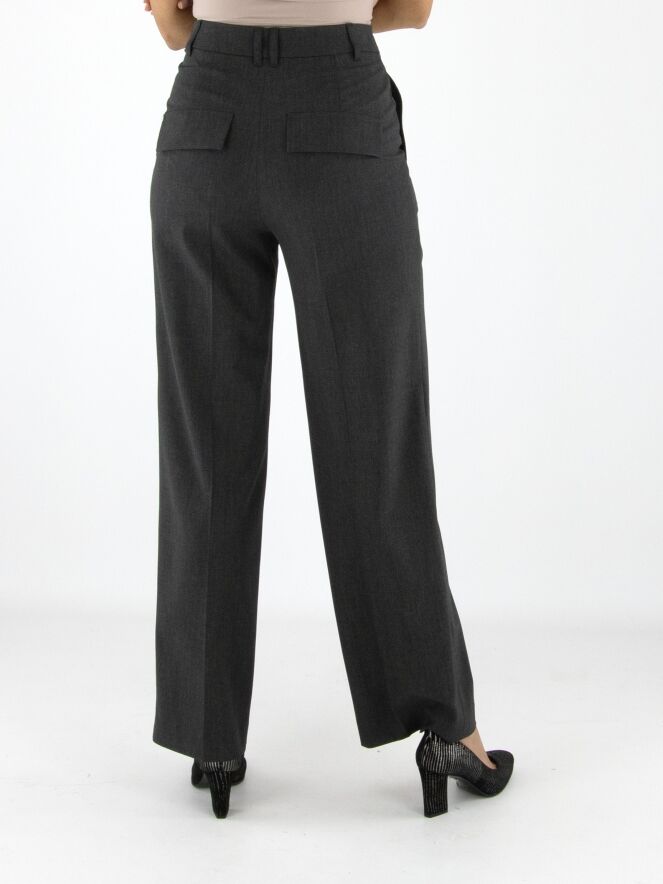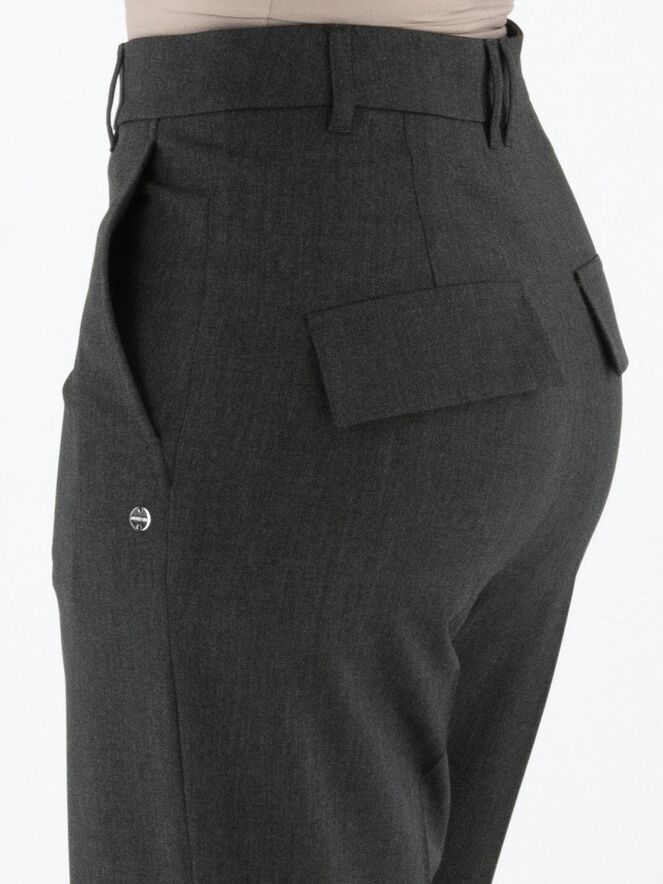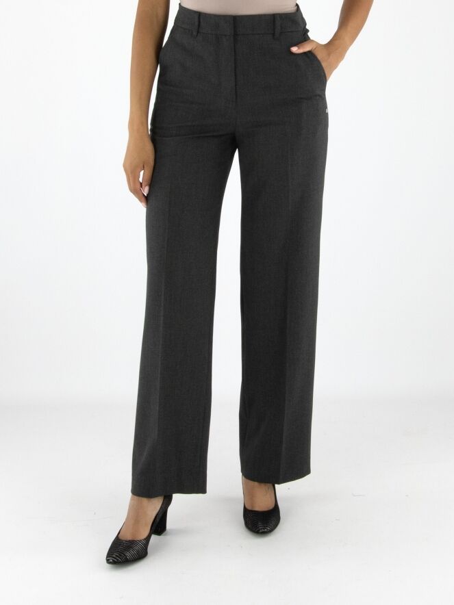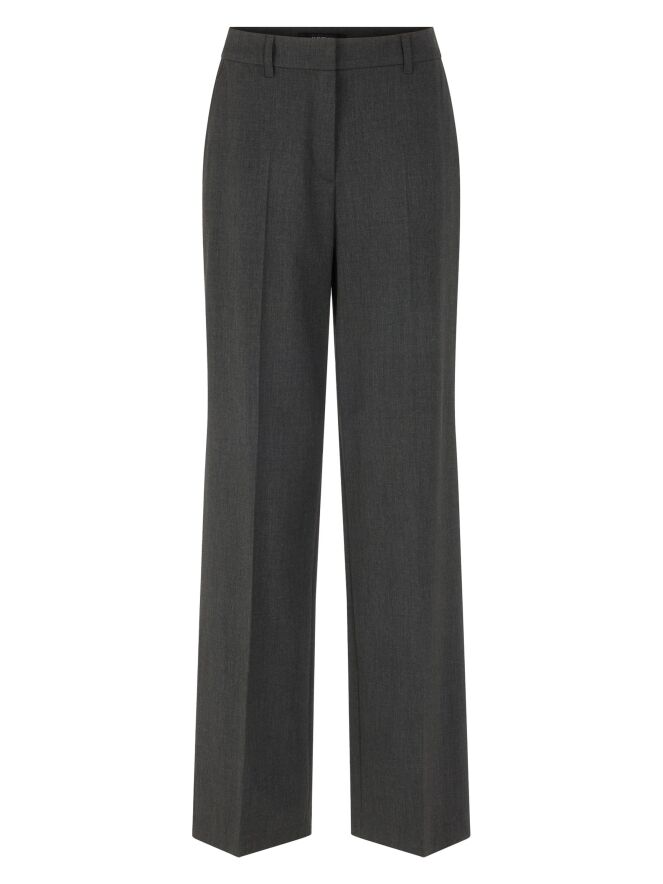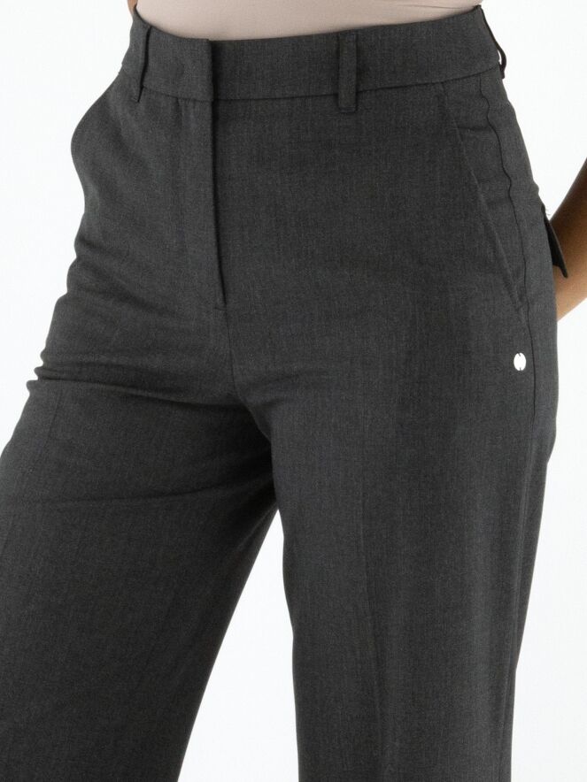 Een recht gesneden broek van Marc Cain in een grijze kleur. In het midden van de pijpen loopt een ingestreken plooi, wat de broek een elegante en verzorgde uitstraling geeft. De broek heeft steekzakken en mag op 30 graden worden gewassen.