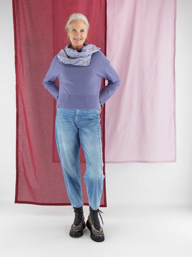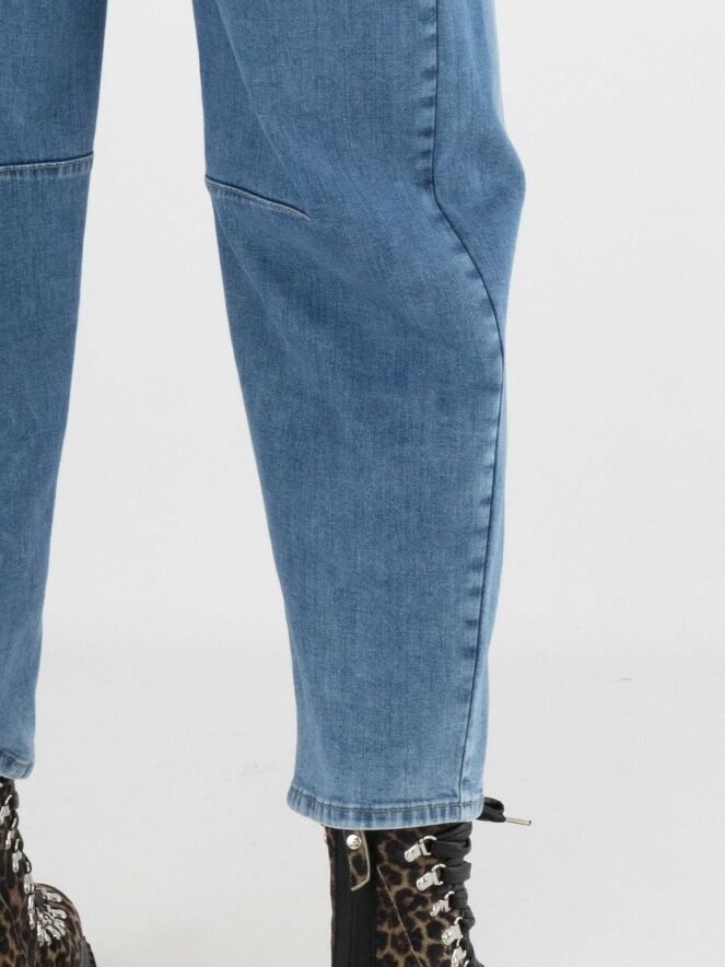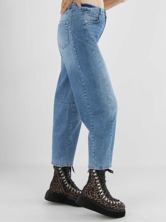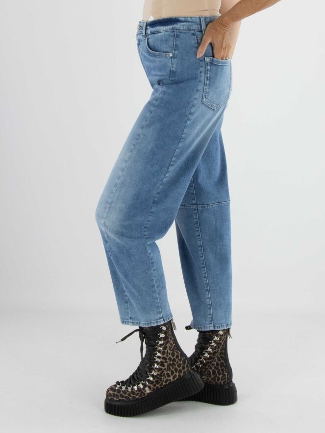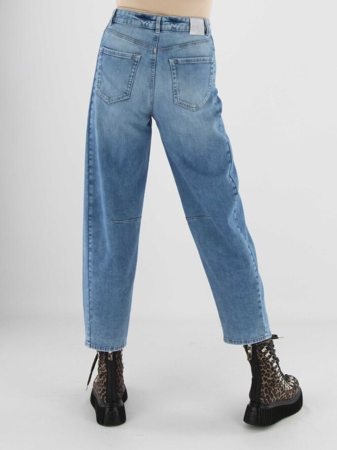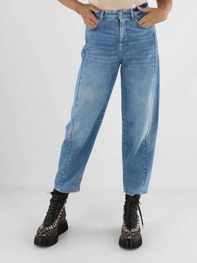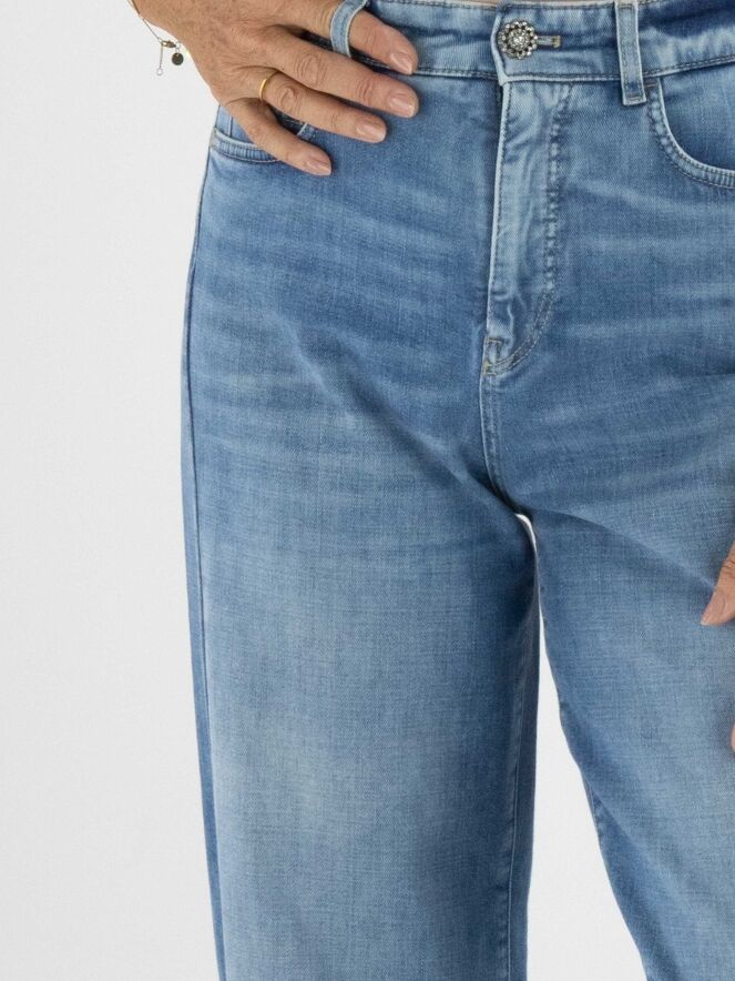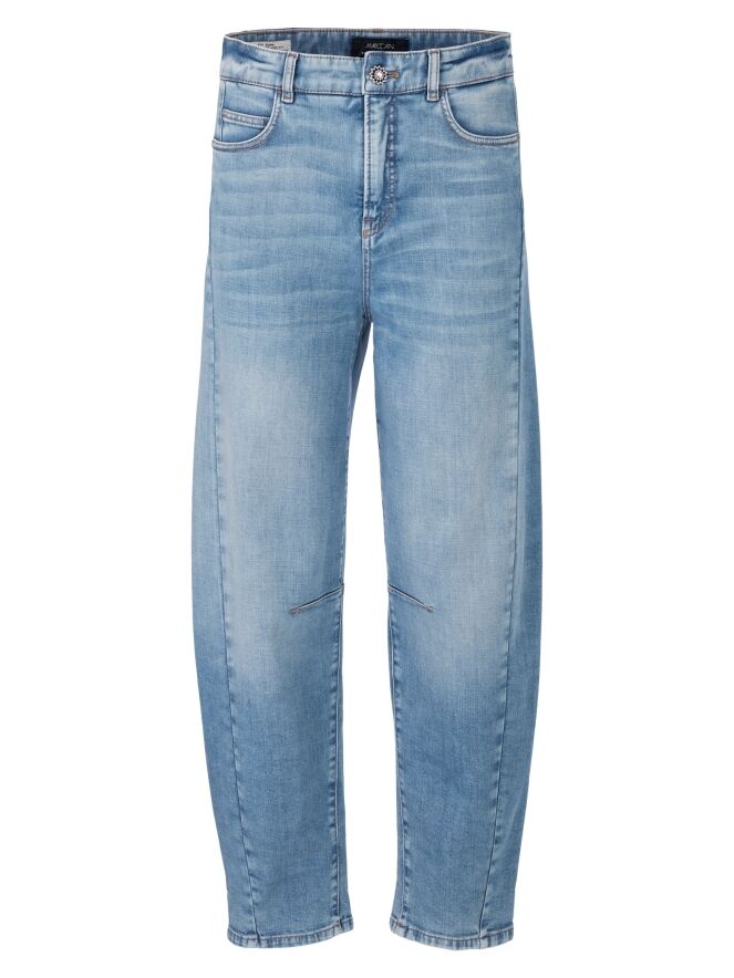 Een gewassen jeans van Marc Cain in een lichte jeanskleur. De jeans is uitgevoerd in een 5-pocketmodel. Ter hoogte van de knieën is een coupnaad verwerkt. Deze jeans mag op 30 graden worden gewassen.