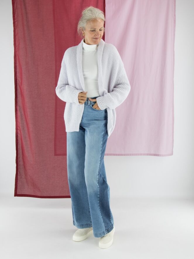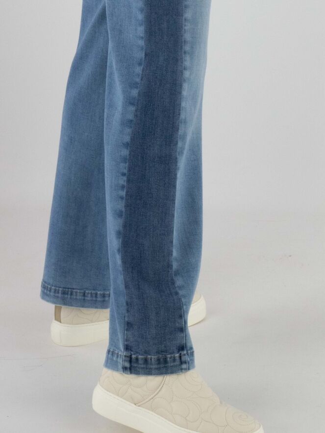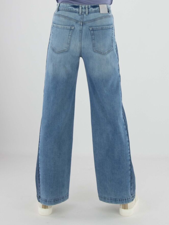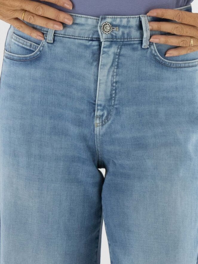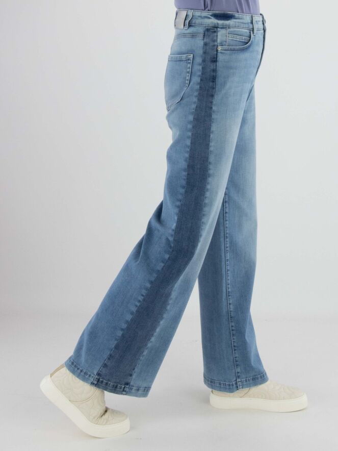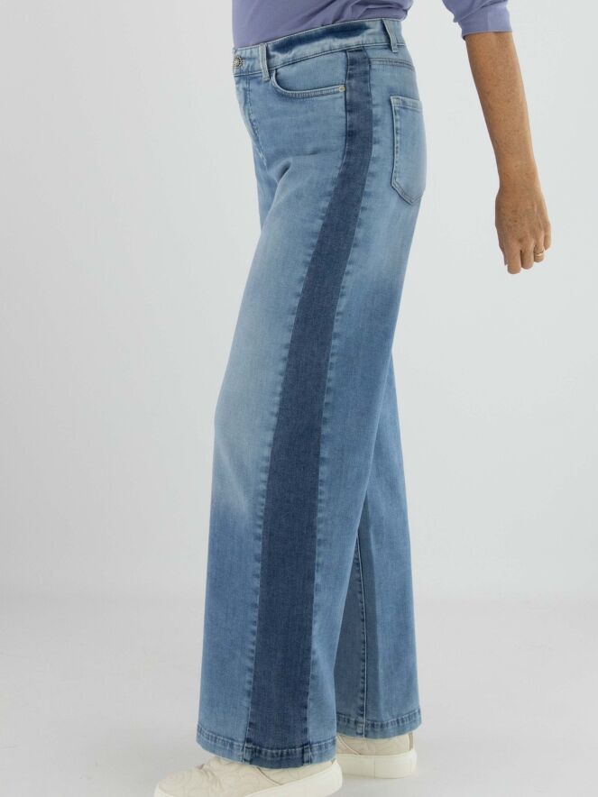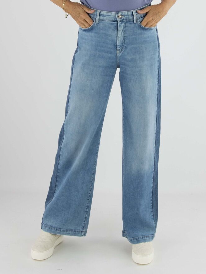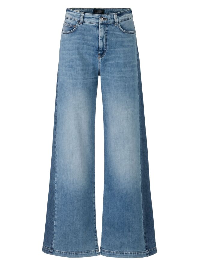 Een wijde jeans van Marc Cain in een basic jeanskleur. De jeans is uitgevoerd in een 5-pocketmodel. De zijkanten van de pijpen zijn in een donkerdere denimkleur. Deze jeans mag op 30 graden worden gewassen.