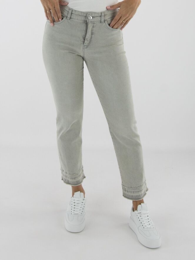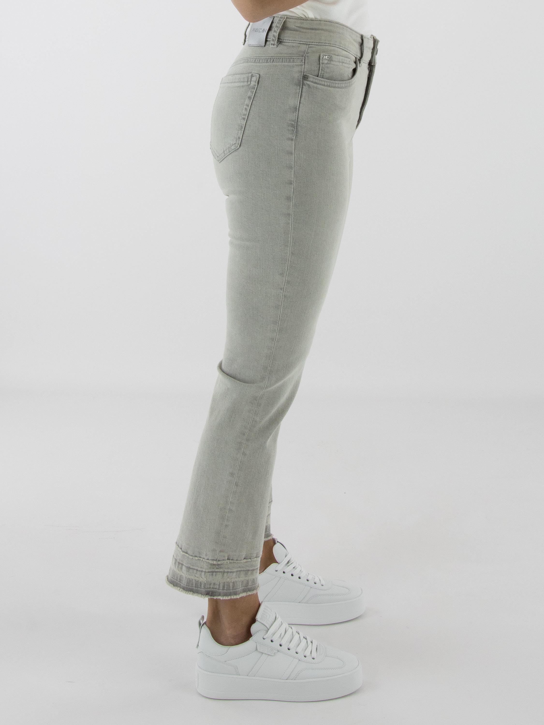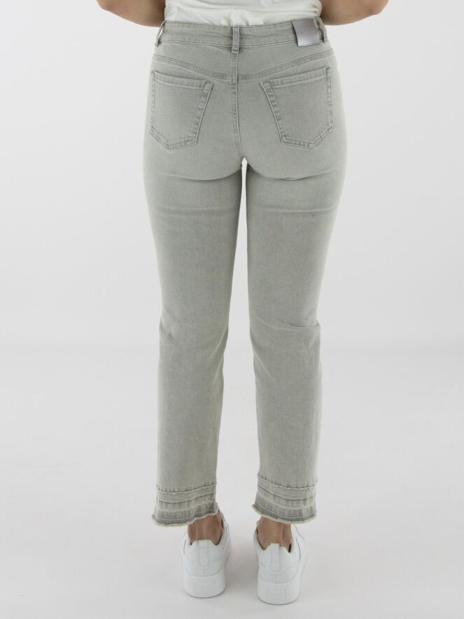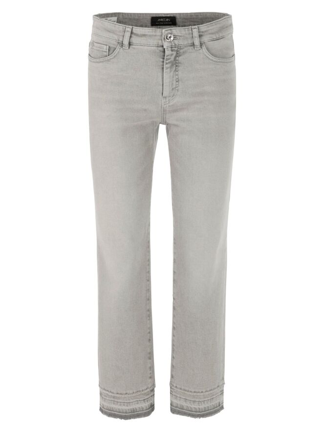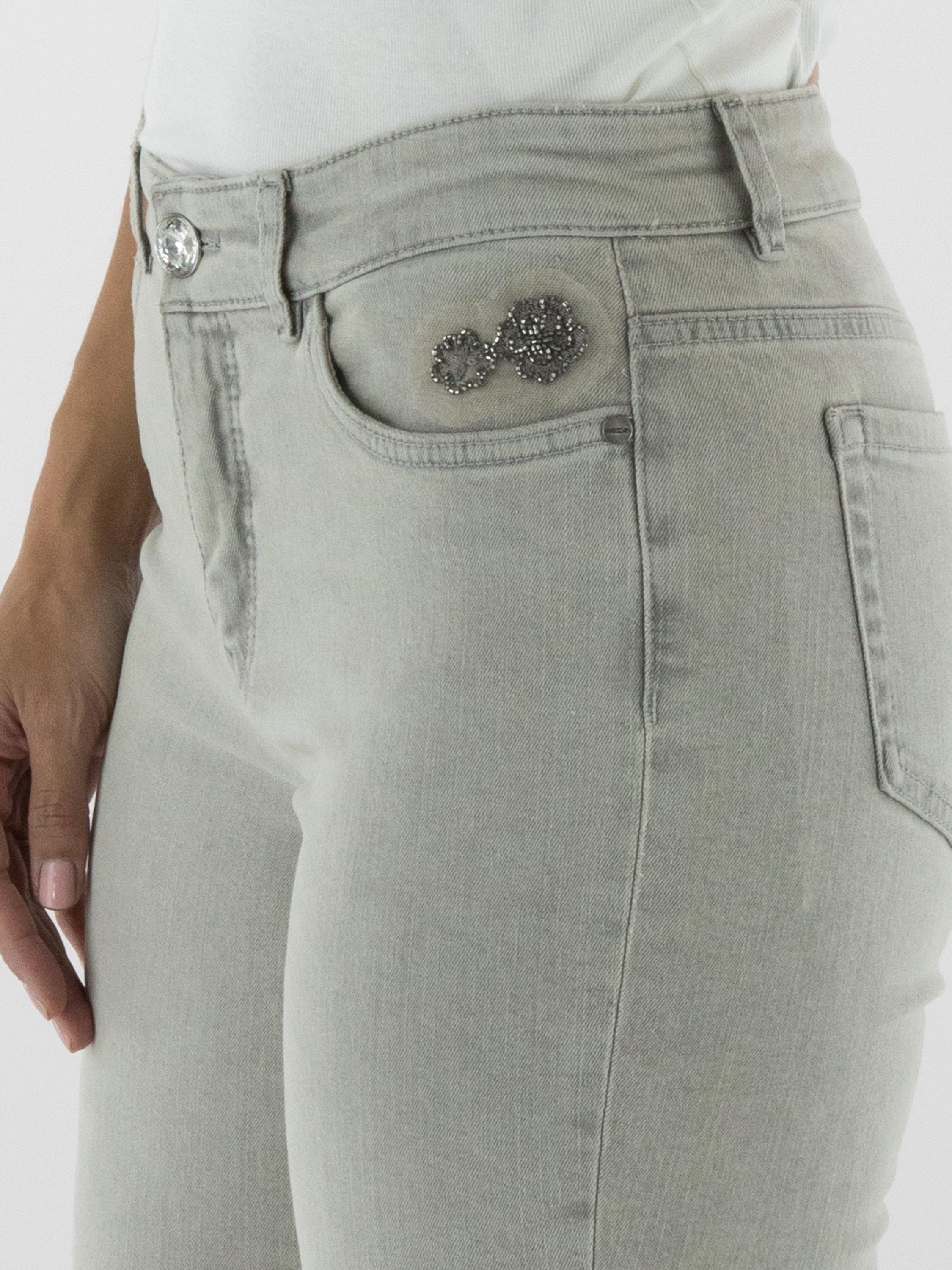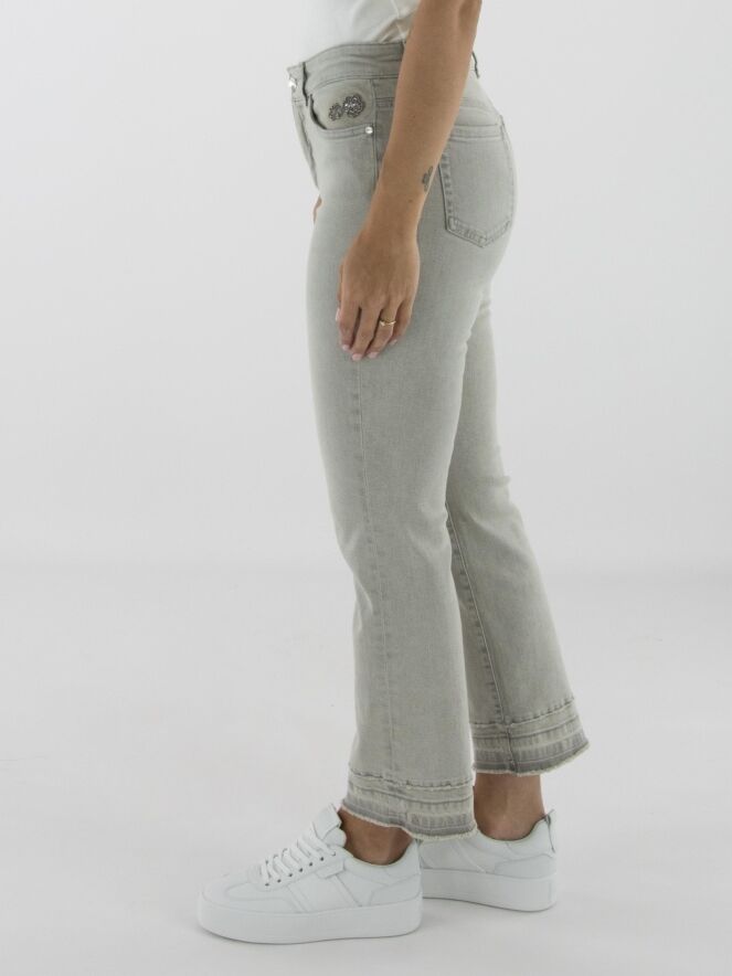 Een jeans van Marc Cain in een lichtgrijze kleur. De jeans is uitgevoerd in een 5-pocket model. Bij de linkerzak aan de voorkant bevindt zich een detail van strassteentjes in de vorm van twee bloemen. Aan de onderkant van de pijpen loopt, circa tien centimeter boven de fijn gerafelde zoom, een stiknaad waarlangs de stof subtiel is gerafeld. Deze broek kan op 30 graden worden gewassen.