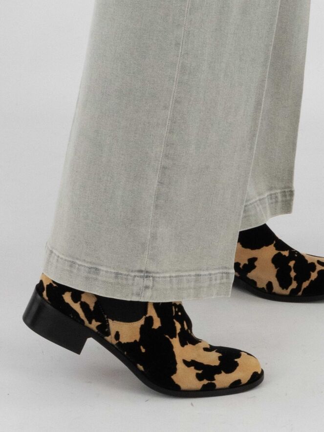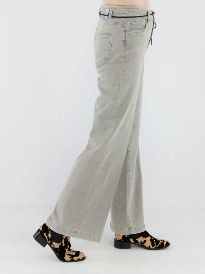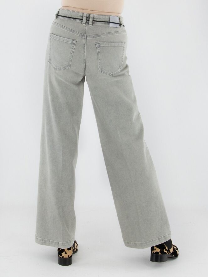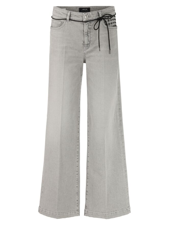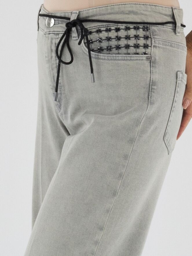 Een wijde jeans van Marc Cain in lichtgrijs. De jeans is uitgevoerd in een 5-pocketmodel met in het midden van de pijpen een ingestreken plooi. Boven de linkerzak bevindt zich een ruitpatroon in zwart stiksel, versierd met decoratieve strassteentjes in de vorm van bloemetjes. Deze jeans mag op 30 graden worden gewassen.