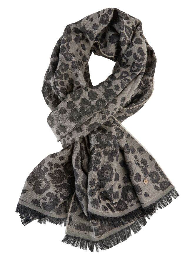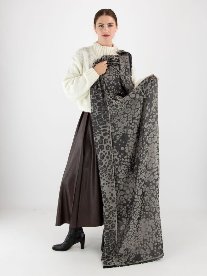 Een luxe shawl van Marc Cain in een panterprint met meerdere tinten donkergrijs op een grijze achtergrond. De uiteinden van de shawl zijn fijn gerafeld in zwart. Deze shawl mag met de hand worden gewassen.