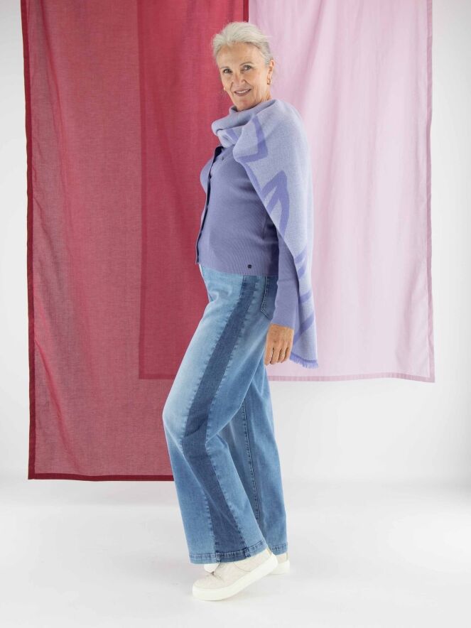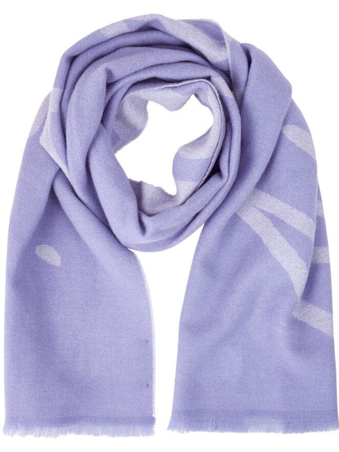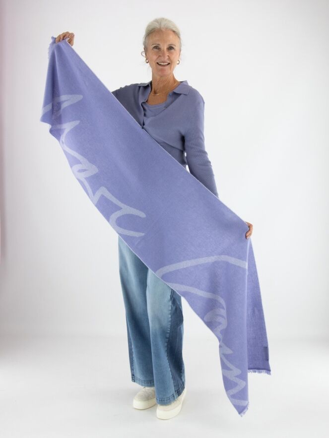 Een shawl van Marc Cain in de kleur lila. In de shawl is de tekst “MARC CAIN” verwerkt. De uiteinden van de shawl zijn fijn gerafeld. Deze shawl mag op de hand worden gewassen.