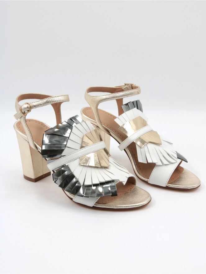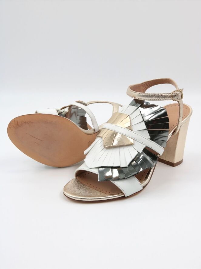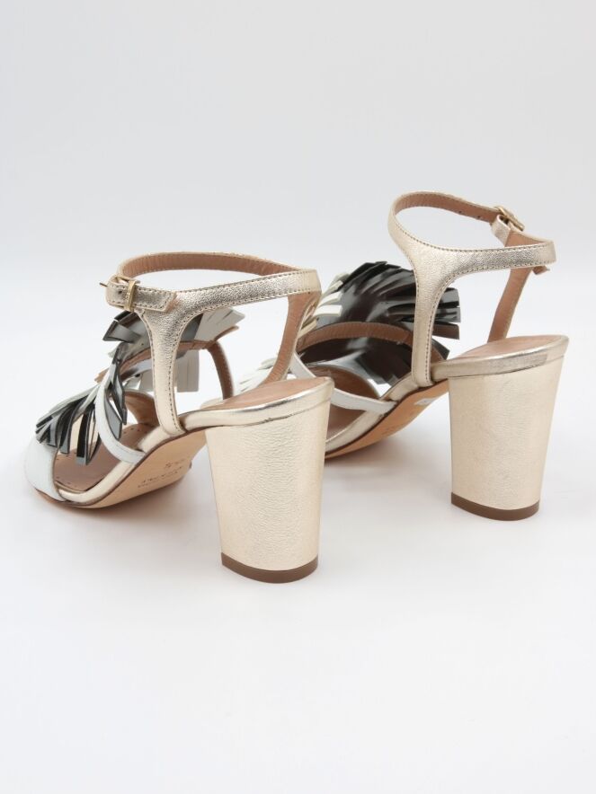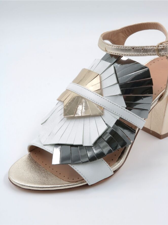 Een sandaal van Marc Ellis in de kleur Canna di Fucile. Over de voorvoet liggen drie lagen uitgesneden leder in de kleuren roomwit, platina en brons, met daaroverheen een roomwit biesje. Het enkelbandje is verstelbaar.