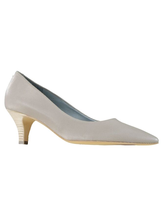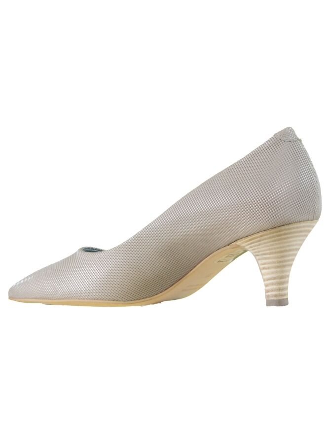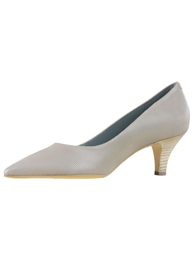 Een pump van het merk Maripé in de kleur beige metallic. Het leder is in een fijn reliëf structuur uitgevoerd. De pump heeft een spitse neus en is aan de binnenzijde gevoerd.