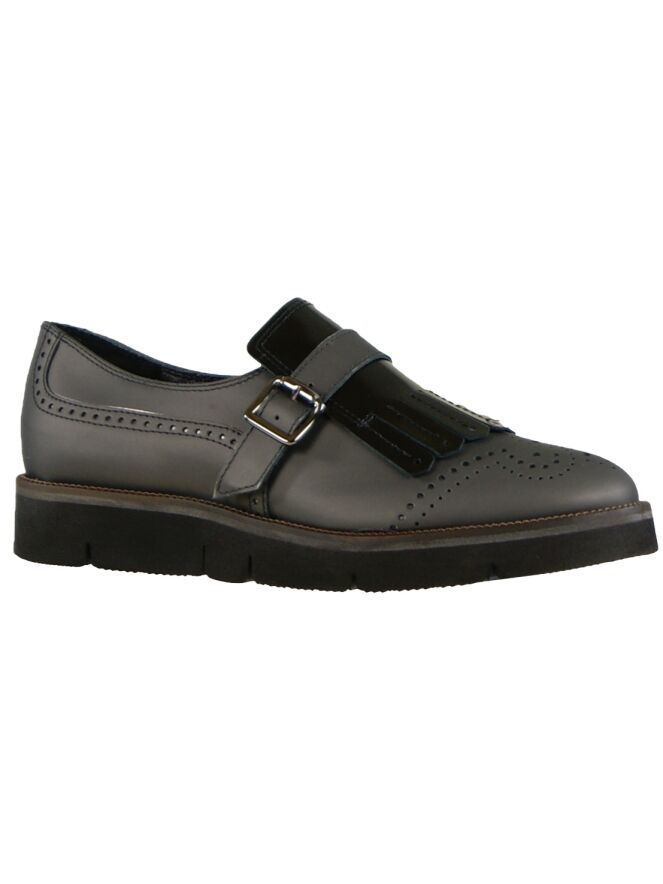 Een sneaker van het merk Maripé in een mat zwarte kleur met een taupe ondergrond in het leder. De voorvoet is in een brooks dessin met een jamboree klep in zwart spaziolate leder. over de voorvoet is een gesp.De binnenkant van de sneaker is met leder gevoerd.