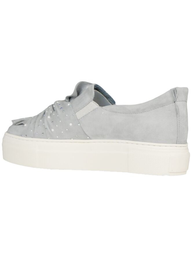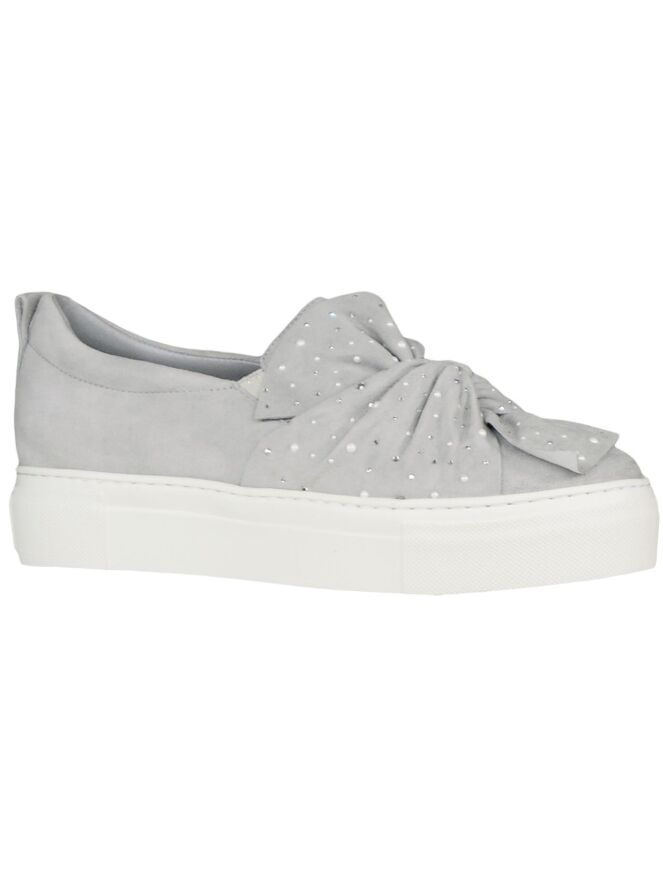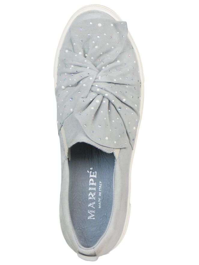 Een instapper van het merk Maripé in een licht grijze kleur. Over de voorvoet is een strik in het suède en is het suède met zilver kleurige pareltjes en stras steentjes gedecoreerd. De binnenkant van de instapper is met leder bekleed en de binnenzool is uitneembaar.