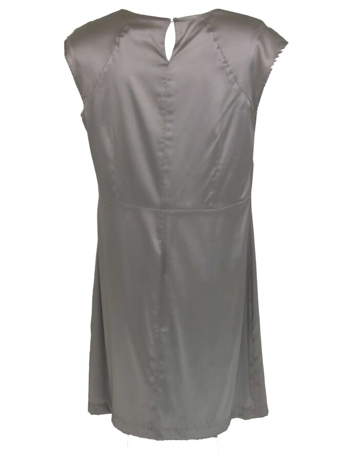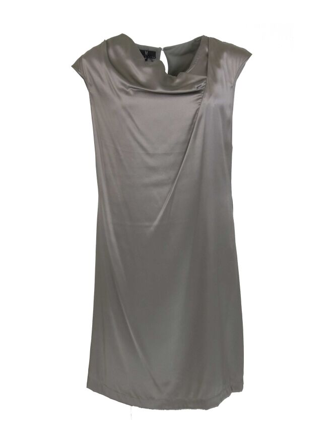 Een mat satijnen jurk van Mart visser in de kleur grijs. De jurk heeft een vallende hals en is gevoerd. deze jurk mag niet worden gewassen.