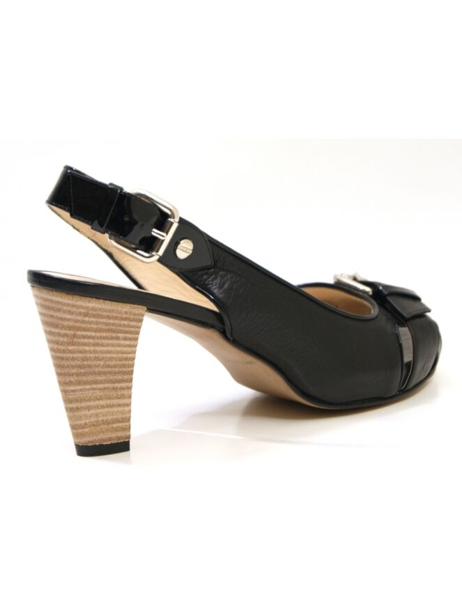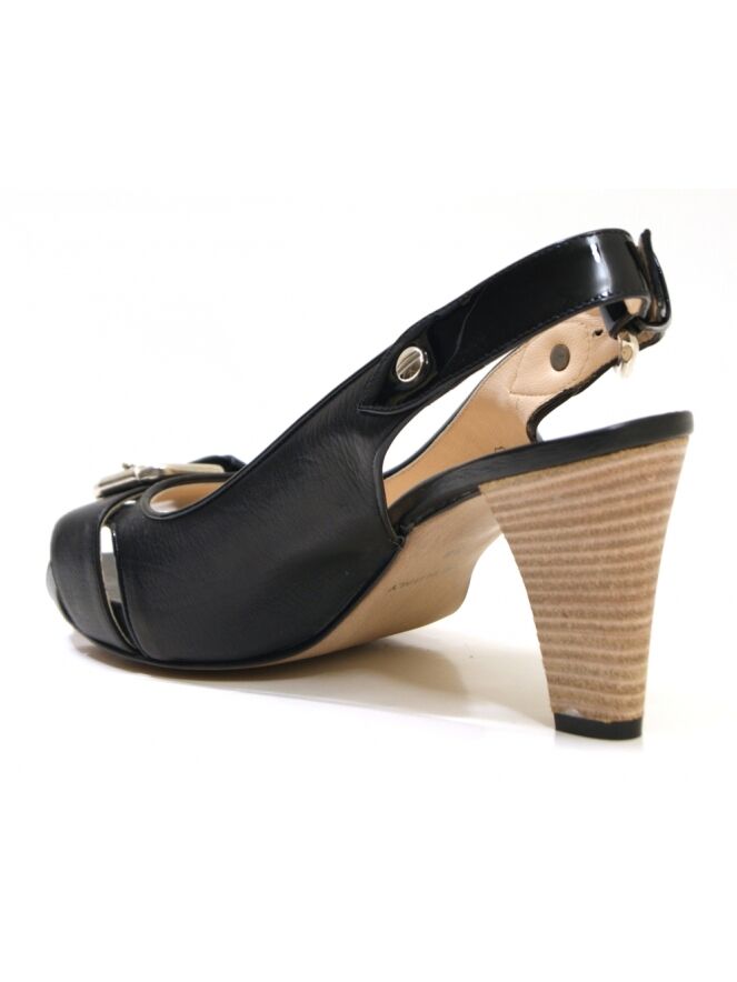 Een pump met open teen van mauro Teci in de kleur zwart. Over de voorvoet is een band met een zilver kleurige gesp. Het hielbandje is verstelbaar. De binnenkant is met leder gevoerd.